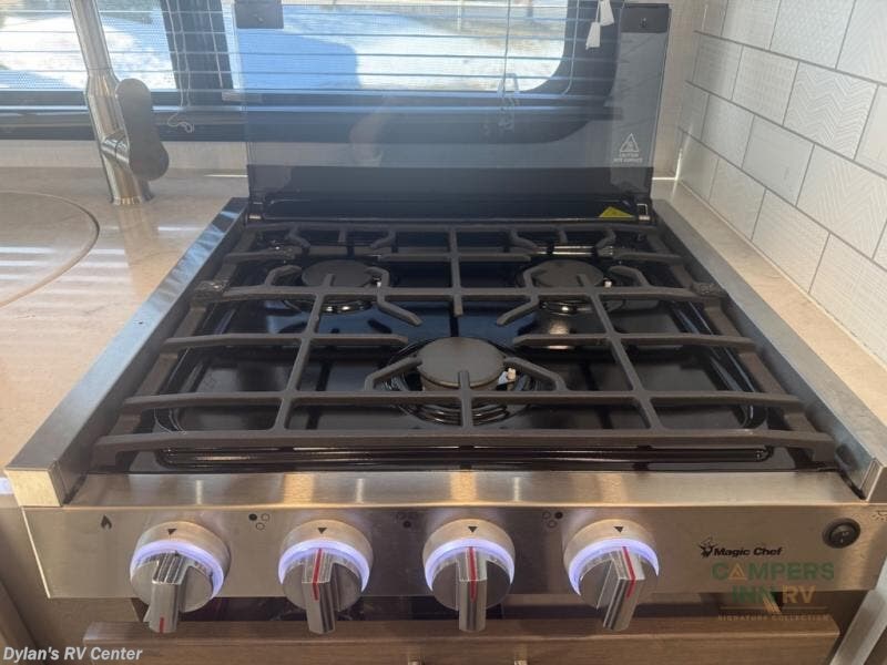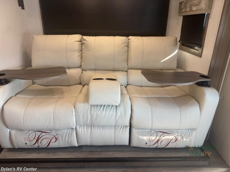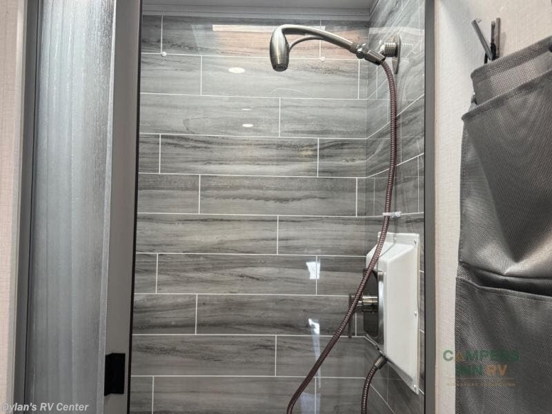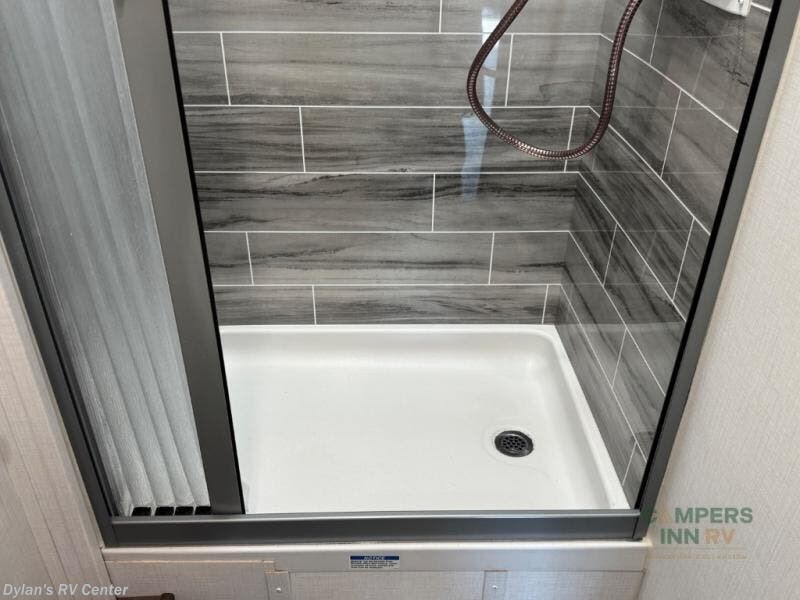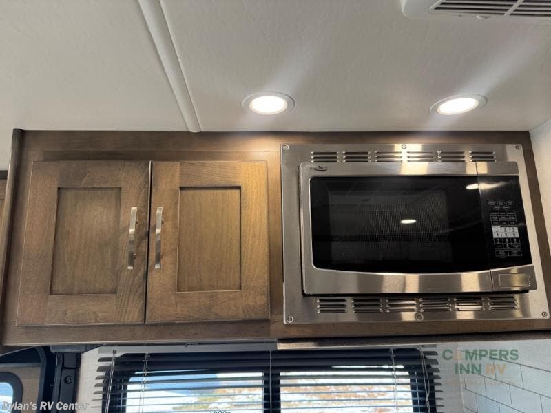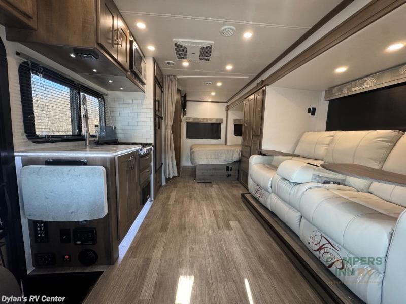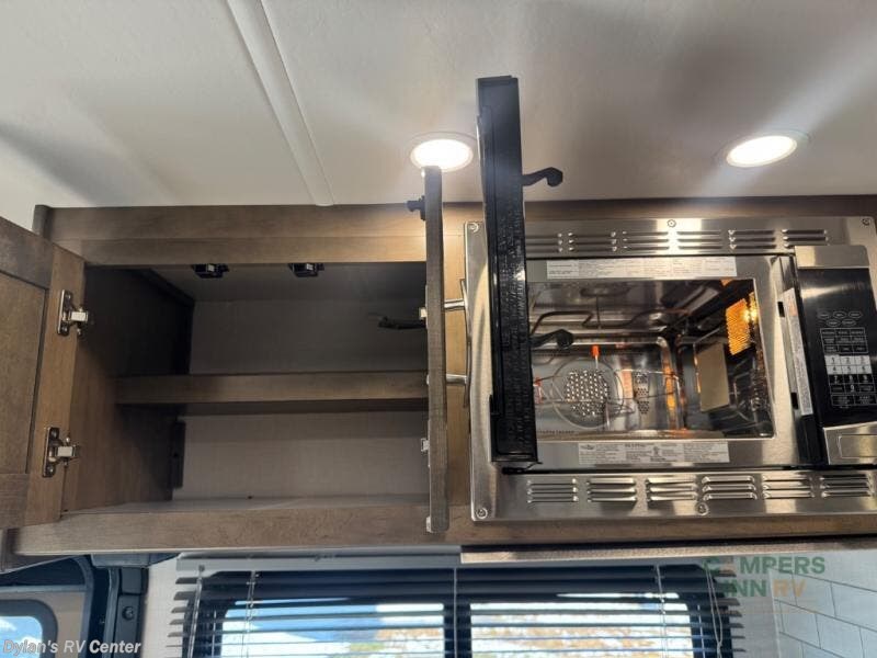 Take this motorhome on your greatest adventures yet! Start each morning feeling well rested after sleeping on the corner queen bed then head to the rear corner bathroom to freshen up in the shower with an Oxygenics body spa RV shower head and a skylight above for added headroom and natural lighting. Now that you're ready for the day, you can grab some eggs from the 6 cu. ft. double door refrigerator and fry them up on the three burner cooktop then enjoy them at the booth dinette. The kitchen also has a countertop extension for more meal prepping space and a convection microwave oven to pop a bag of popcorn before watching your favorite movies on either the living room 32" LED TV or the 32" LED smart TV across from the bed. You could even switch things up by replacing the booth dinette with an optional 3-seat power recliner, and adding a cab over bunk option!
