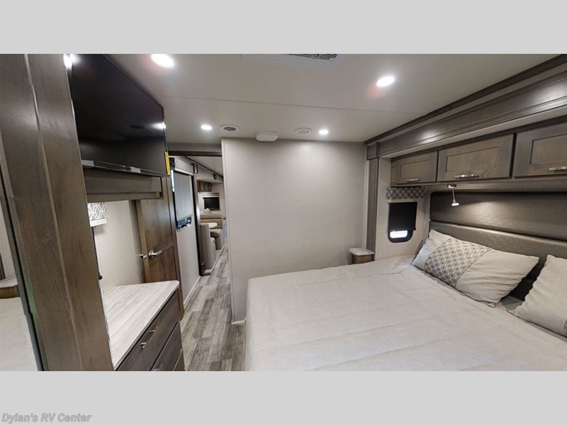 If you want a spacious and luxurious getaway, then you need this motorhome! The rear private bedroom has a gel-infused memory foam 71" x 78" king bed slide to relax on while you watch a movie with the 32" LED smart TV, as well as two wardrobes to keep your clothes looking their best. The chef can whip up their best home cooked meals with the three burner gas range, the 16 cu. ft. residential refrigerator with ice maker, and the countertop extension or you can simply throw some leftovers into the convection microwave and enjoy it at the booth dinette. The bunk over cab offers a comfortable sleeping space, and the sofa can also transform into an extra sleeping space or you can switch it out for the optional theater seating instead. Store all of your outdoor gear in the exterior seamless rotocast storage compartments with LED lighting, watch the big game with the exterior 32" TV, and stay protected by the 16' dual-pitch armless awning!
