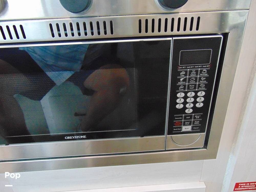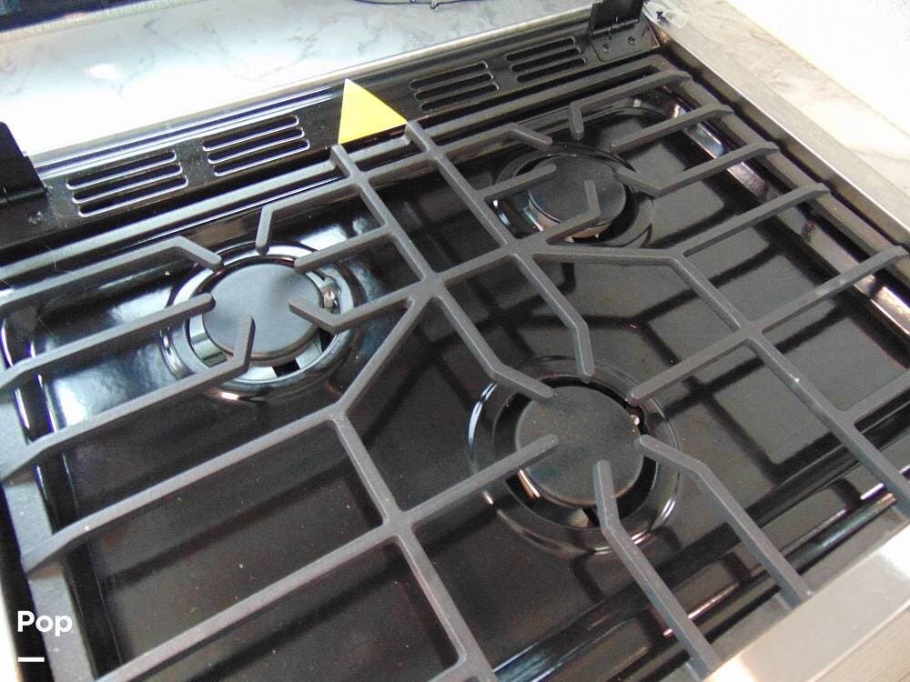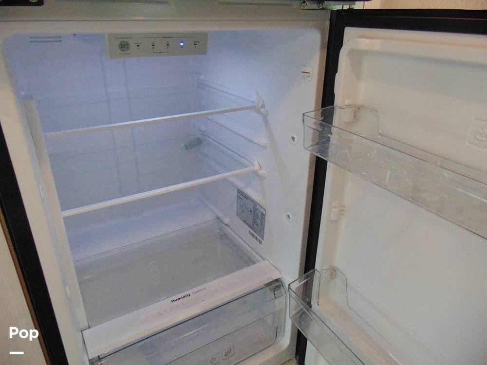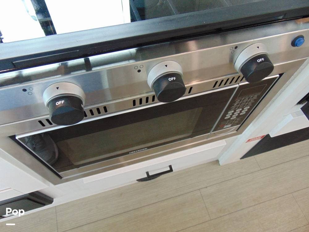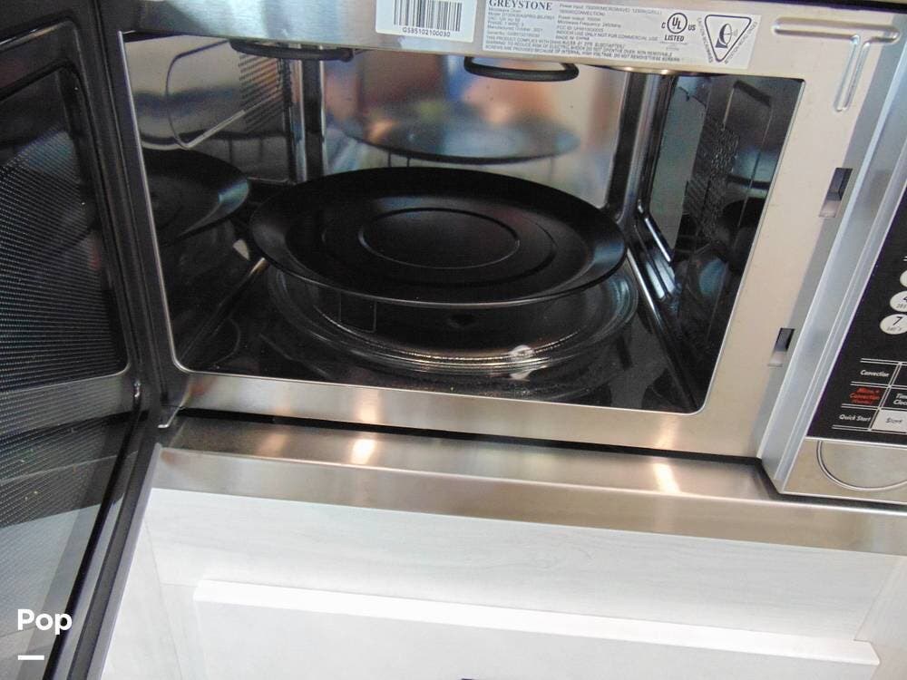 The galley has a three-burner cooktop, a microwave, a deep stainless steel sink, and a large refrigerator/freezer. There's lots of cupboard space and with the flip-up counter extension, there's plenty of room to work as well.
