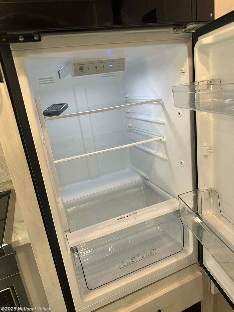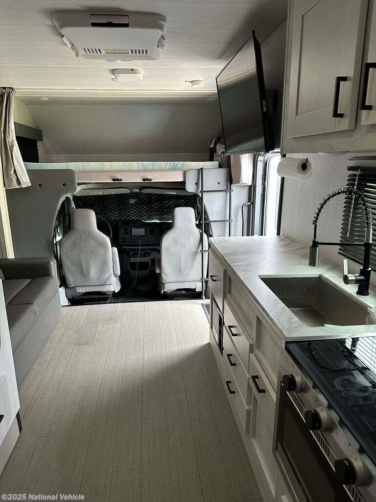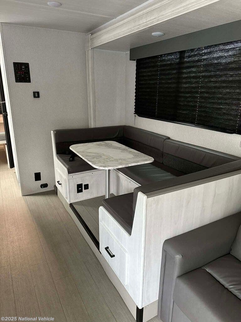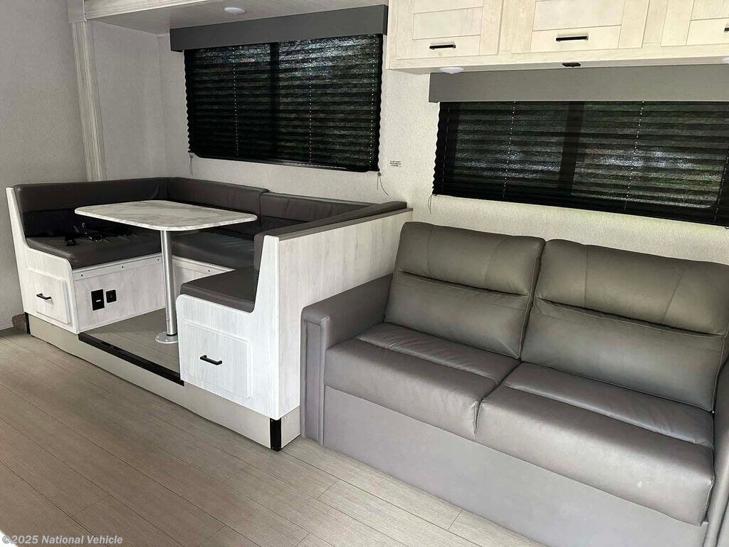 Inside, you?ll find a thoughtfully designed interior with a spacious slide-out that expands the main living area. The front cab seamlessly integrates with the living space, featuring swivel captain?s chairs, a comfortable sofa, and a dinette for dining, games, or working on the road. Large windows and smart lighting create an open, inviting atmosphere throughout the coach.