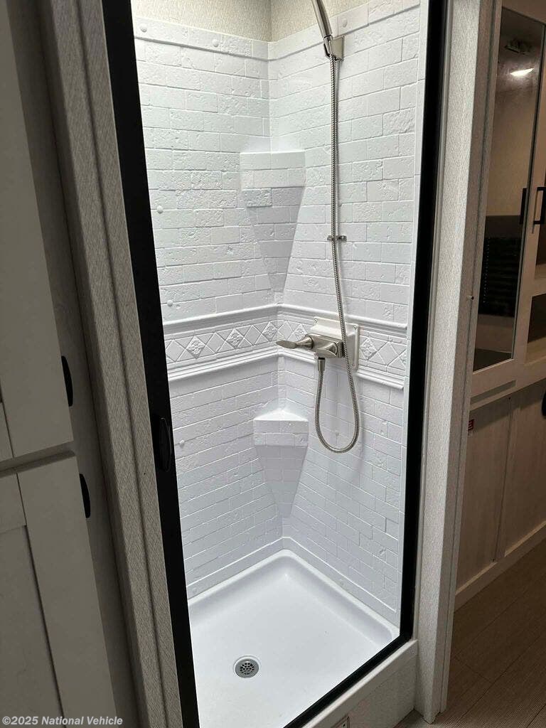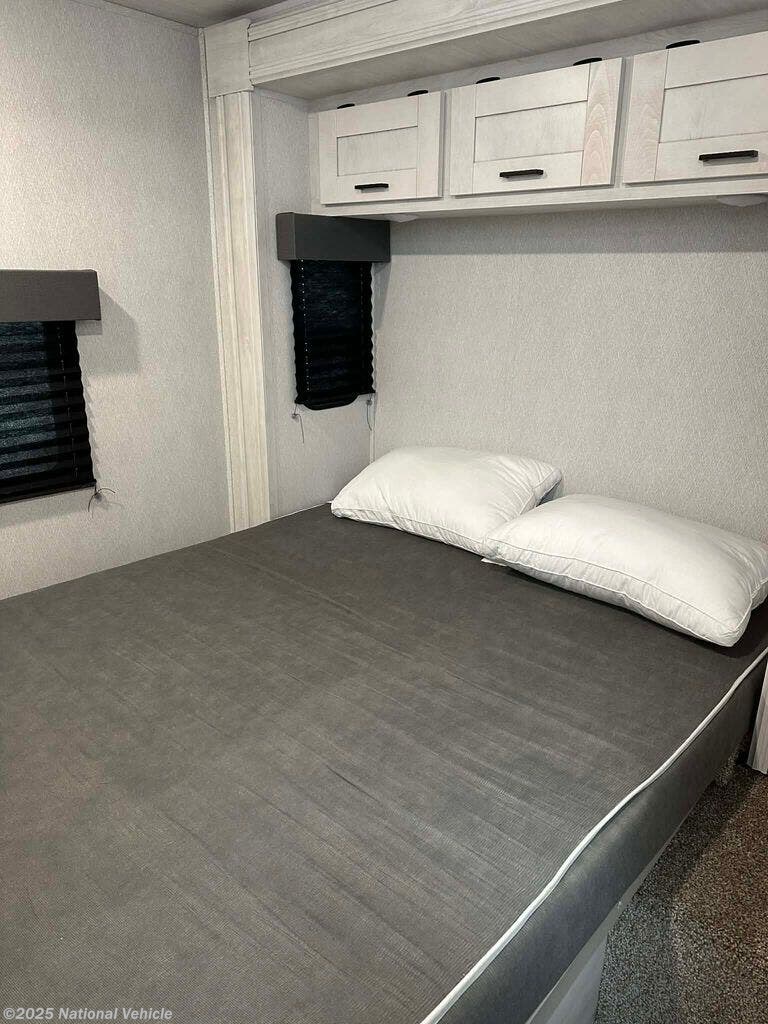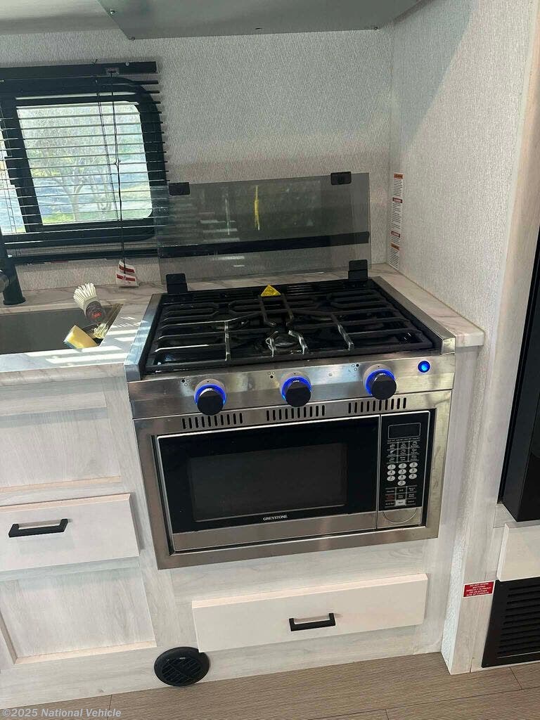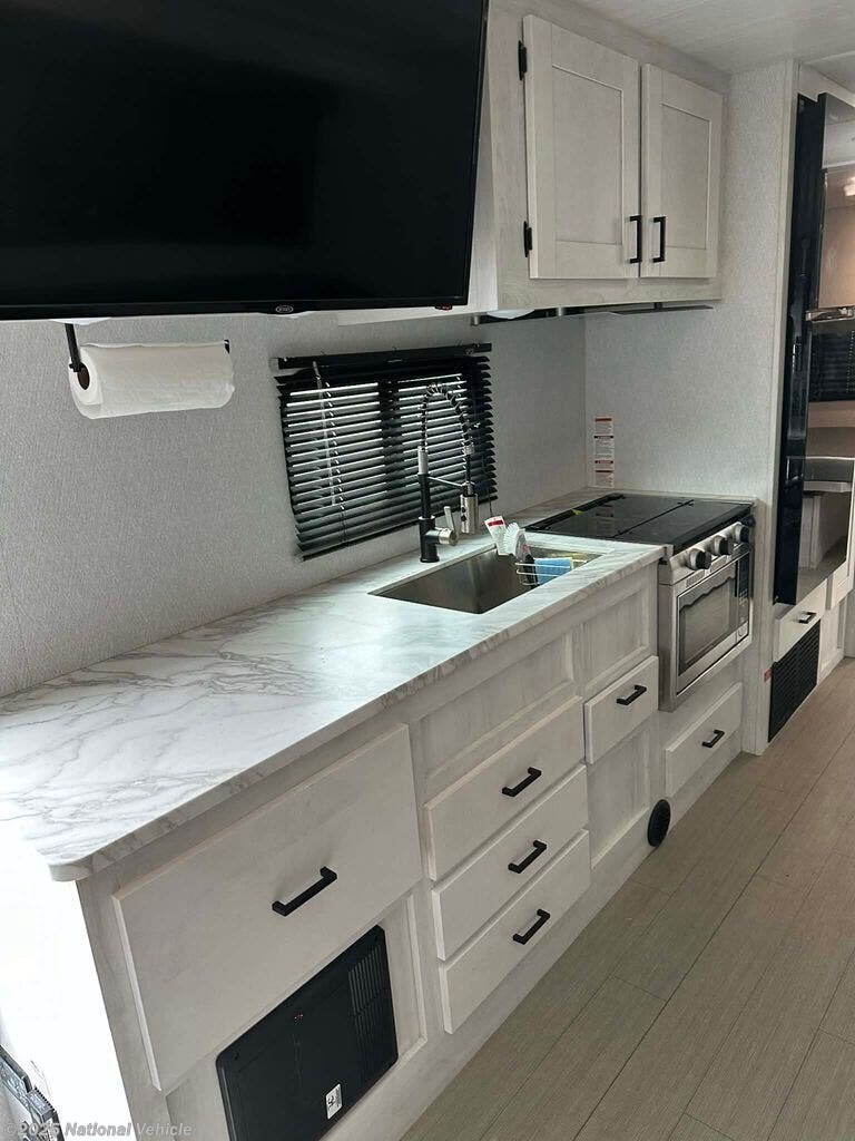 The fully equipped kitchen includes a three-burner cooktop, oven, microwave, refrigerator, double sink, and ample cabinetry, making meal prep easy and enjoyable. The rear bedroom offers a private retreat with a walk-around bed and wardrobe storage, while the mid-ship bathroom includes a shower, vanity, and toilet, providing all the conveniences of home while traveling.