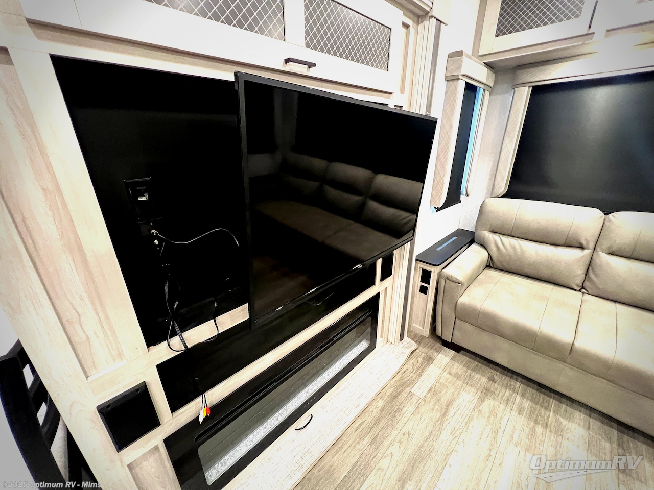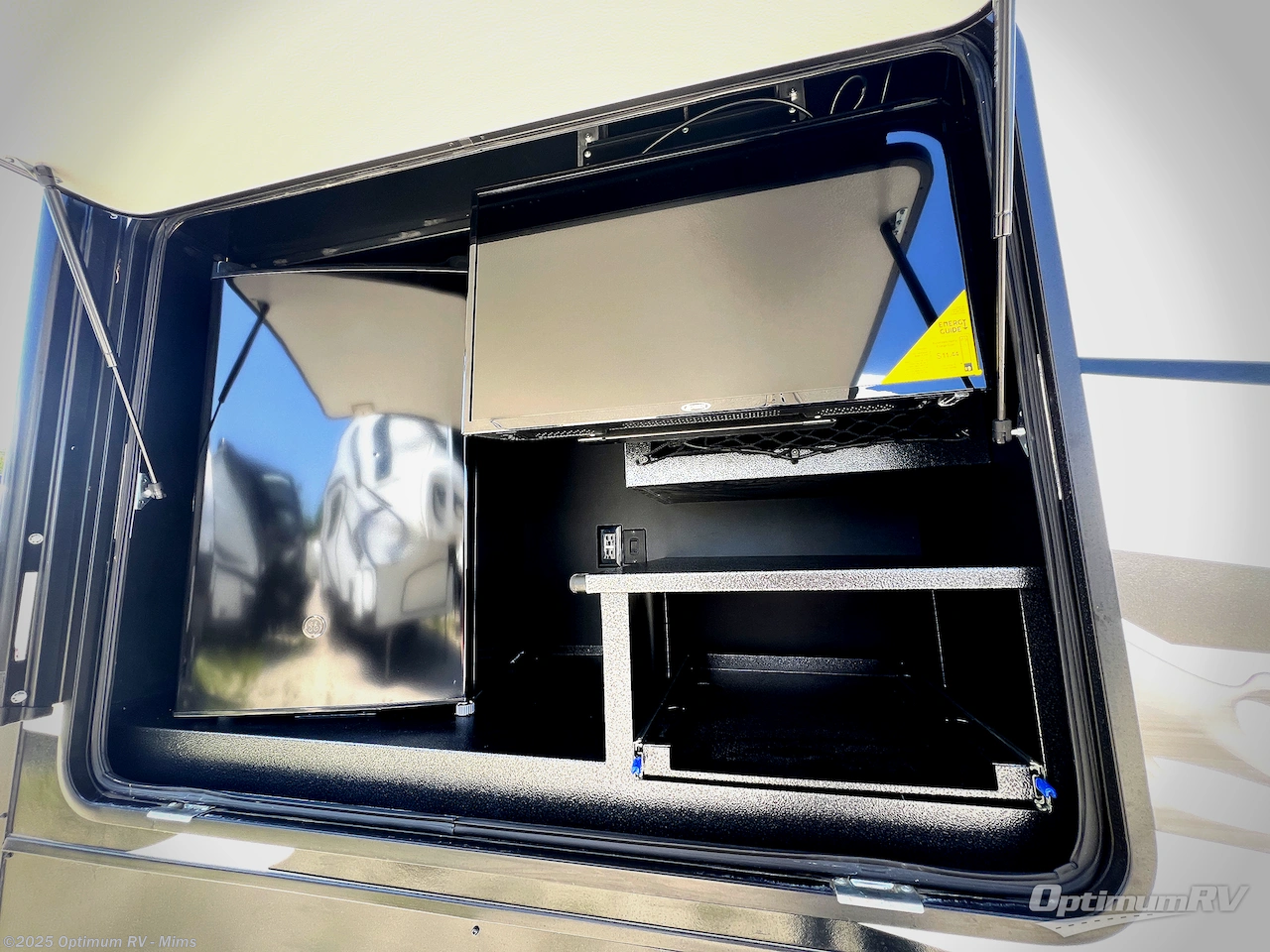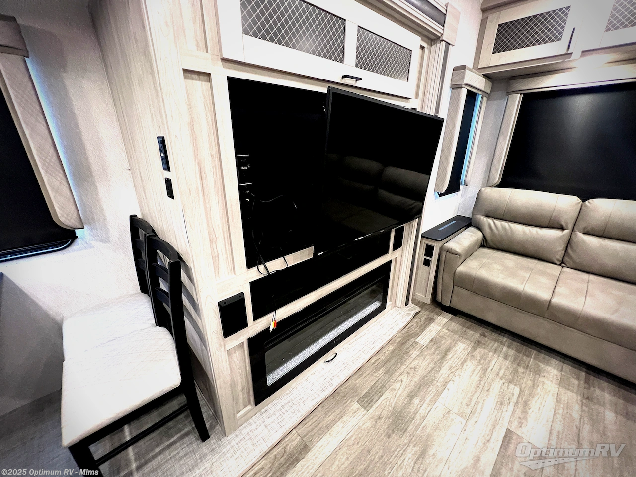 It's time to head out with this Tandara fifth wheel! You won't feel any loss of luxury when you transition from your home to this unit. There is a front master suite that allows you to privately enter the dual-entry bathroom in the morning when you need to take a shower. You'll also find a king bed slide across from a dresser with preparations for a TV, and the under-bed storage gives you a place to put your extra sweaters and boots. If you have anyone staying the night with you, they can use the hide-a-bed sofa, and you can sit up chatting with them on the theater seating. Switch on the 50" LED TV and fireplace to make it a fun evening, and grab some snacks from the double-door pantry to make it even more fun.