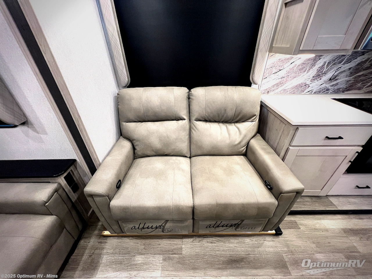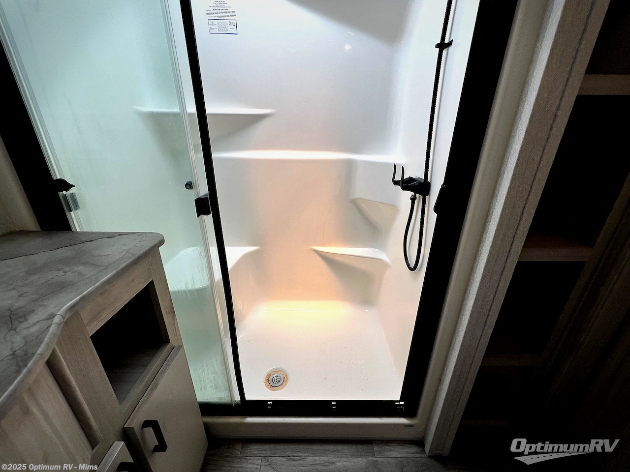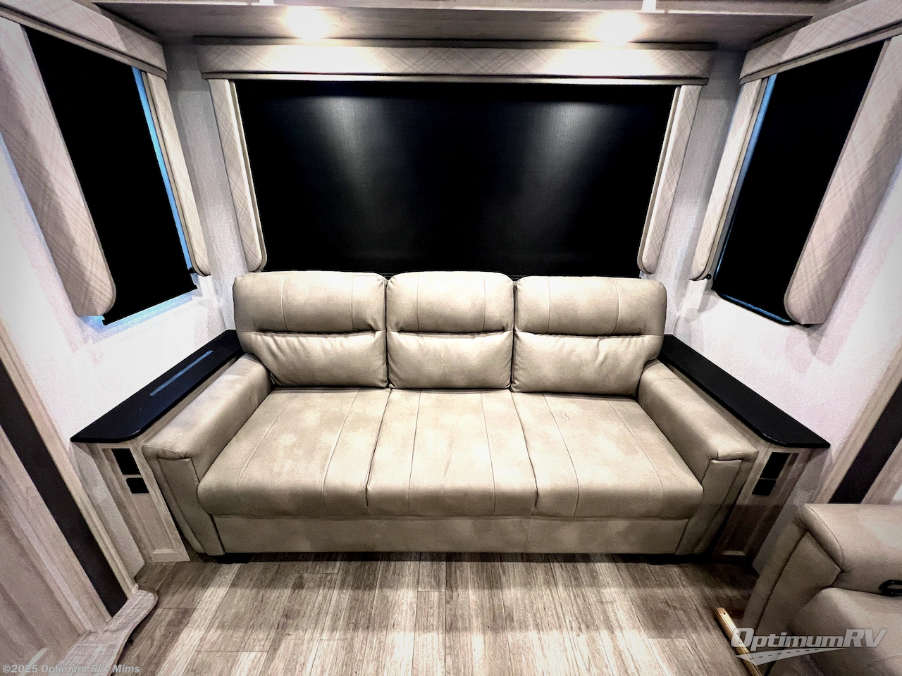It's time to head out with this Tandara fifth wheel! You won't feel any loss of luxury when you transition from your home to this unit. There is a front master suite that allows you to privately enter the dual-entry bathroom in the morning when you need to take a shower. You'll also find a king bed slide across from a dresser with preparations for a TV, and the under-bed storage gives you a place to put your extra sweaters and boots. If you have anyone staying the night with you, they can use the hide-a-bed sofa, and you can sit up chatting with them on the theater seating. Switch on the 50" LED TV and fireplace to make it a fun evening, and grab some snacks from the double-door pantry to make it even more fun.