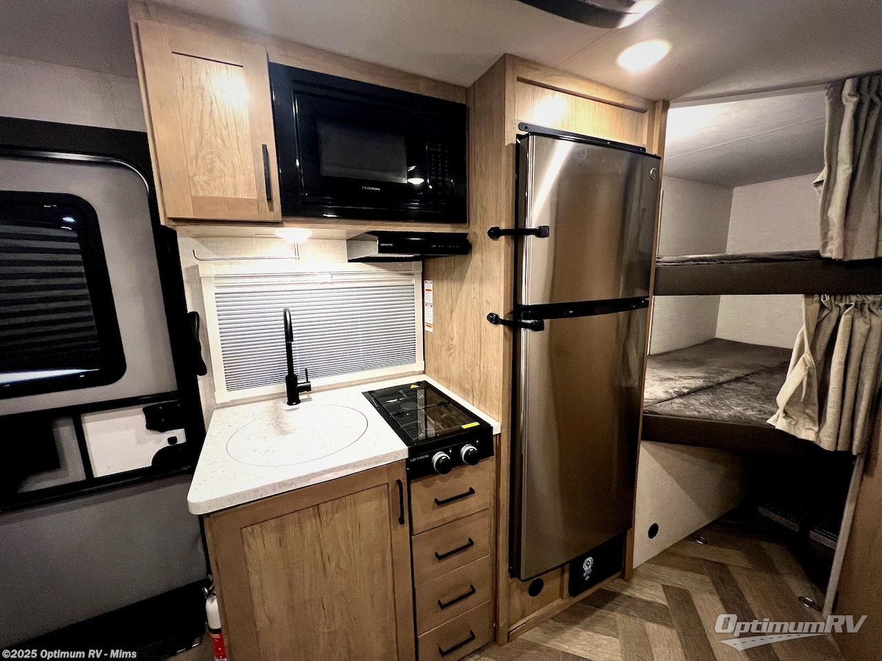 The whole gang can camp together comfortably in this travel trailer! The kids or guests can sleep on the double bunk beds with the lower bunk being able to fold for storage, and you can sleep on the front 60" x 80" Murphy bed with a "Stargazer" skylight above it to look at the beautiful stars as you drift off to sleep. The legless booth dinette slide also offers a comfortable place to sleep once converted. Everyone can get cleaned up in the rear corner bathroom with the 24" x 40" shower, and keep their bellies full with the 12V refrigerator and two burner cooktop. Plus, there is an outside kitchen with a 1.6 cu. ft. refrigerator and an optional griddle. The exterior kayak/bike storage door and exterior pass-through storage area lets you bring along the necessary gear to explore more!