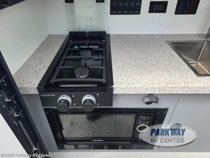 You will be so excited to test out this ROG travel trailer for yourself! The interior has great storage solutions with a front and rear recessed overhead cabinets, a storage closet with two shelves, and two storage nets for more gear. There are four LED ceiling lights to keep the interior bright, and you will appreciate two LED reading lights as you rest on the 60" x 80" futon/mattress. The rear outdoor kitchen has convenient amenities to help you eat well while you're away. You'll find a two-burner stove with cast-iron grates, a flush-mount microwave oven, a solid-surface countertop, and commercial-style faucet, plus a 12V 3.3-cubic foot refrigerator to keep your perishables nice and cold.