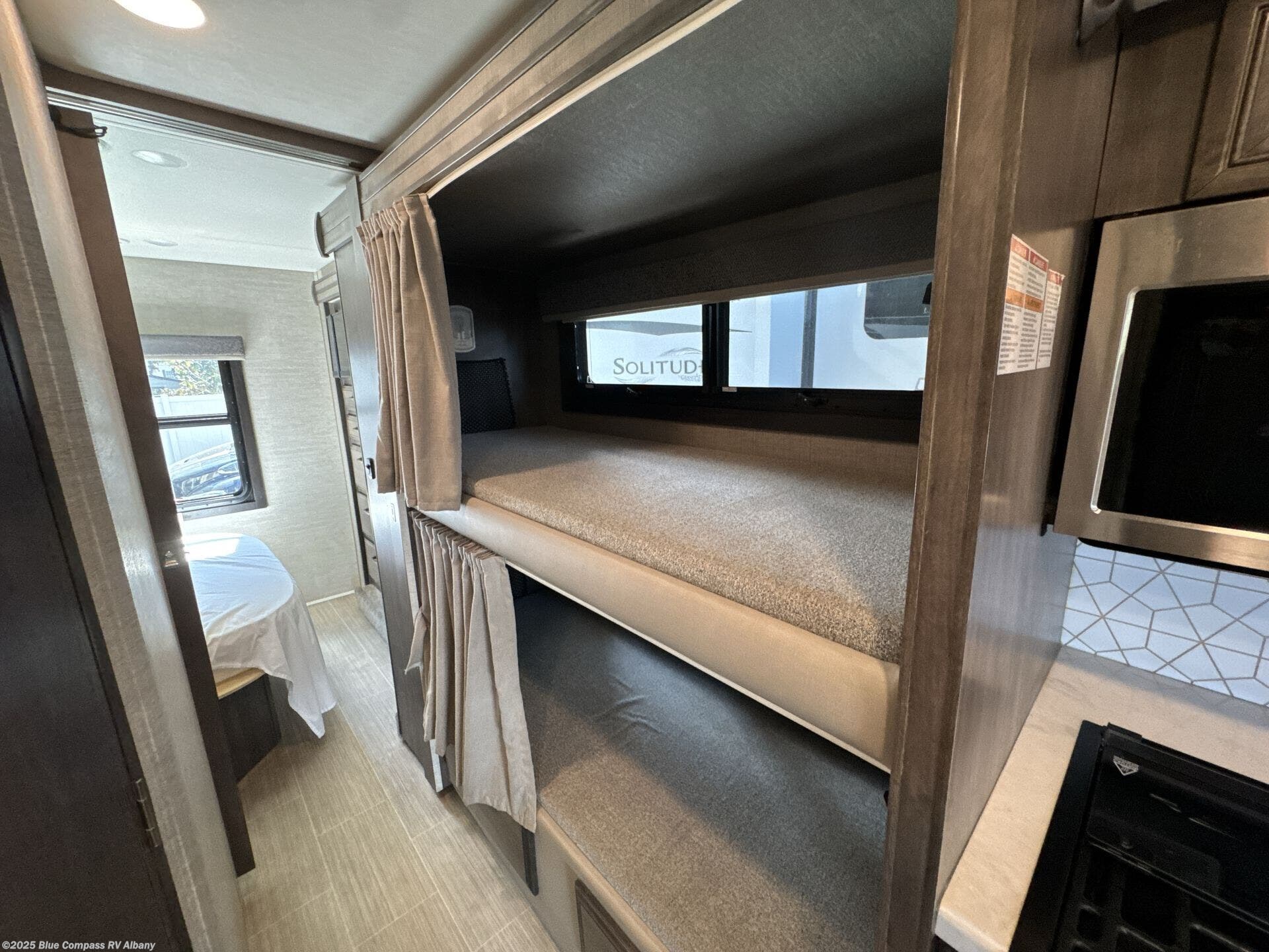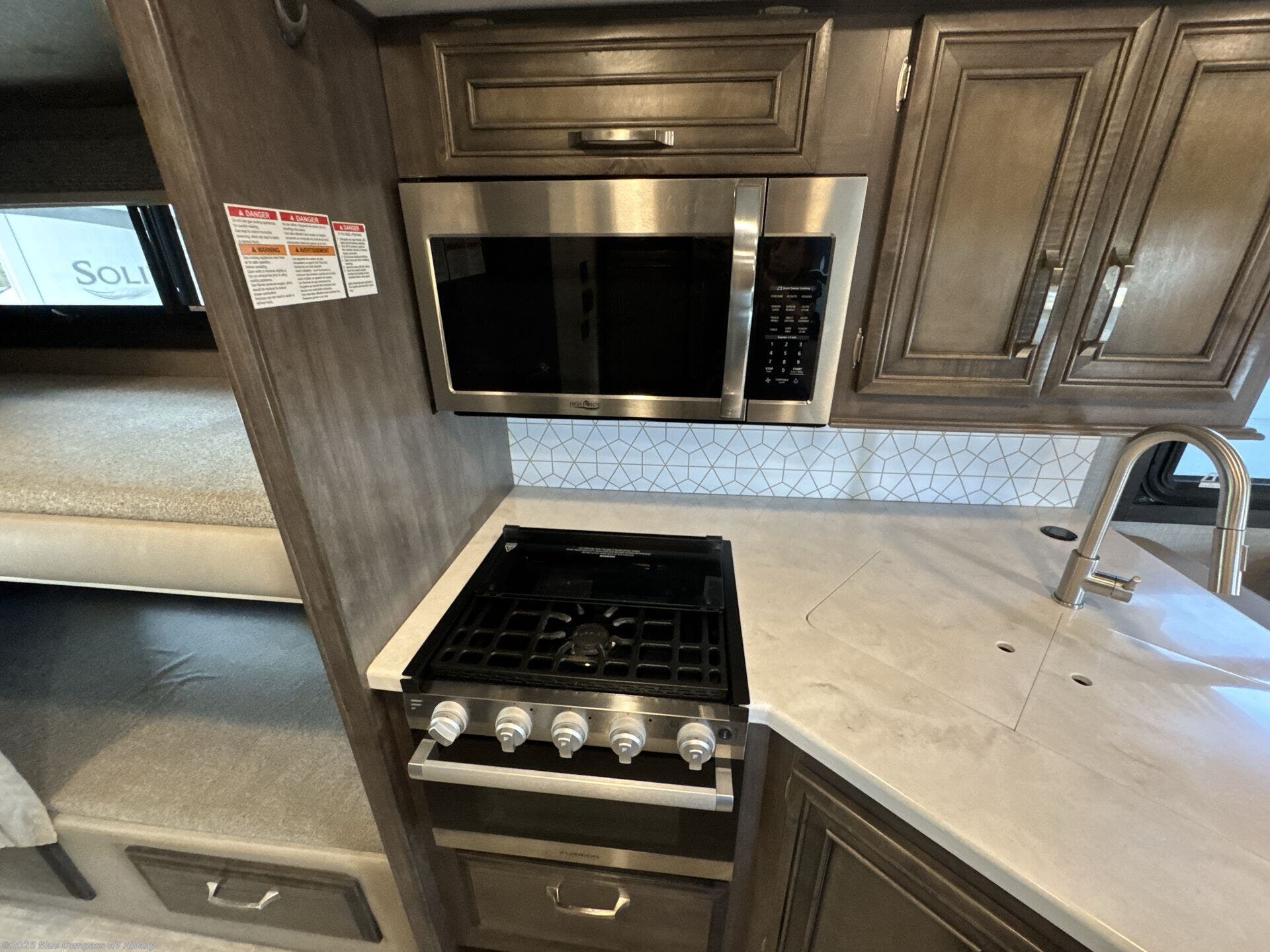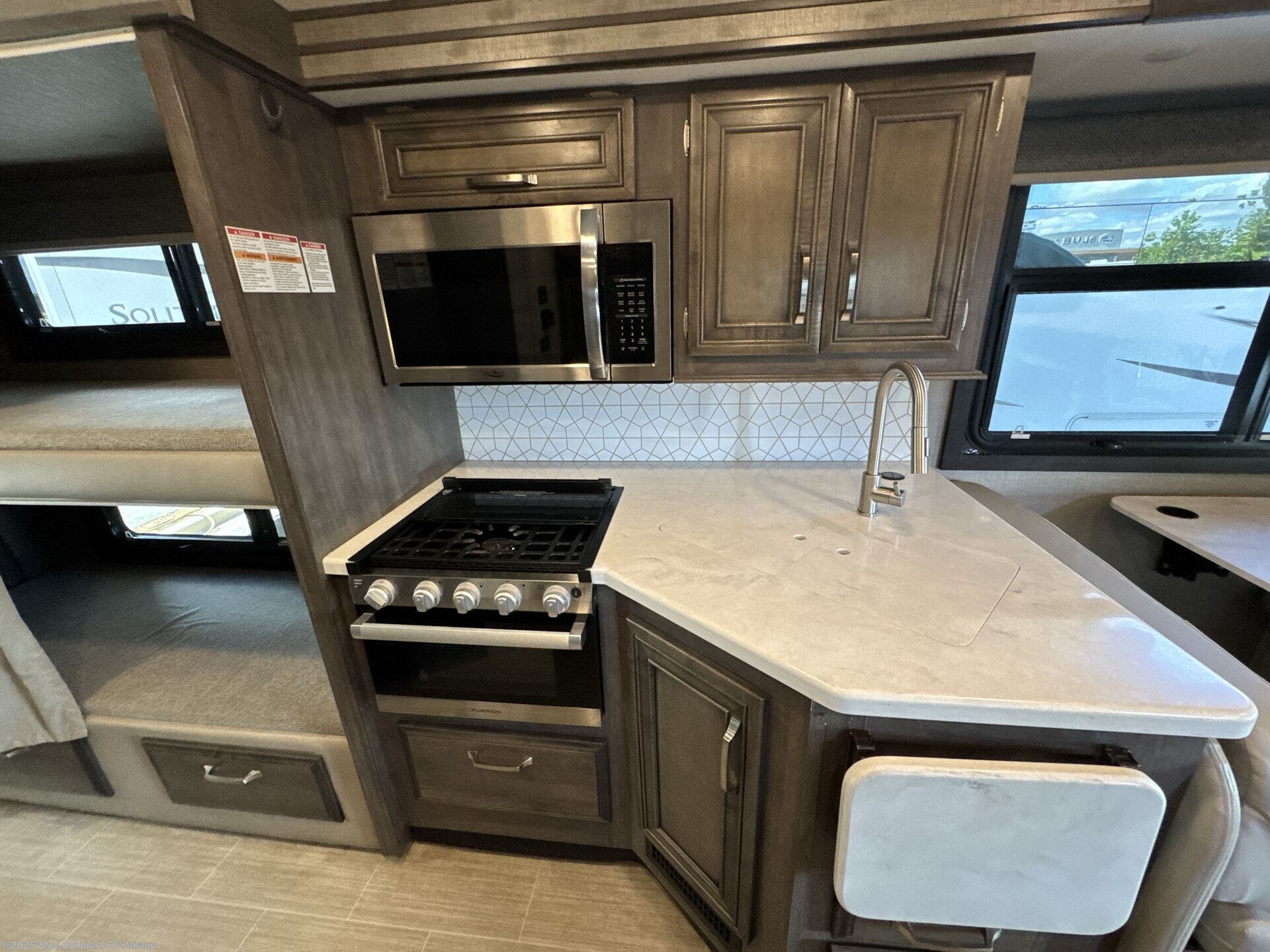 The whole family can travel together in this motorhome! The kiddos can sleep on the set of bunk beds and you can sleep on the 60" x 74" queen bed in the rear private bedroom. Everyone can easily access the dual entry bathroom to freshen up in the 32" radius shower each morning. Cook up delicious meals on the three burner cooktop, then head to the booth dinette which can also transform into an extra sleeping space. You can take an afternoon nap on the sofa or head outdoors to watch the big game at the exterior LED HD Smart TV underneath the 18' electric awning with LED lights to highlight the good times!
