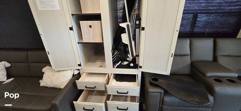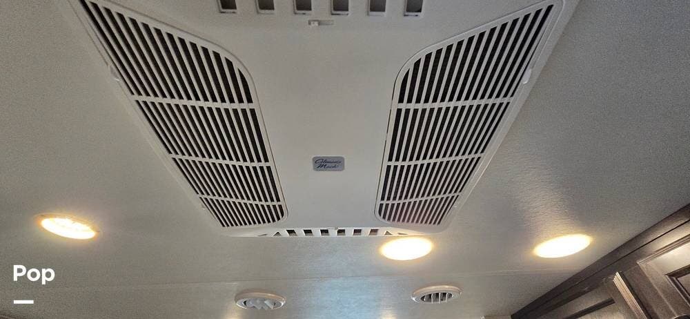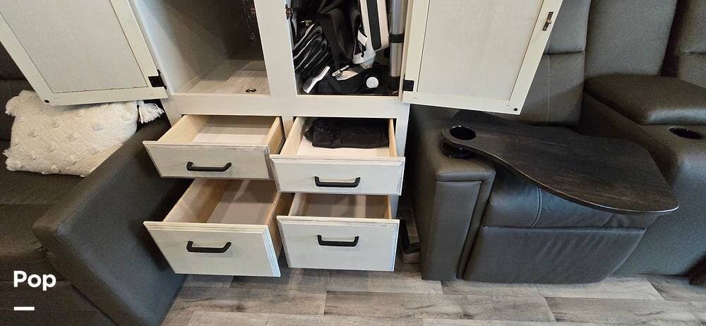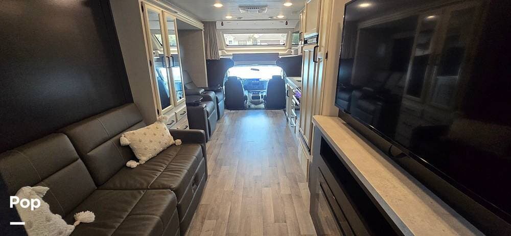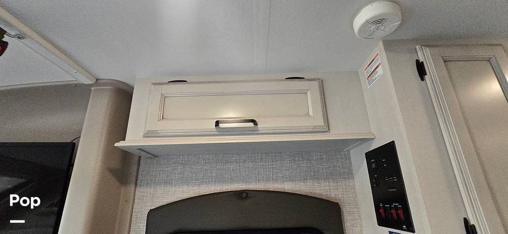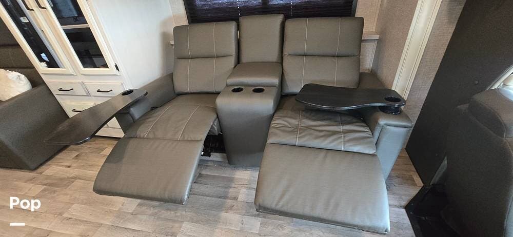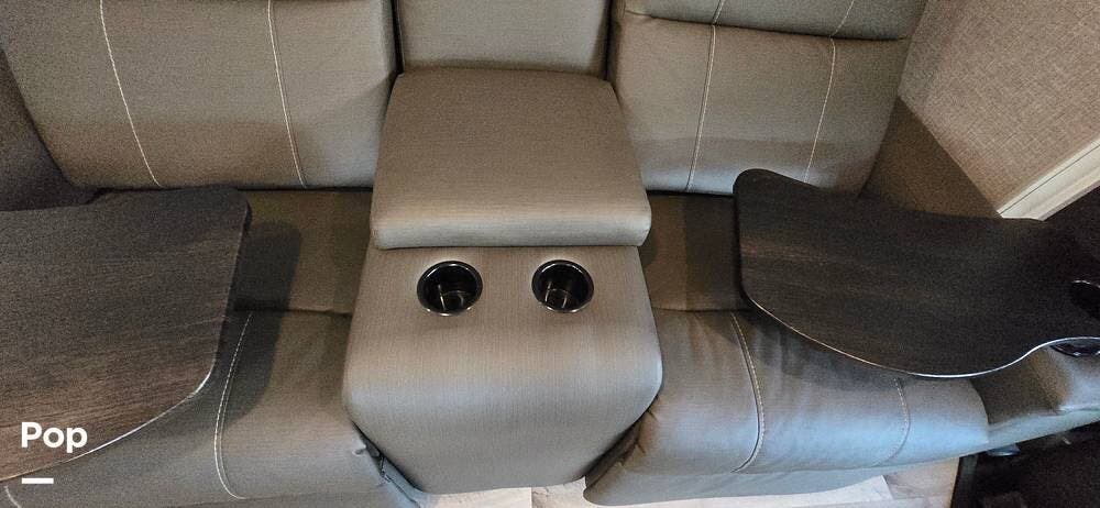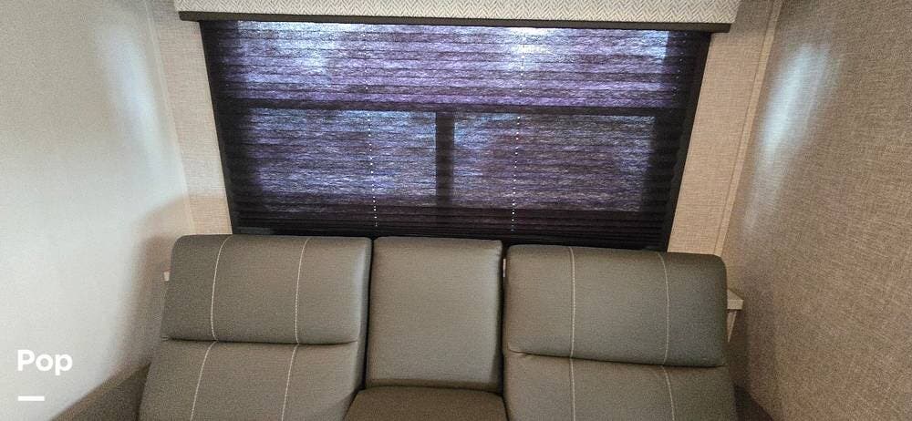 Large windows, high-intensity recessed LED lighting, and pleated blackout shades create a bright yet relaxing environment. The living area features the upgraded twin reclining theater seats with storage, a generous LED HD Smart TV, and an electric fireplace -- perfect for cozy evenings on the road. The cab-over bunk, with safety net and molded surround, offers additional sleeping space.