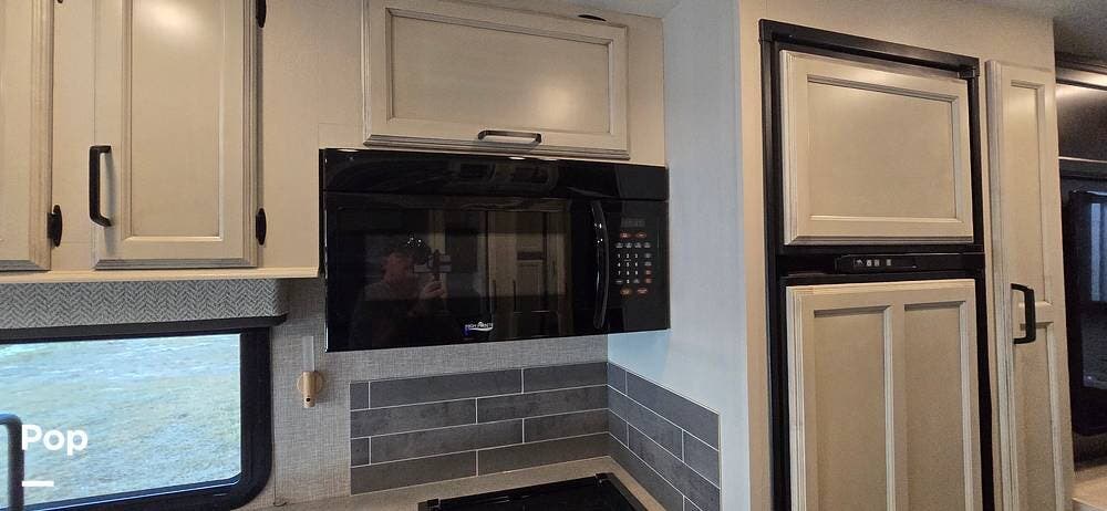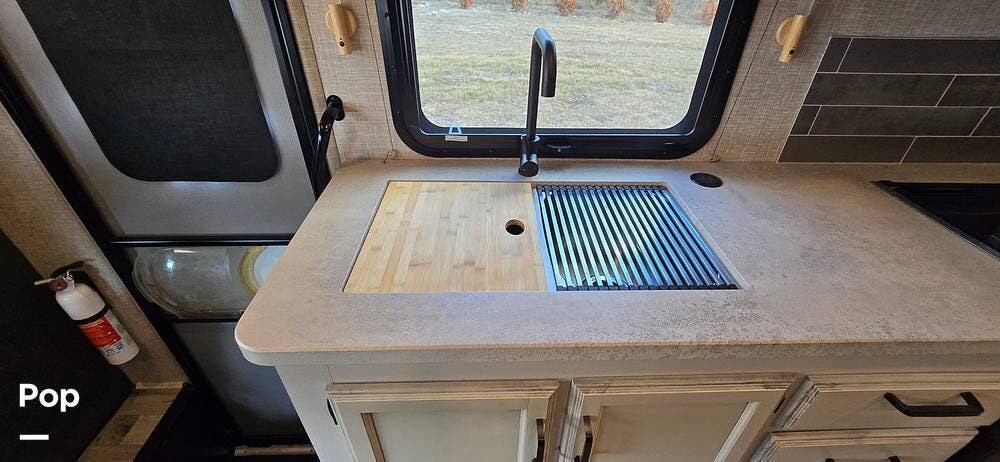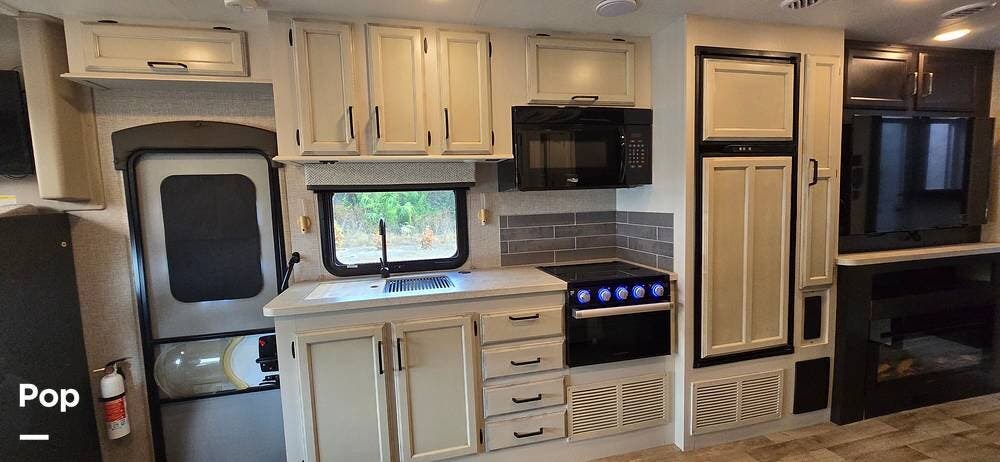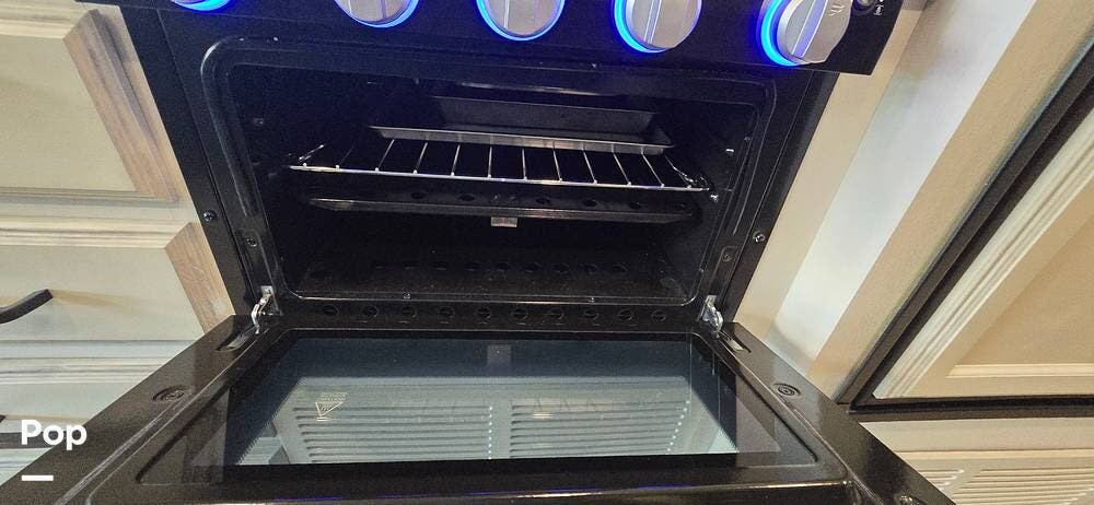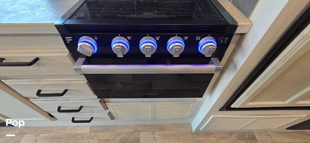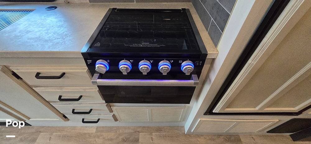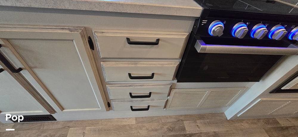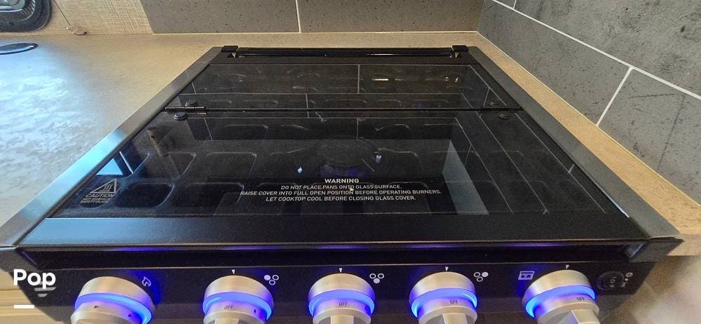 The kitchen is well-equipped with stainless steel appliances, including a Furrion 3-burner gas cooktop and oven, a residential-size high-Point microwave, a Norcold dual Power 8 cu/ft refrigerator with matching cabinet doors, LED-lit countertops, and a recessed double-bowl stainless steel sink with a cutting board cover. Storage and functionality are enhanced by ball-bearing drawer guides and a pop-up charging station with both 110 V and USB outlets -- keeping devices powered and accessible.