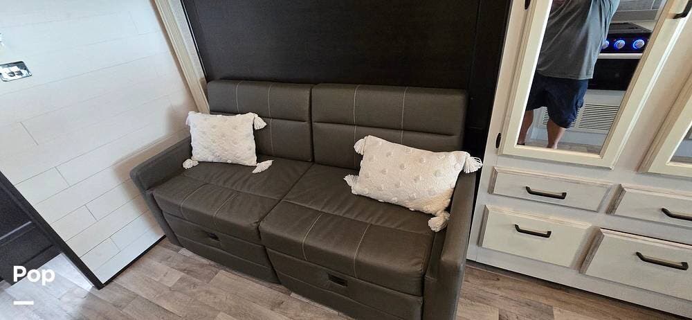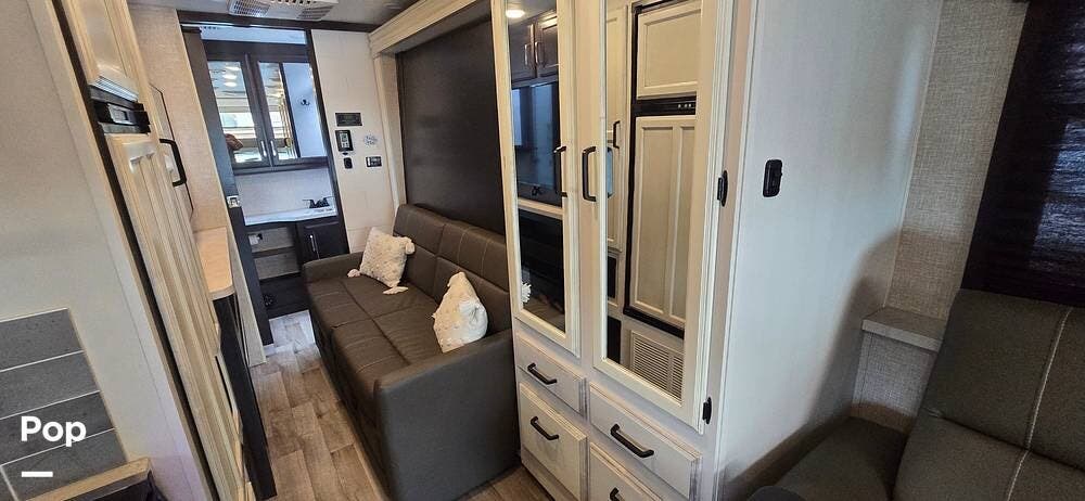 Opposite the LED TV and Fireplace Sleeping arrangements include a flexible option of a power Murphy-style queen bed, providing generous living space with a sofa by day and restful accommodations by night.