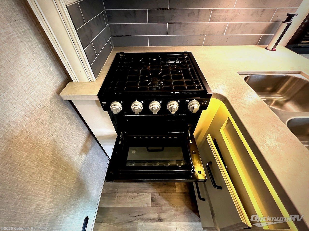 Sleep like a king after driving the scenic byways, hiking the trails and exploring the campgrounds. The rear bedroom offers a king bed slide, a wardrobe, a TV option, and a sliding door to close off the bedroom with an additional wardrobe and the corner full bathroom. The combined kitchen and living area is spacious thanks to another slide which includes a booth dinette, and kitchen amenities including a counter extension, sink, the Furrion all-in-one-cooktop and oven and a residential-size microwave. And the 8 cu. ft. refrigerator and pantry are next to the sofa so you can easily grab a beverage before sitting down. The furniture doubles as sleeping space, and the cab-over bunk is always available.