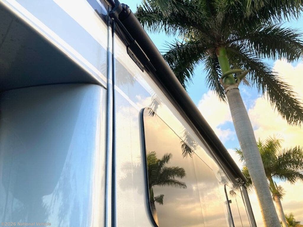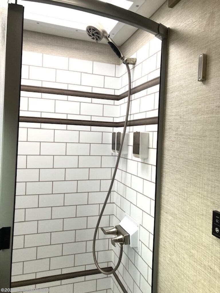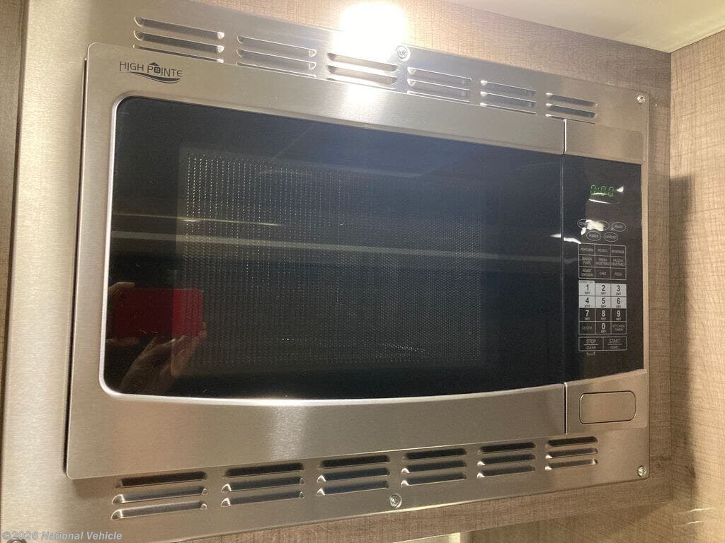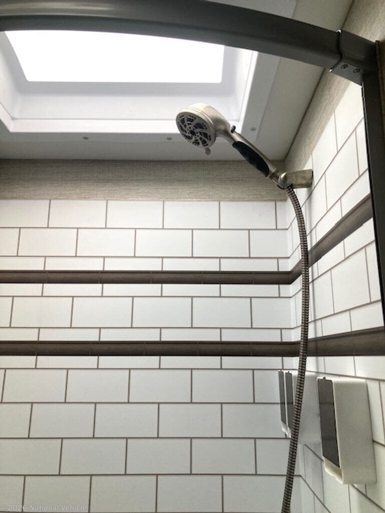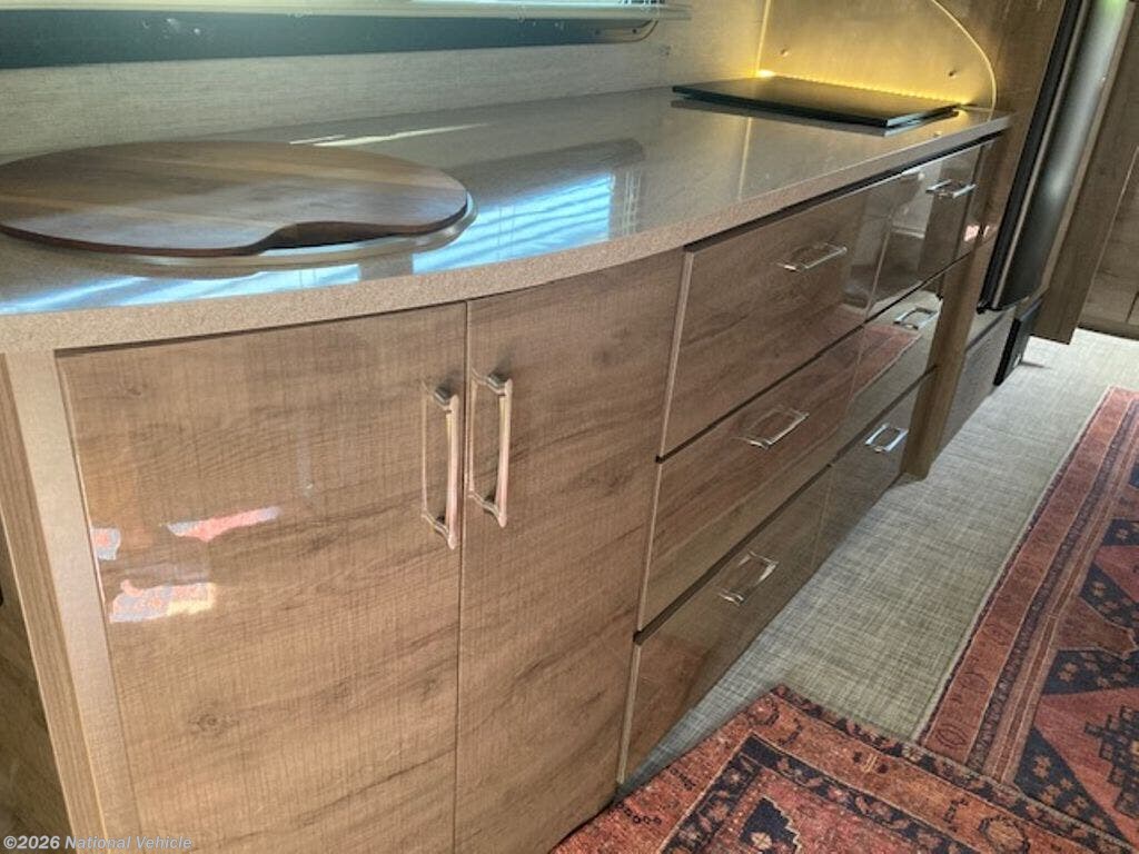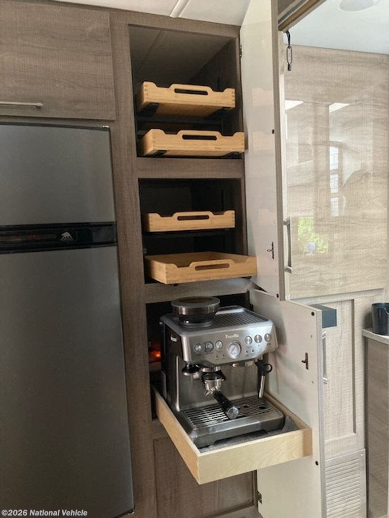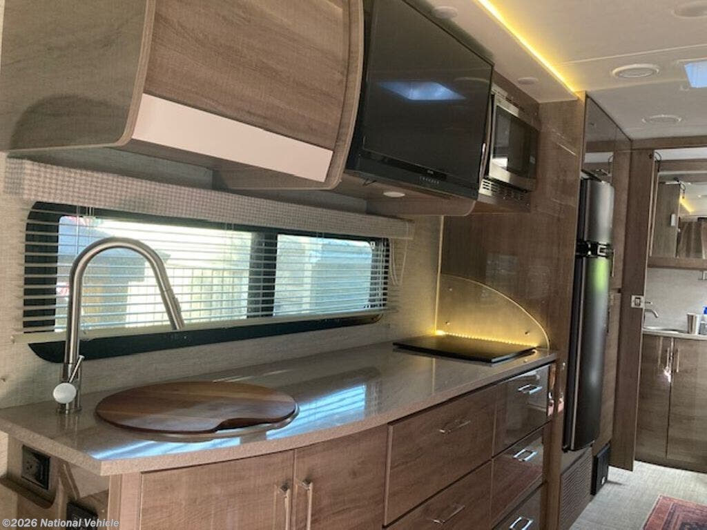Inside, the coach is beautifully appointed with solid surface countertops, a stovetop, convection microwave oven, and refrigerator/freezer. The entertainment system includes a living room TV, radio with interior and exterior speakers, and a Winegard 2.0 WiFi booster for improved connectivity on the road.
