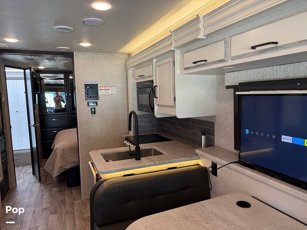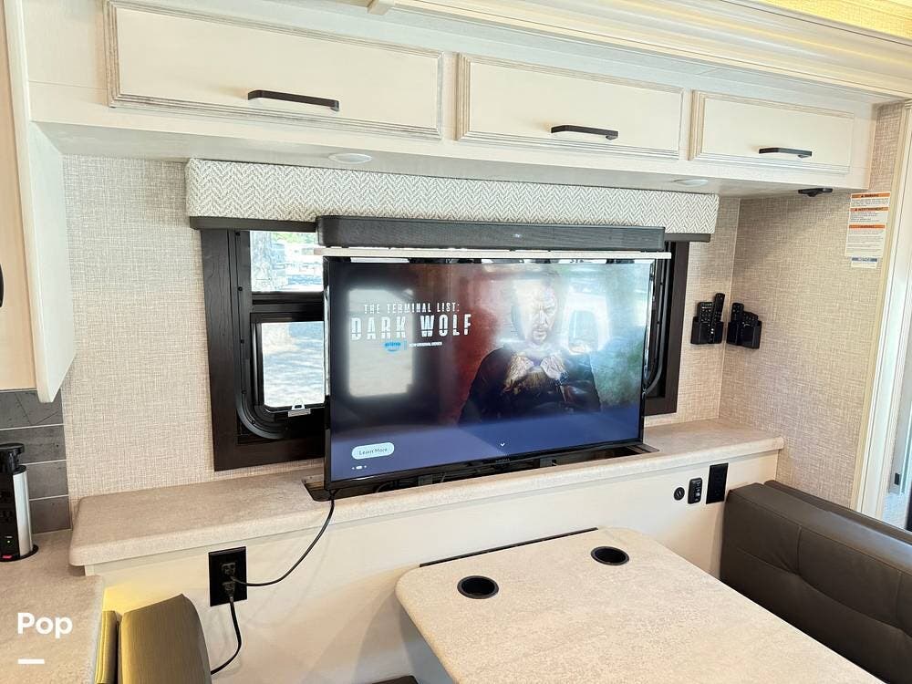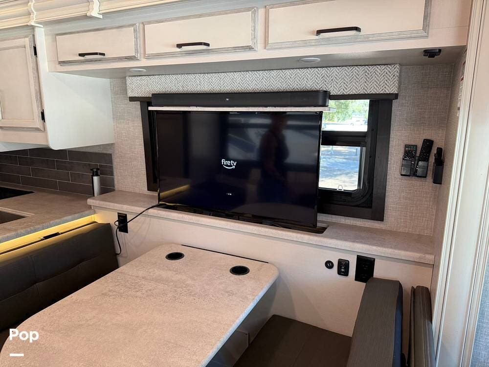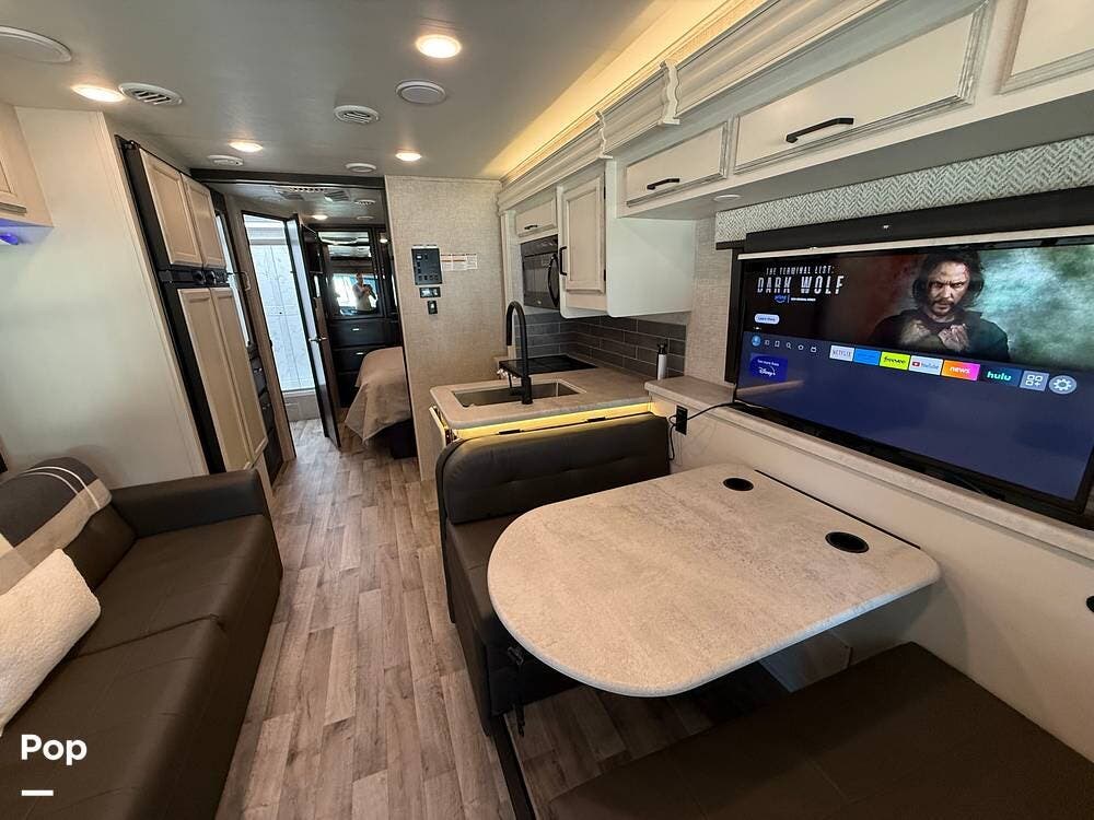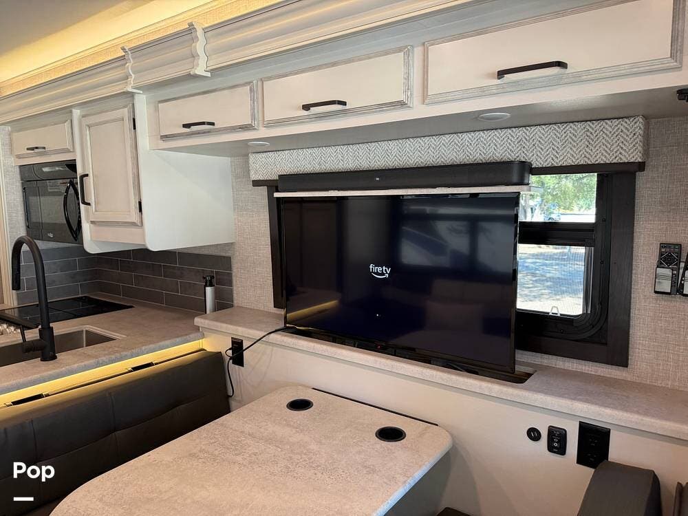 The kitchen is equipped with modern appliances, a large refrigerator, ample storage, and an expansive countertop, making meal preparation easy and enjoyable. The living area features plush seating and a flat-screen TV on a lift, allowing you to create a big picture window when desired, perfect for relaxing and entertaining at your favorite destinations.