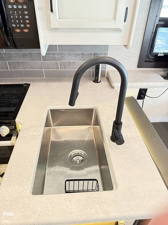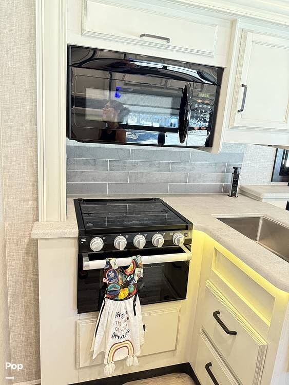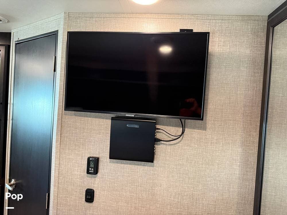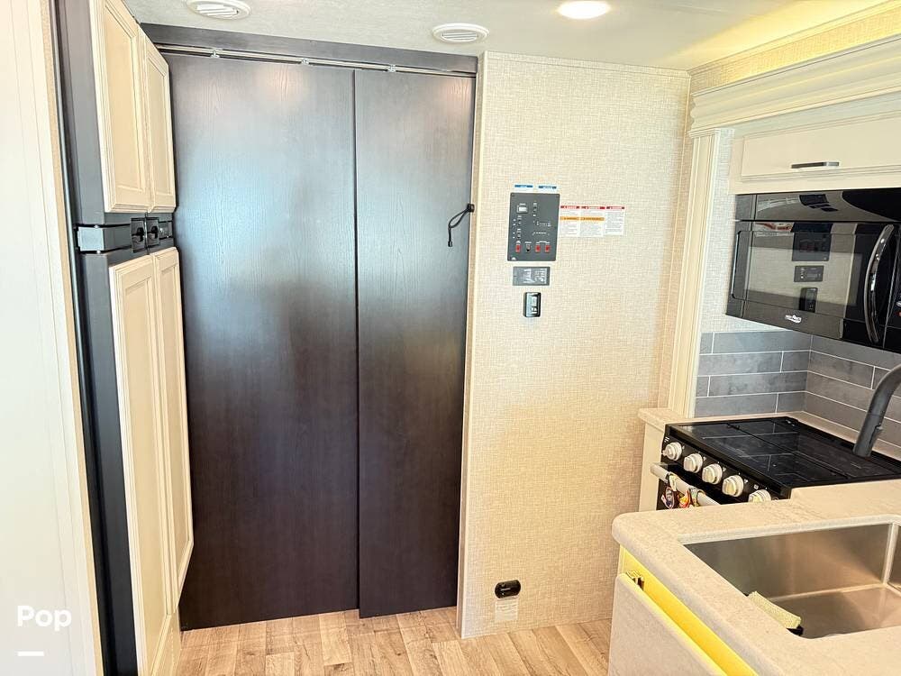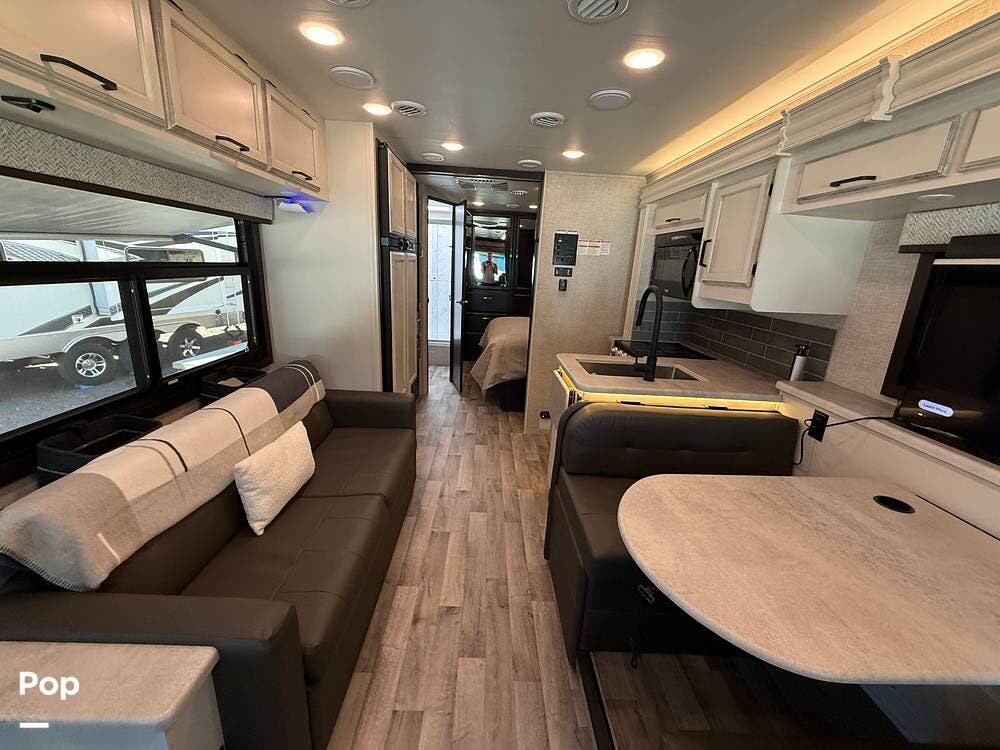 The kitchen is equipped with modern appliances, a large refrigerator, ample storage, and an expansive countertop, making meal preparation easy and enjoyable. The living area features plush seating and a flat-screen TV on a lift, allowing you to create a big picture window when desired, perfect for relaxing and entertaining at your favorite destinations.