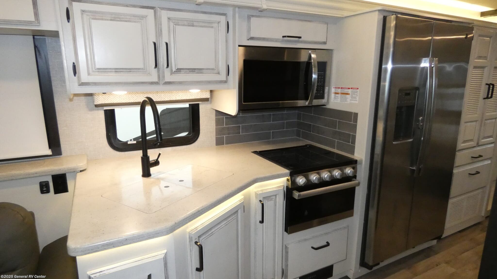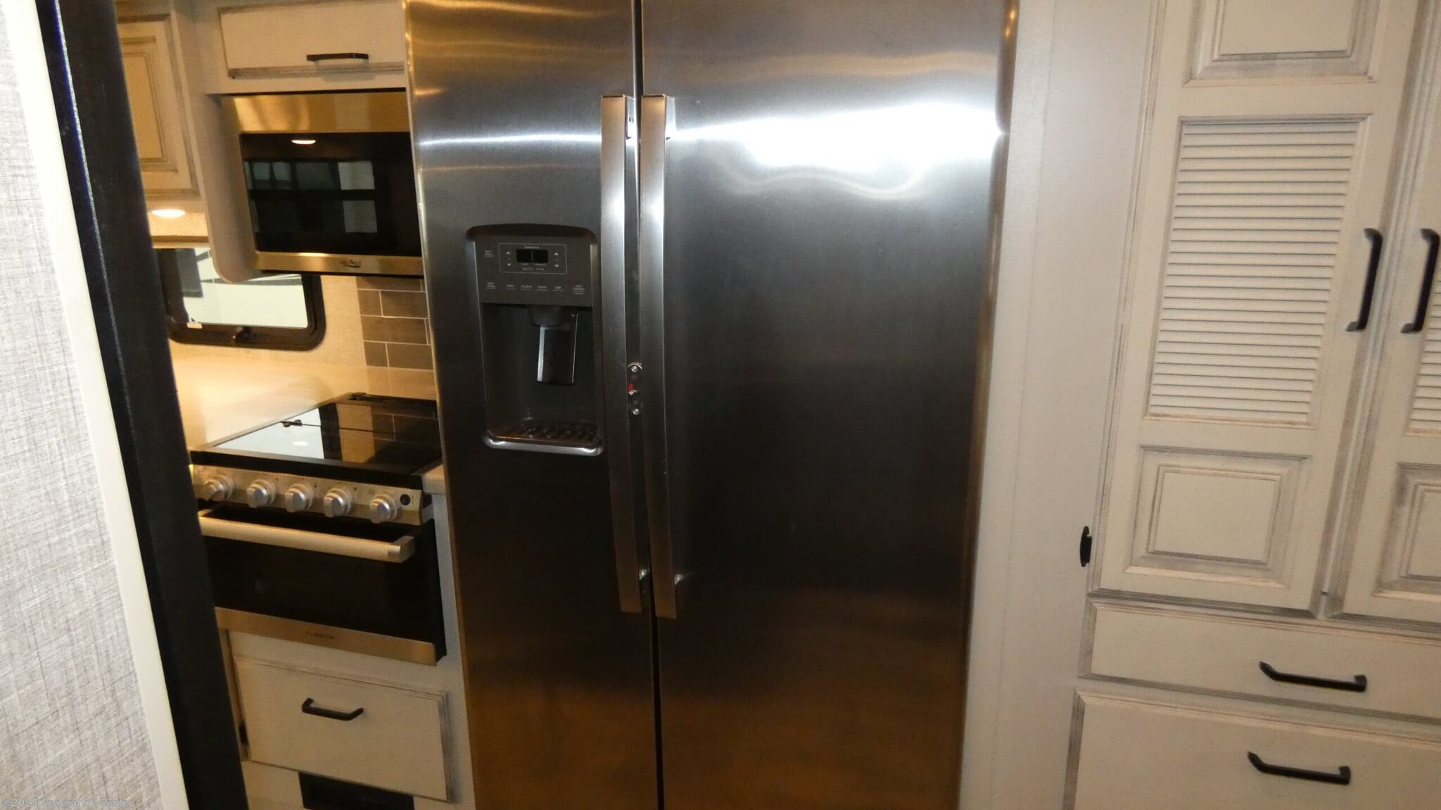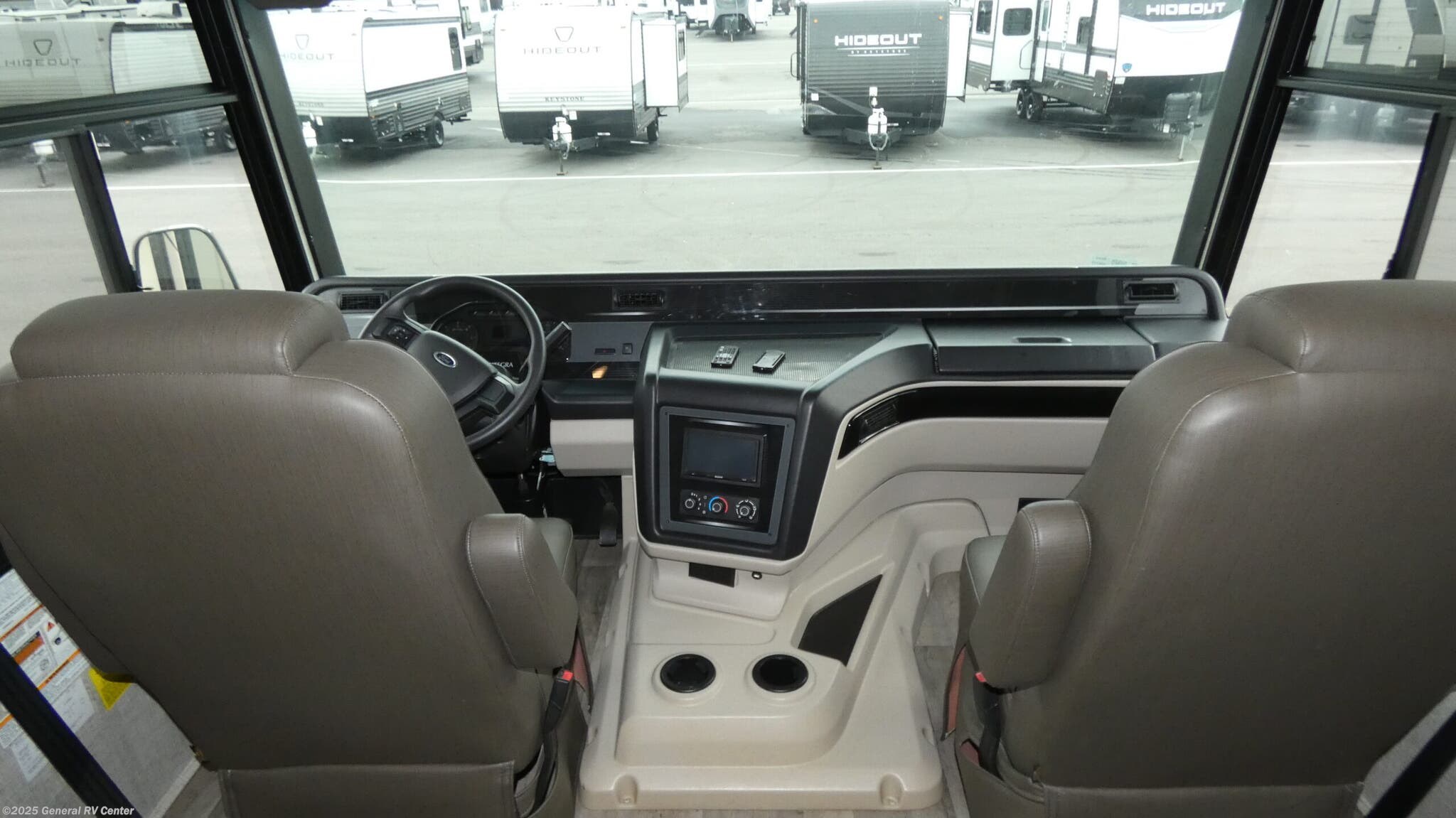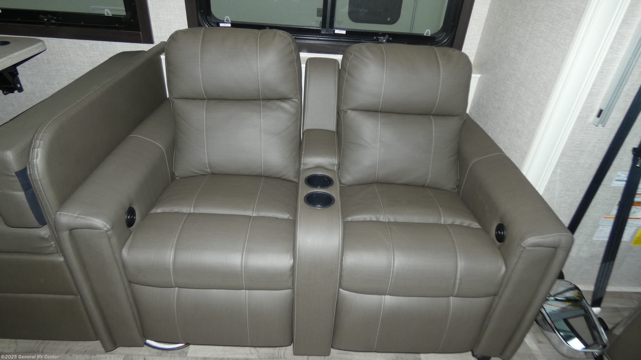 Step into the world of luxury and adventure with the 2023 Entegra Coach Vision XL 34G. This magnificent motorhome is designed to be your home on the road, offering both comfort and style. With its spacious interior, it comfortably sleeps up to eight, featuring a king-sized bed, a double bed, and two convertible options. The front living area invites relaxation with its theater seating and a cozy fireplace, perfect for unwinding after a day of exploration. The center kitchen is a culinary delight, equipped with a full-size electric refrigerator and a three-burner cooktop, ensuring you can whip up your favorite meals with ease. The Vision XL 34G's thoughtful design extends to its practical features. The center bath with a plastic/glass shower offers convenience and privacy, while the rear bedroom provides a serene retreat. Outside, the 23-foot powered retractable awning creates a perfect outdoor living space, complete with an entertainment center for those evenings under the stars. Built on a robust Ford F53 chassis with a 350 horsepower engine, this motorhome is as powerful as it is luxurious, ready to take you wherever the road may lead. Discover the perfect blend of adventure and comfort with the Entegra Coach Vision XL 34G. For more information, visit your nearest General RV dealership.