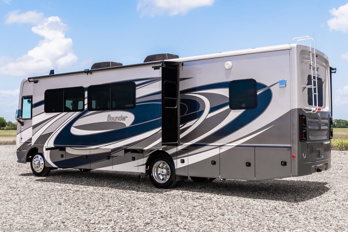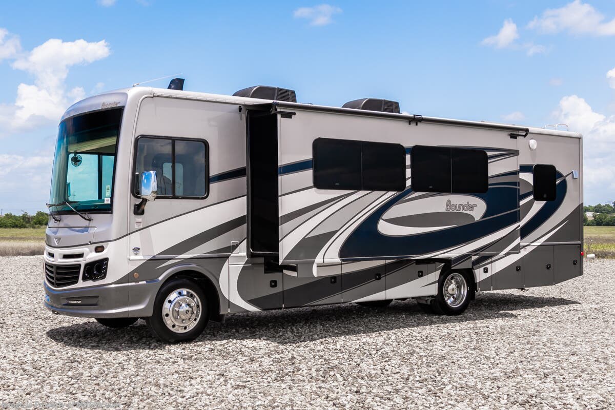 Used Fleetwood RV for sale ā 2023 Fleetwood Bounder 33C is approximately 34ā 3ā in length, 2 slides, 6,077 miles and features Auto Leveling jacks, aluminum wheels, full body paint, 3 camera system, dual A/Cās, Onan 5.5KW gas generator, Ford Chassis, Ford V8 7.3L gas engine, tilt/telescoping steering wheel, cruise control, gas/electric water heater, power patio awning, pass through storage, side swing storage doors, LED running lights, black tank flush, water filtration system, 50 amp power on a power reel, exterior shower, exterior entertainment, clear paint mask, ladder, inverter, kitchen backsplash, dual pane windows, fireplace, multi-plex control panel, power vents, solid surface counters, sink cover, convection microwave, 3 burner gas range with oven, combination washer/dryer, king bed, cab over loft and much more. For additional information and photos, please visit Motor Home Specialist at or call 800-335-6054.