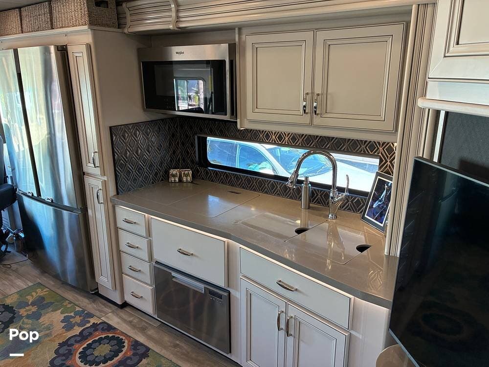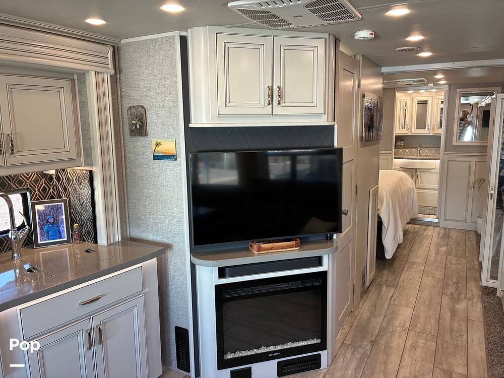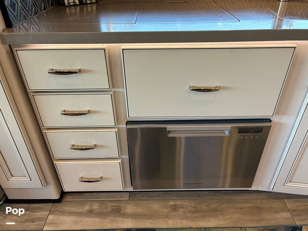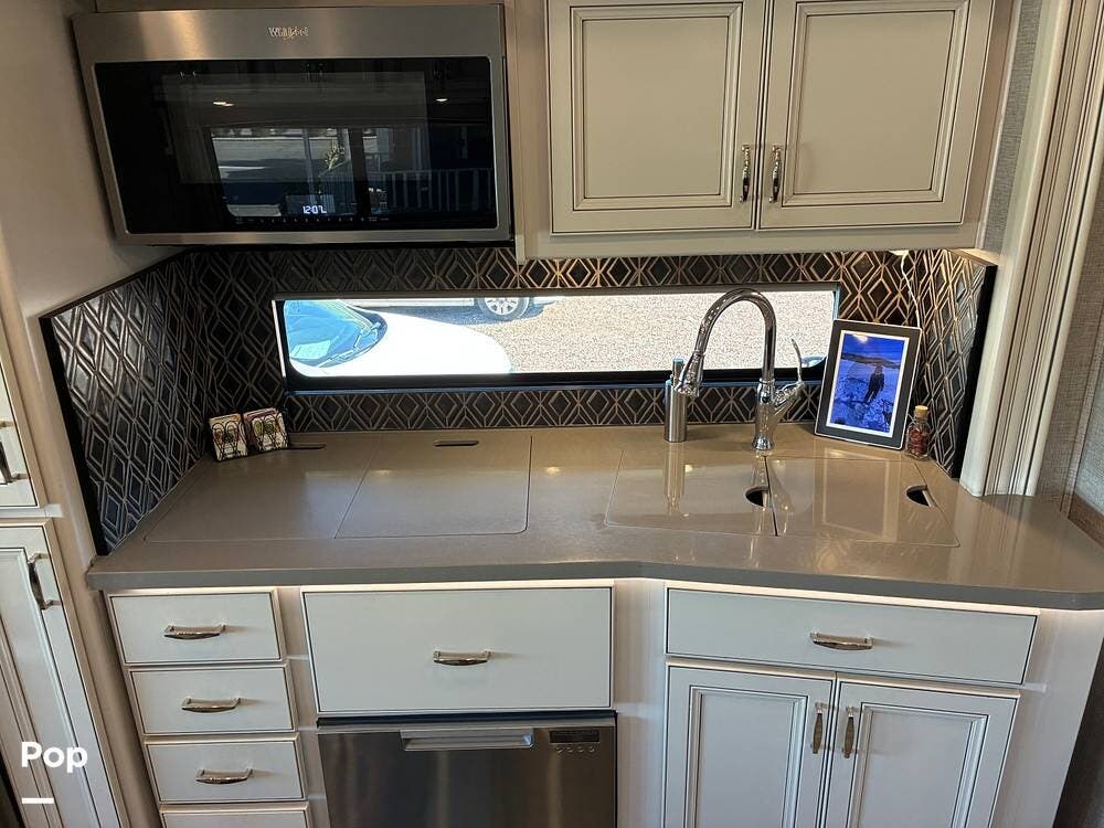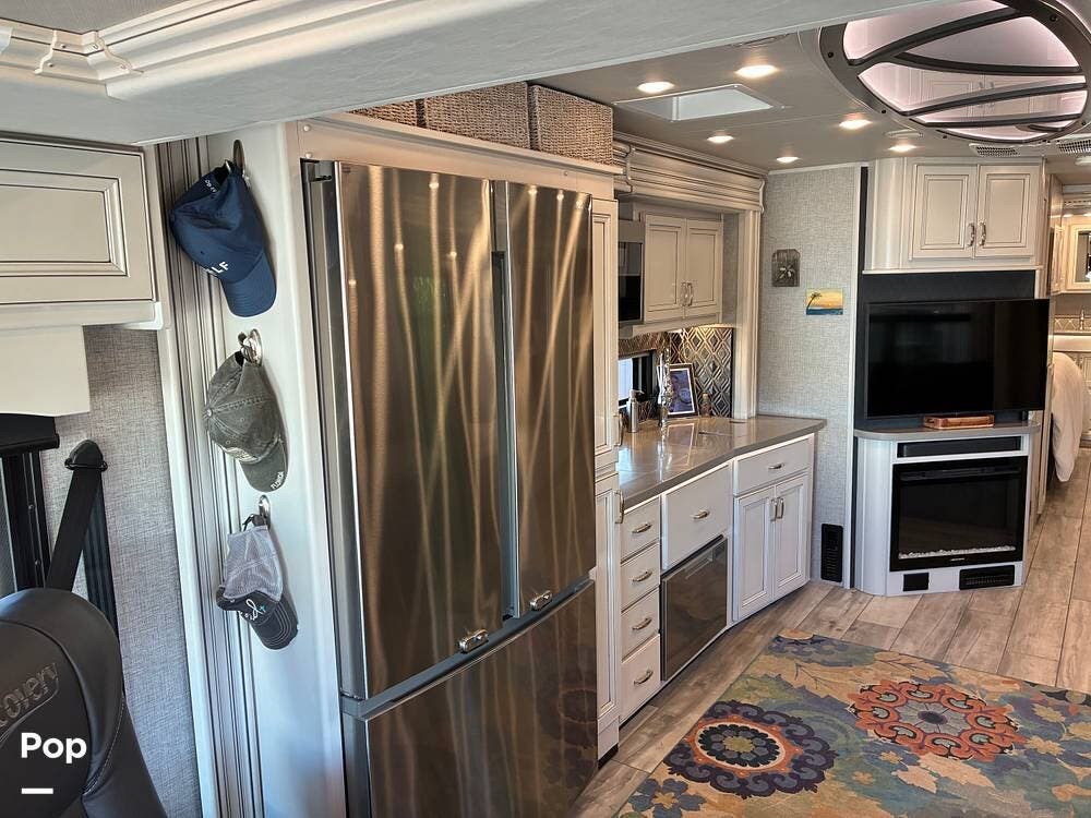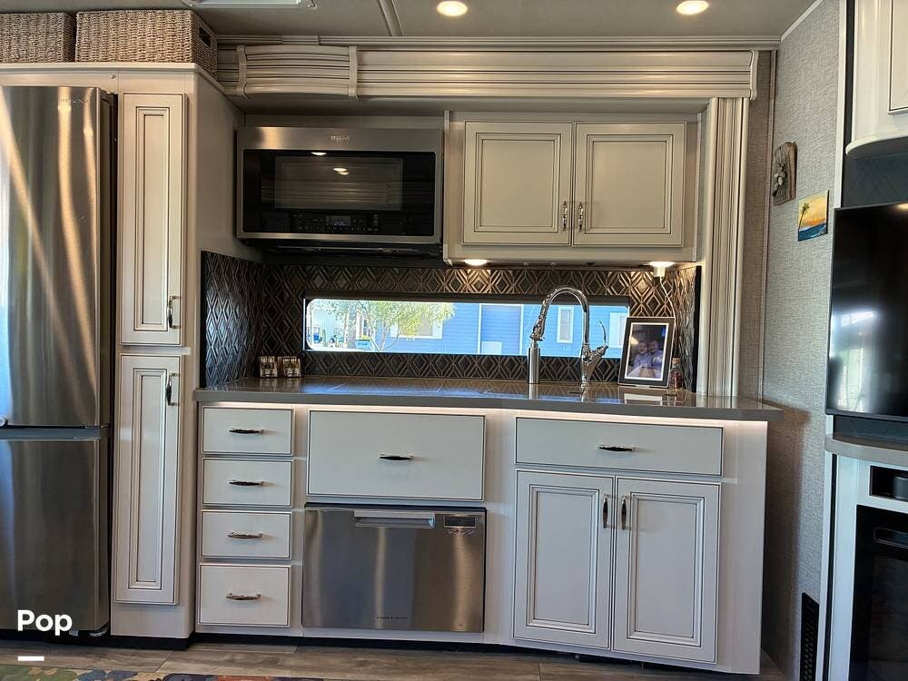 Inside, the coach features a residential-style kitchen with solid cabinetry, generous counter space, and modern appliances. The living area includes ample seating, dining accommodations, and a dedicated entertainment space, creating an open and functional interior.