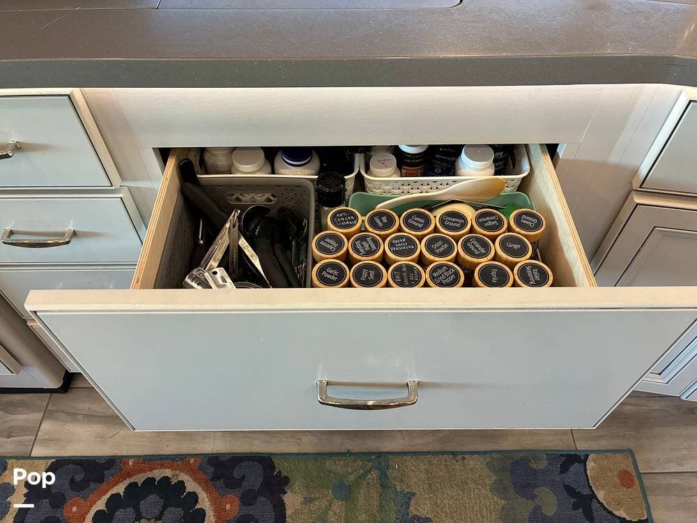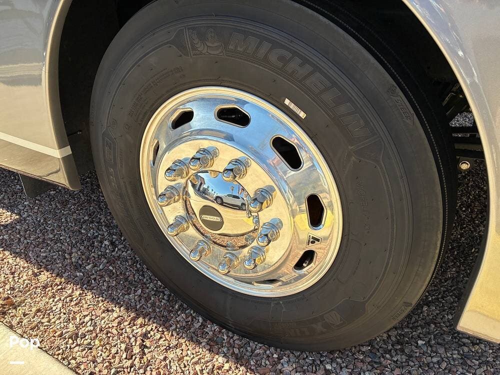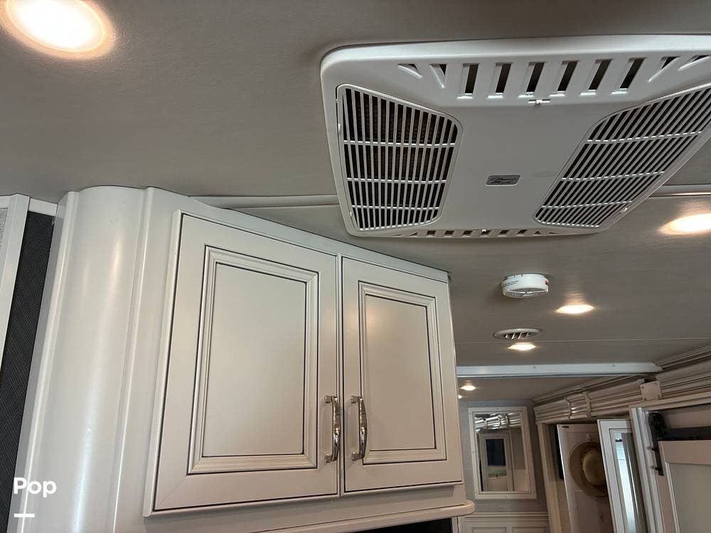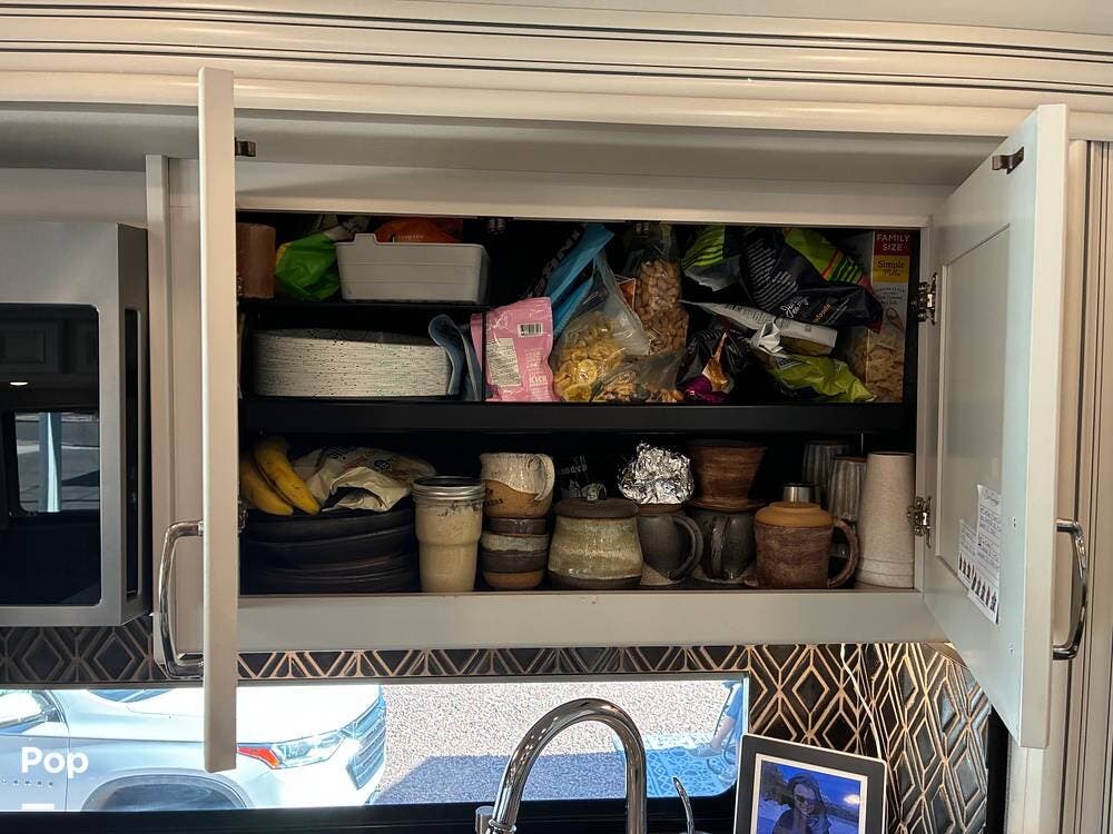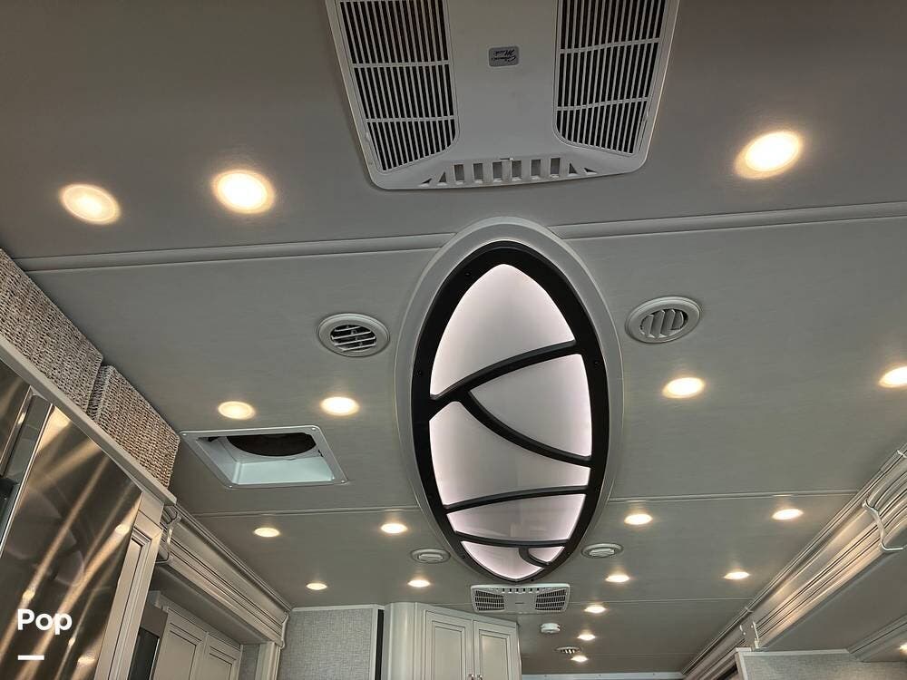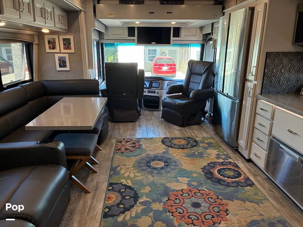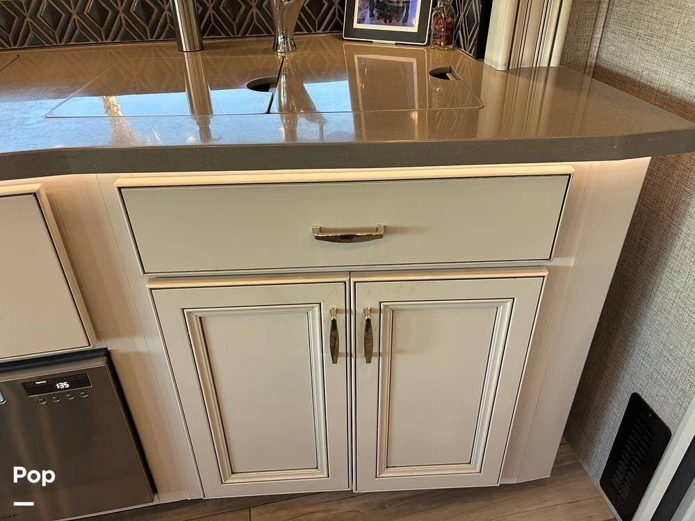 Inside, the coach features a residential-style kitchen with solid cabinetry, generous counter space, and modern appliances. The living area includes ample seating, dining accommodations, and a dedicated entertainment space, creating an open and functional interior.