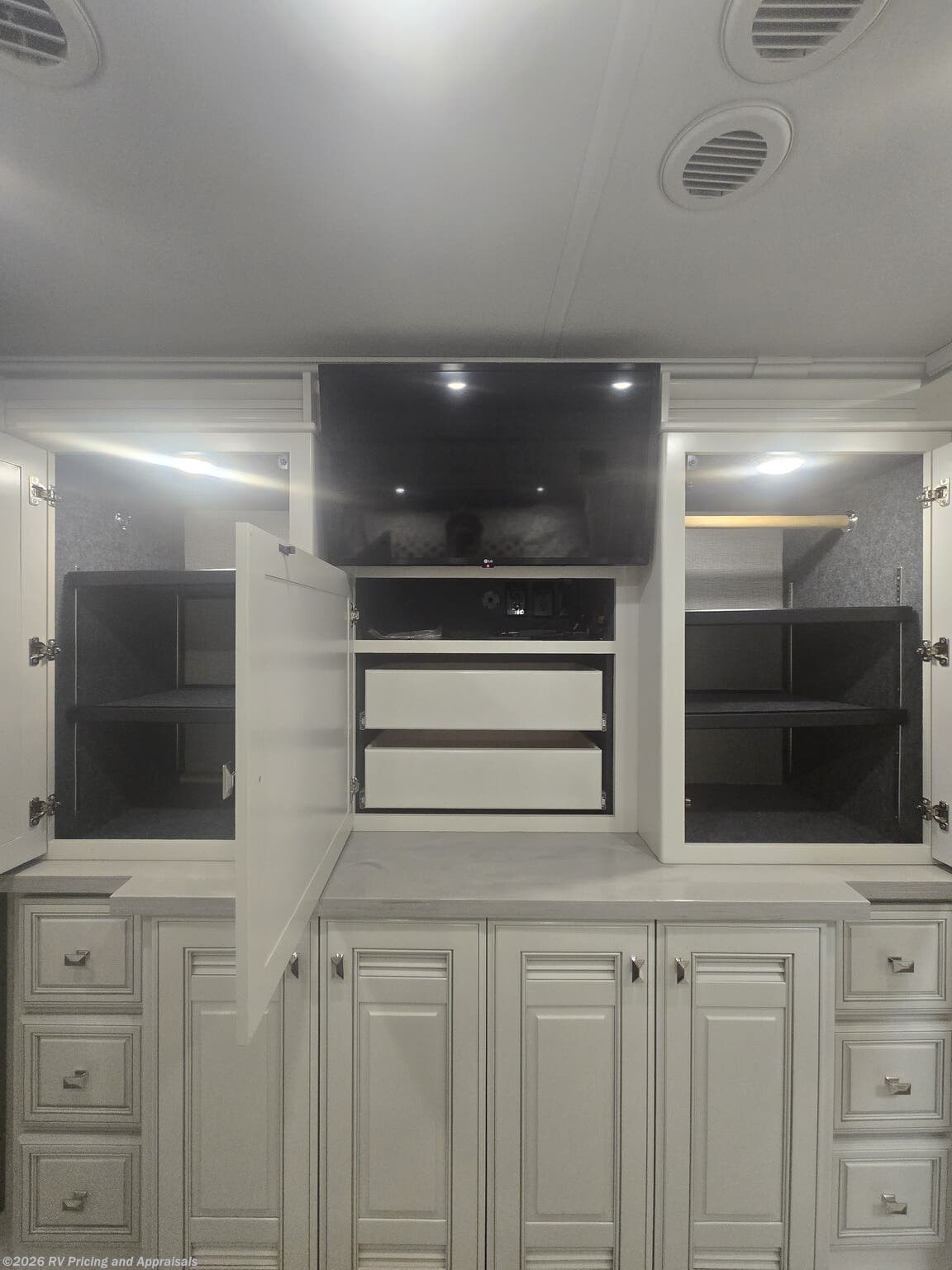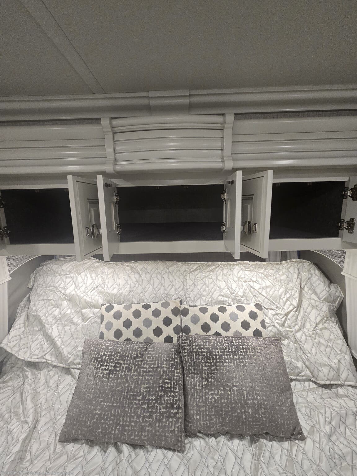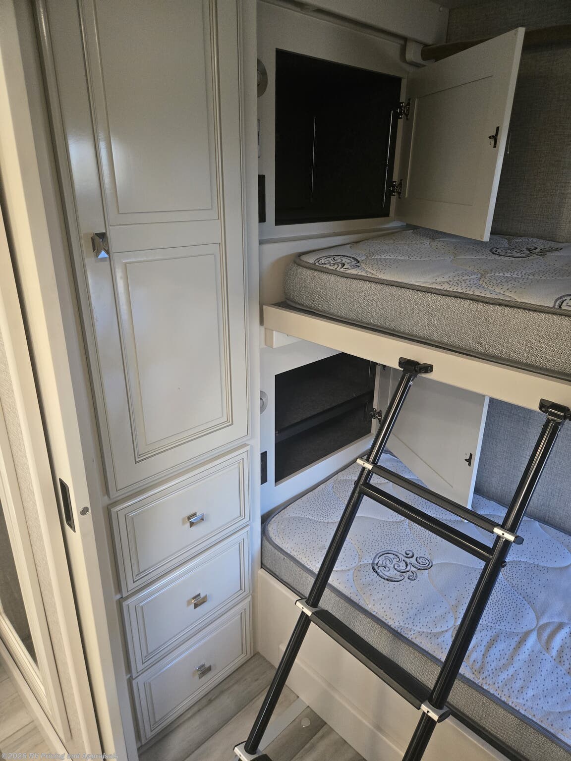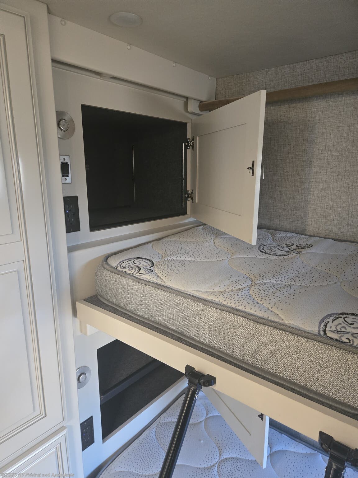 - Premium Interior — Hide-A-Loft electric drop-down bed (46” x 76”) with TV and privacy curtains; sofa sleeper with queen mattress; mid-ship LED TV; four total exterior/internal TVs, King Bed and two Bunks