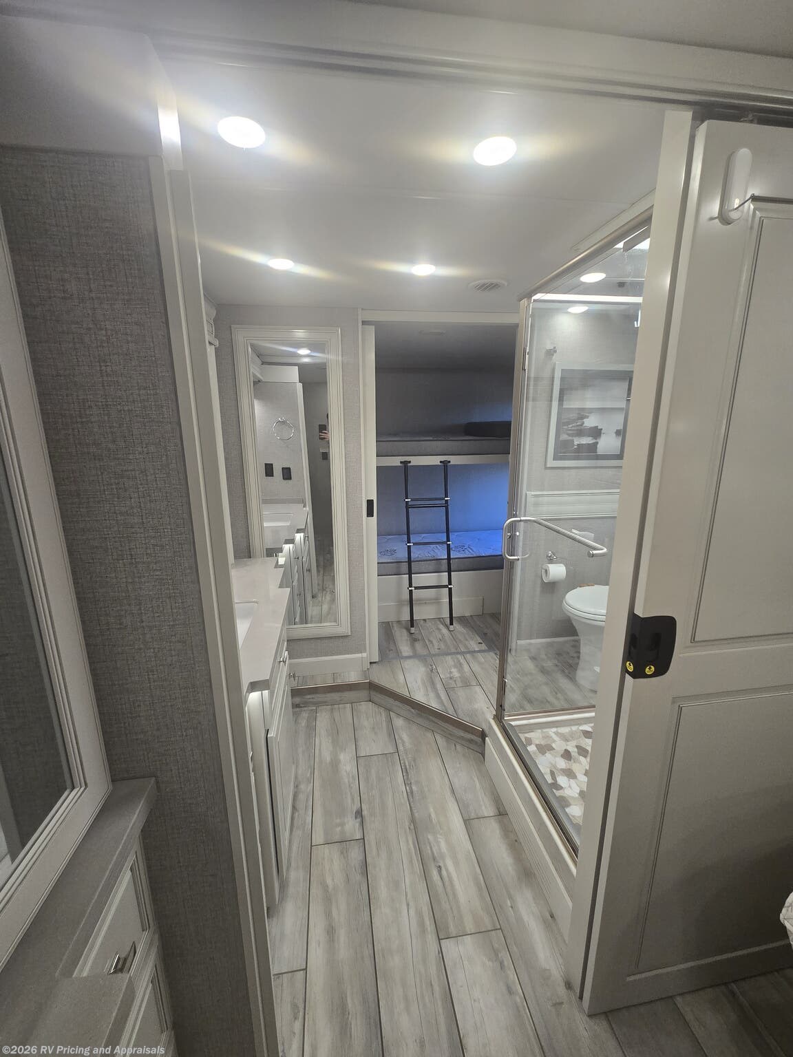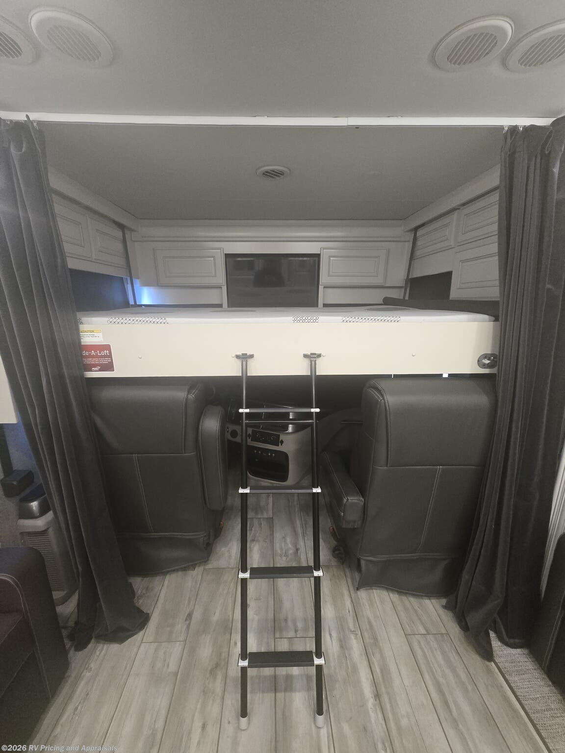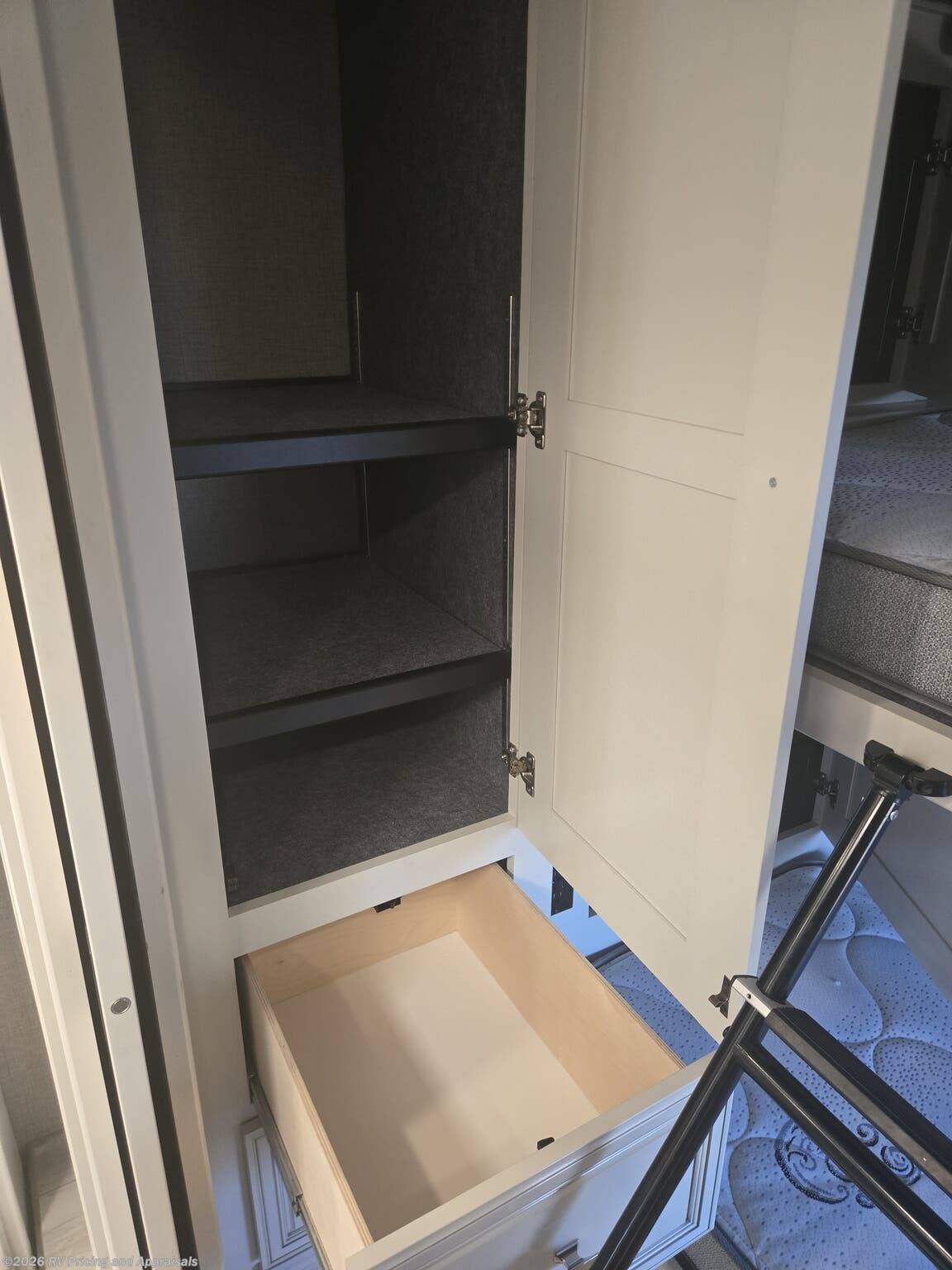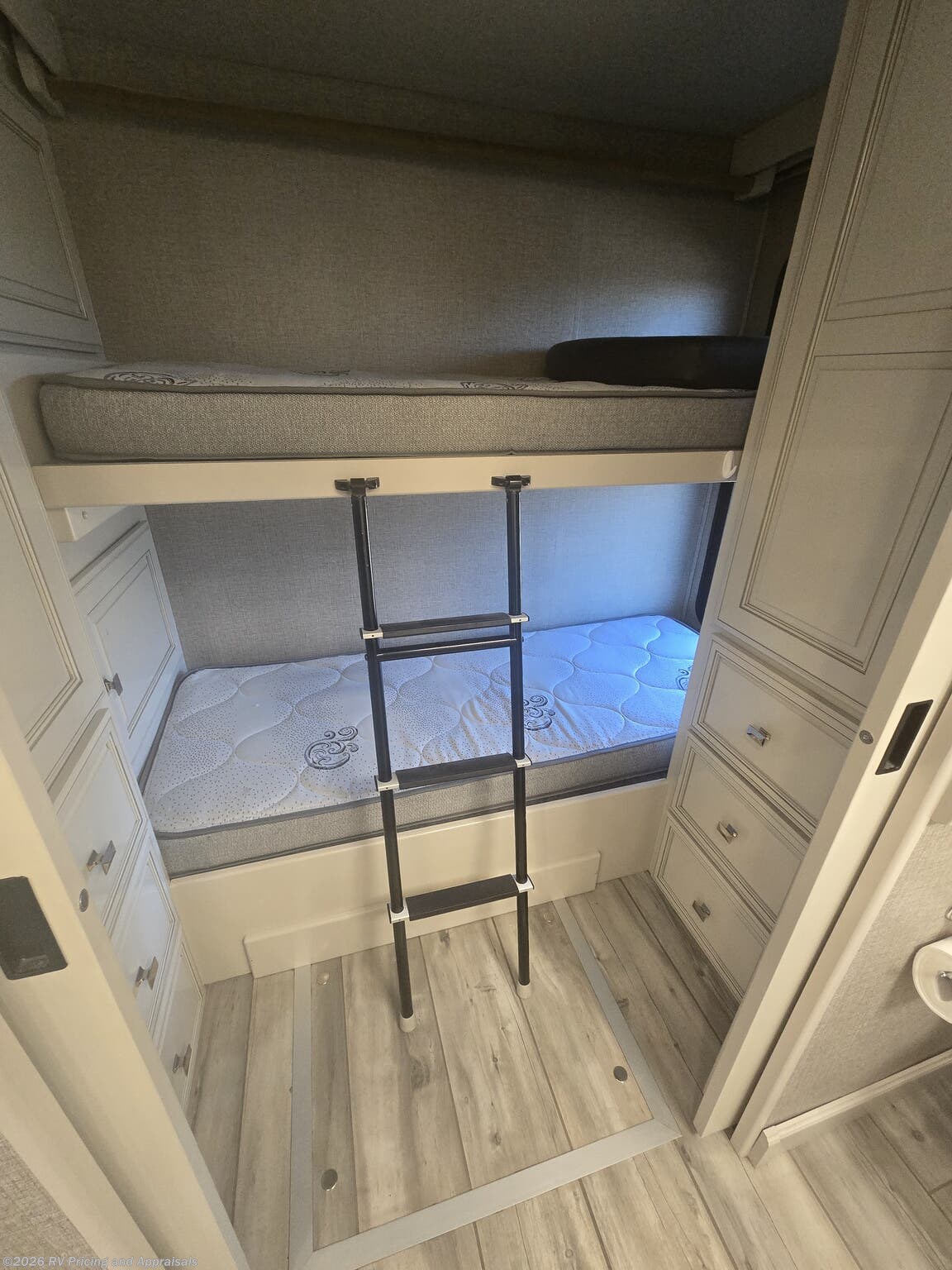 - Premium Interior — Hide-A-Loft electric drop-down bed (46” x 76”) with TV and privacy curtains; sofa sleeper with queen mattress; mid-ship LED TV; four total exterior/internal TVs, King Bed and two Bunks