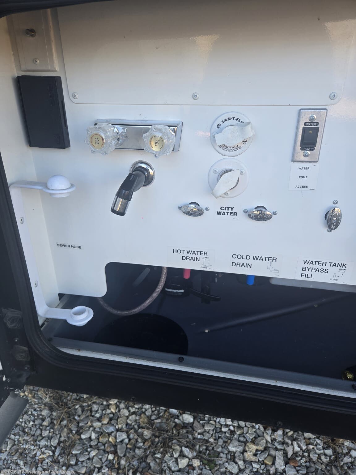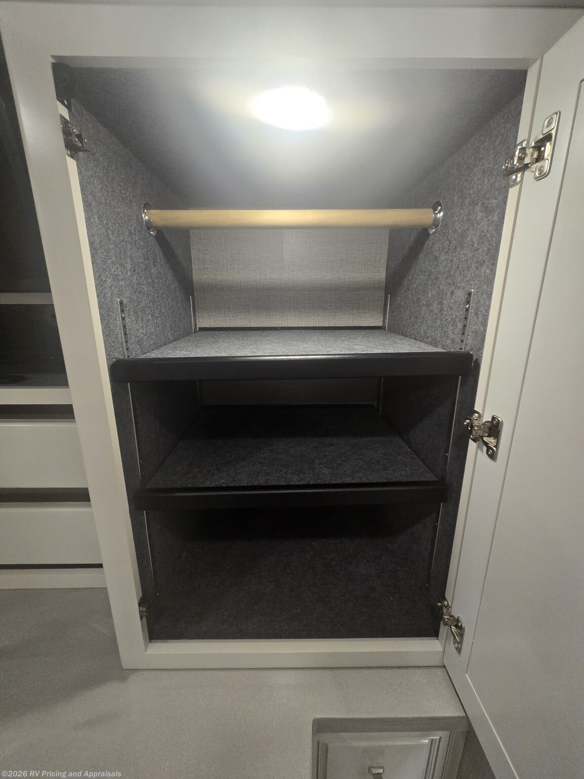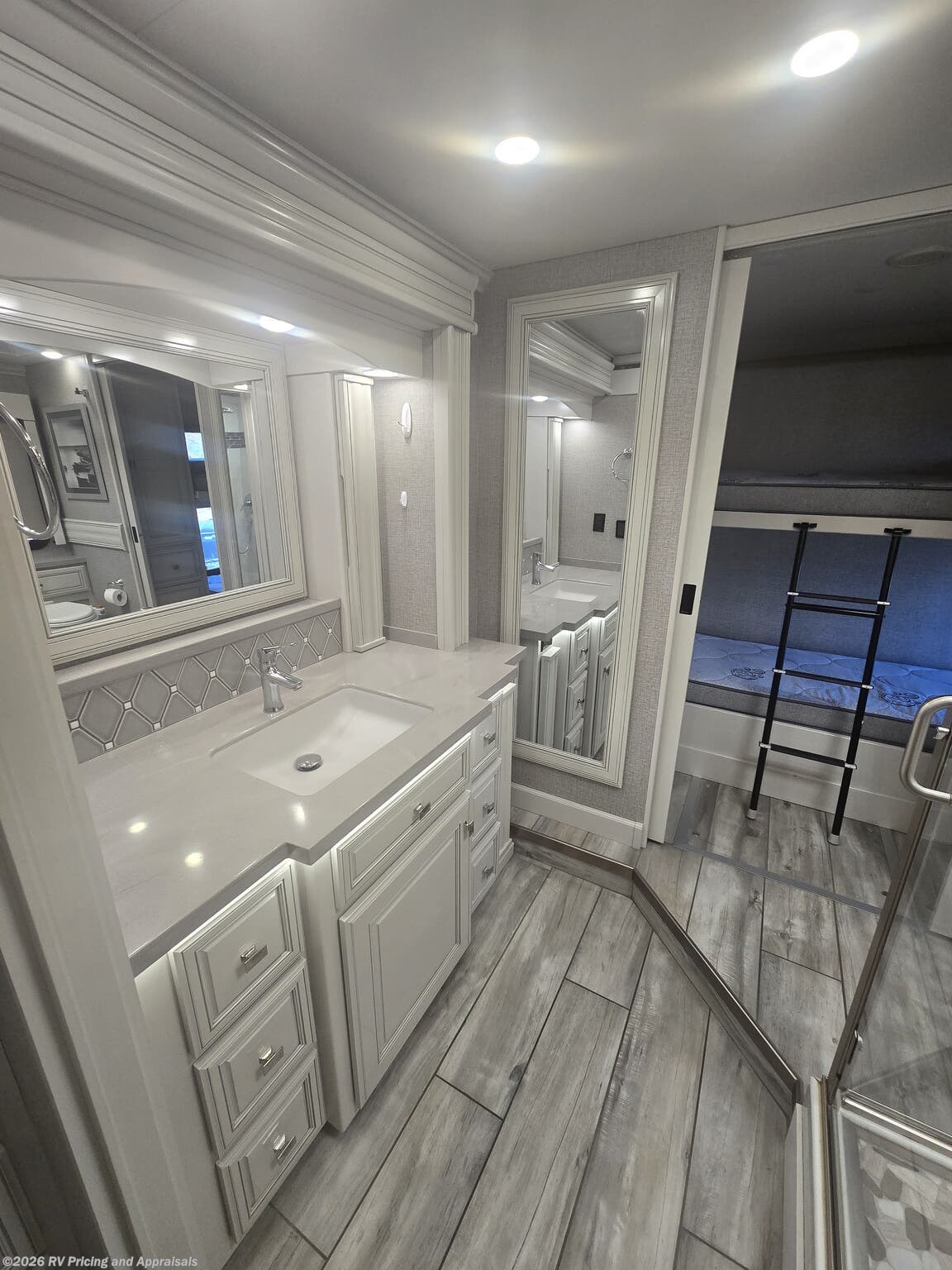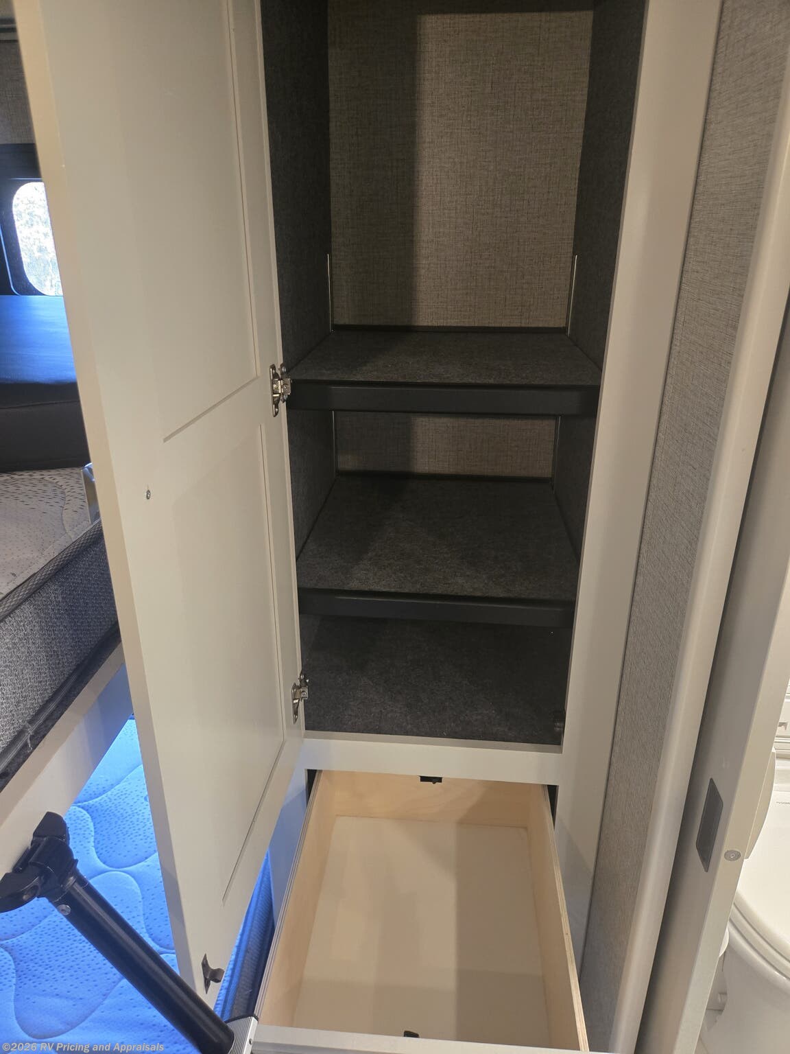 - Premium Interior — Hide-A-Loft electric drop-down bed (46” x 76”) with TV and privacy curtains; sofa sleeper with queen mattress; mid-ship LED TV; four total exterior/internal TVs, King Bed and two Bunks