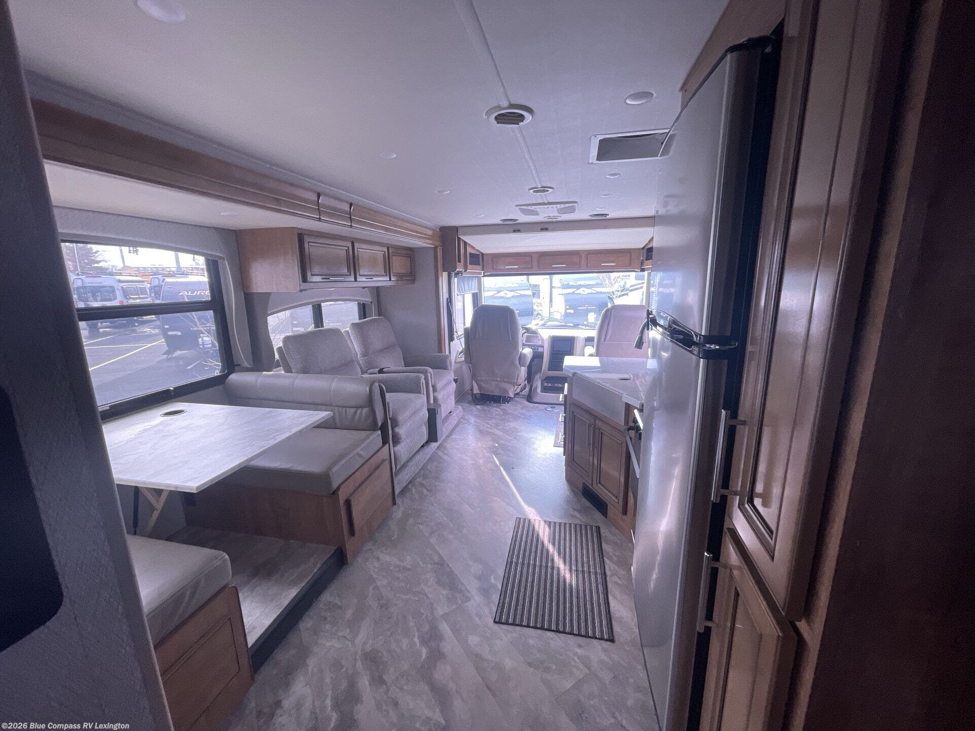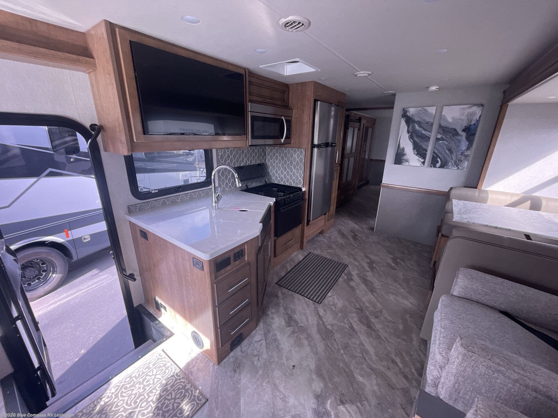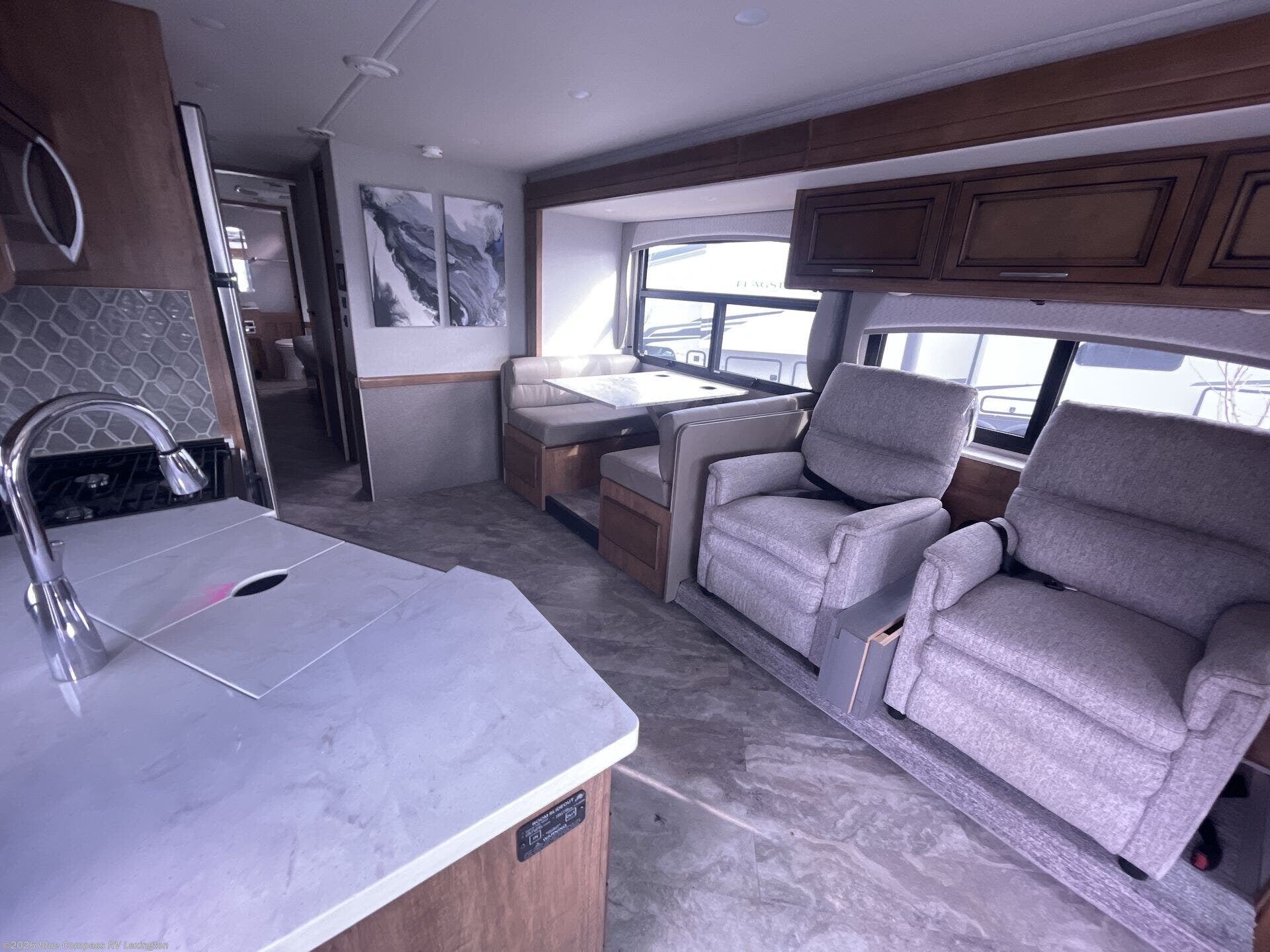 The Fleetwood Fortis Class A gas motorhome is a powerhouse of luxury and convenience, and it also is quite literally a powerhouse with its Ford 7.3L V8 350HP engine with 468 LB/FT of torque. The construction includes a Dryseal edge coating for all ceilings, walls, and floor, and the Powerlock System 2 has interlocking walls to the roof for stability. Automatic hydraulic leveling jacks make the set-up process easier, and the cab has excellent features, like a 9" stereo with AM/FM/Bluetooth, backup camera, reclining/swivel cab seats, driver/passenger center table, and an automotive-style dash with dual monitors and workstation. You will find vinyl tile flooring all throughout the interior, as well as full-extension drawer guides with latches, coordinating window treatments, and energy-efficient LED flush-mount ceiling lighting.