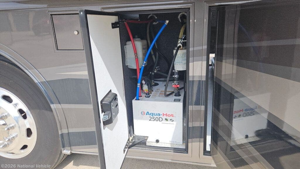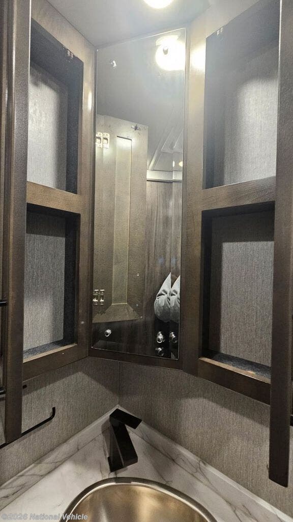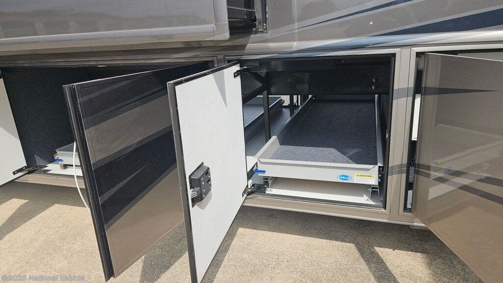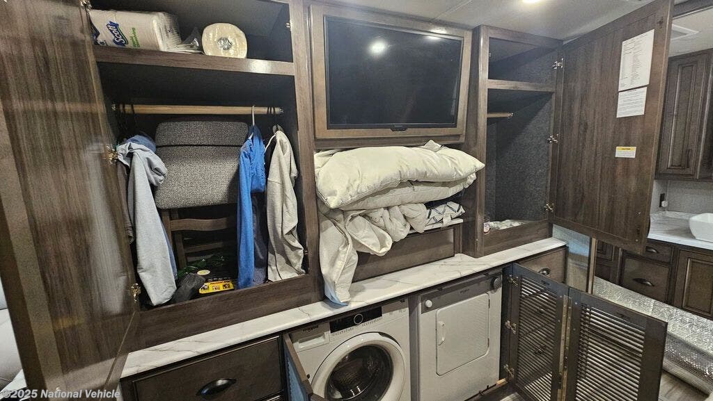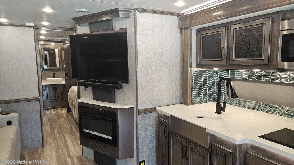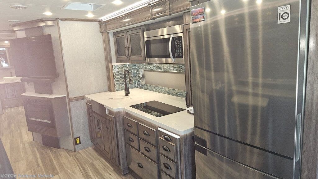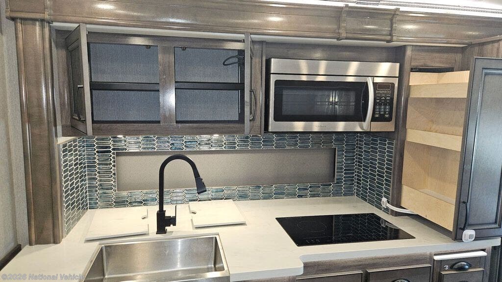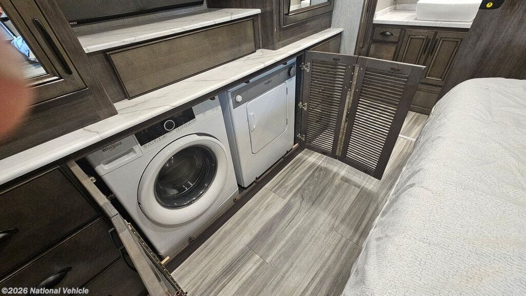 The gourmet kitchen is equipped for extended stays, featuring a stainless steel residential refrigerator, convection microwave, and 2-burner cooktop, all seamlessly integrated into a modern, functional layout. For ultimate convenience on the road, enjoy the luxury of an in-unit washer and dryer and the efficiency of Aqua Hot? hydronic heating for consistent comfort in all seasons.
