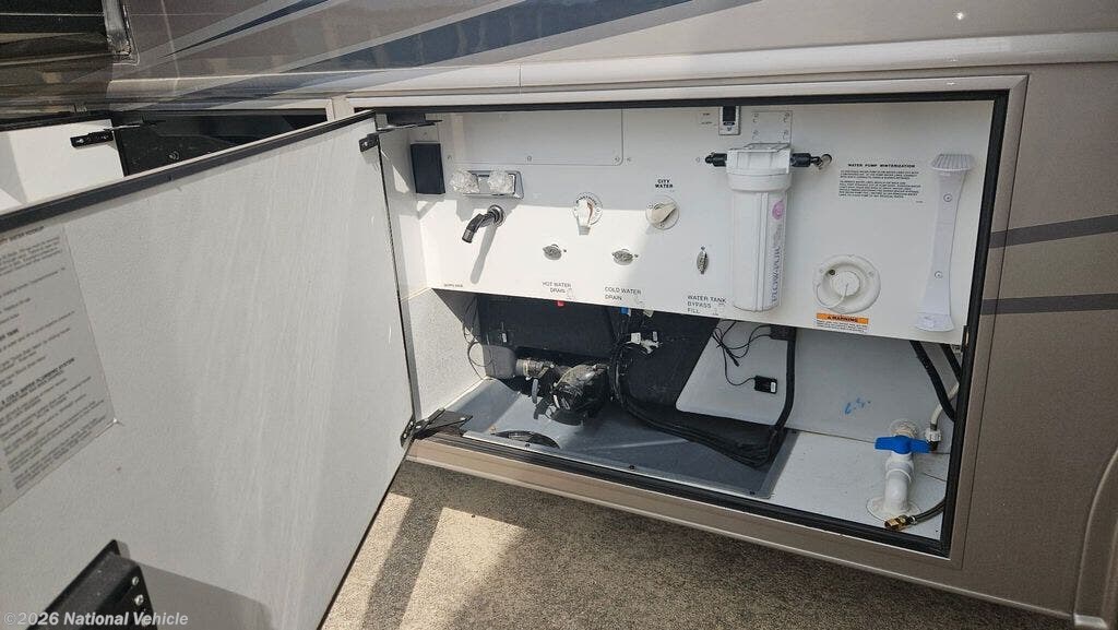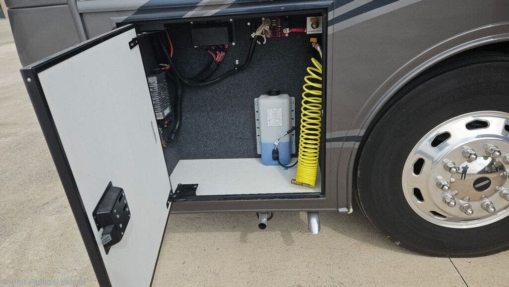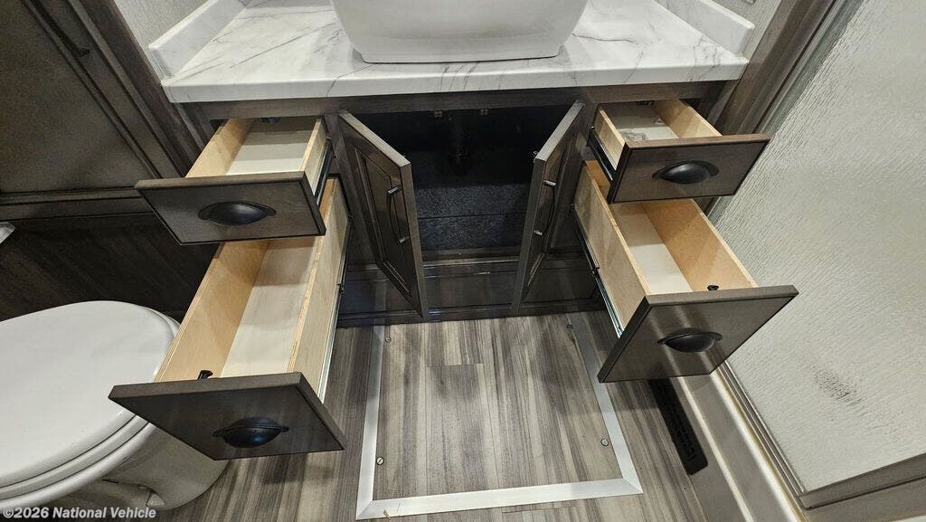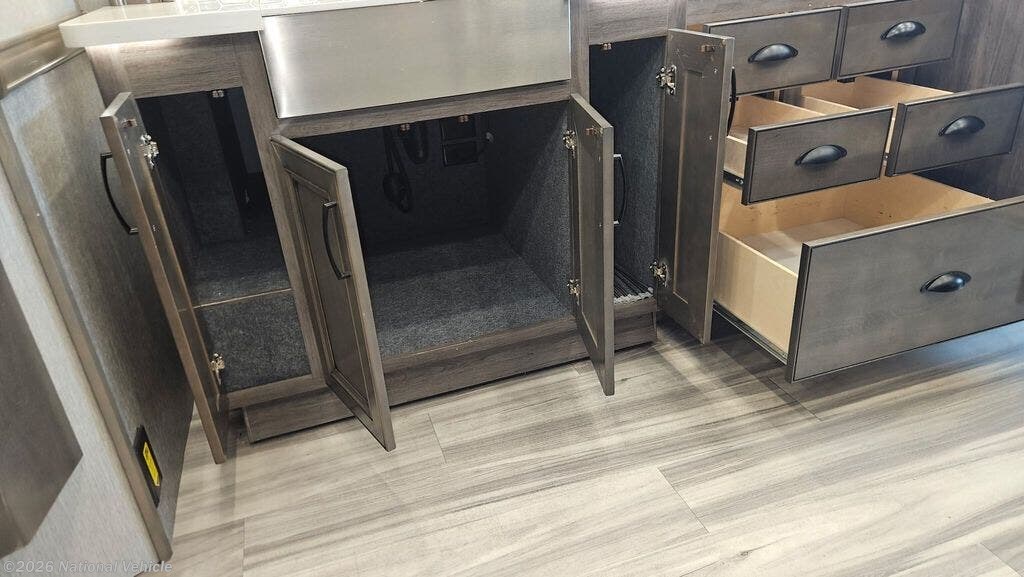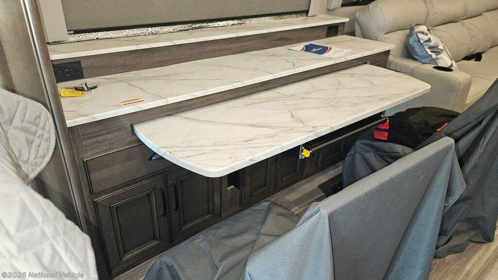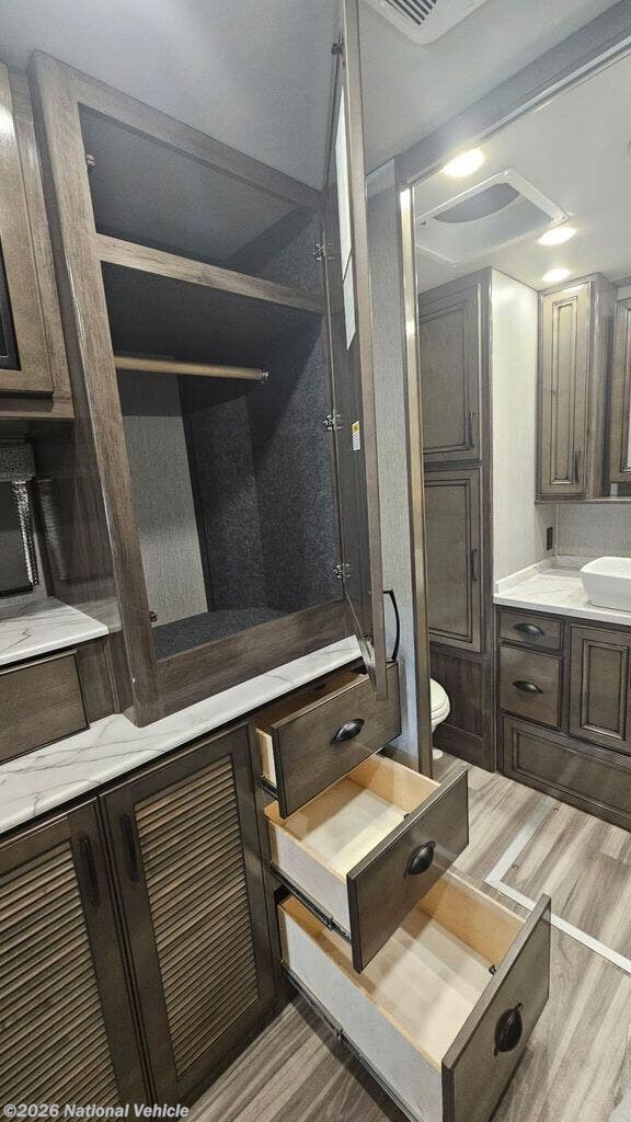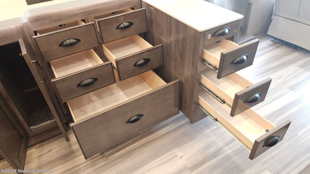 The gourmet kitchen is equipped for extended stays, featuring a stainless steel residential refrigerator, convection microwave, and 2-burner cooktop, all seamlessly integrated into a modern, functional layout. For ultimate convenience on the road, enjoy the luxury of an in-unit washer and dryer and the efficiency of Aqua Hot? hydronic heating for consistent comfort in all seasons.