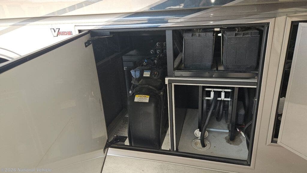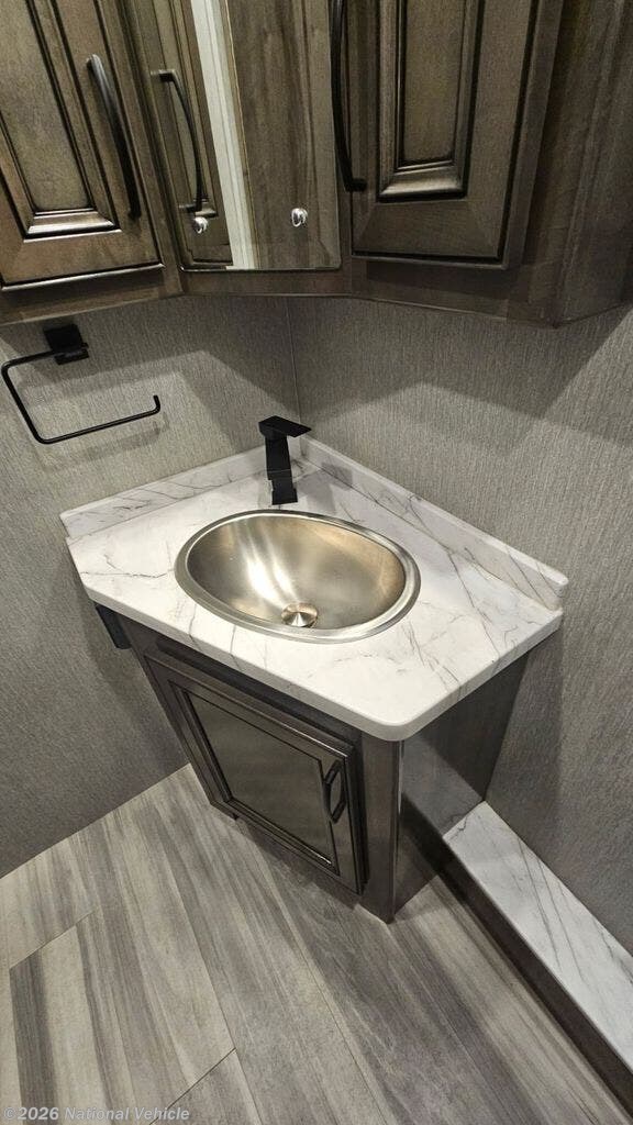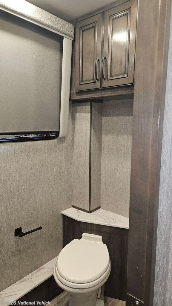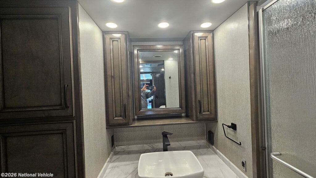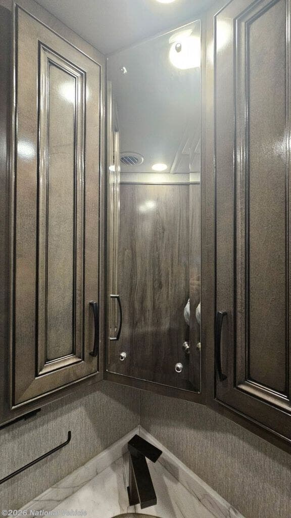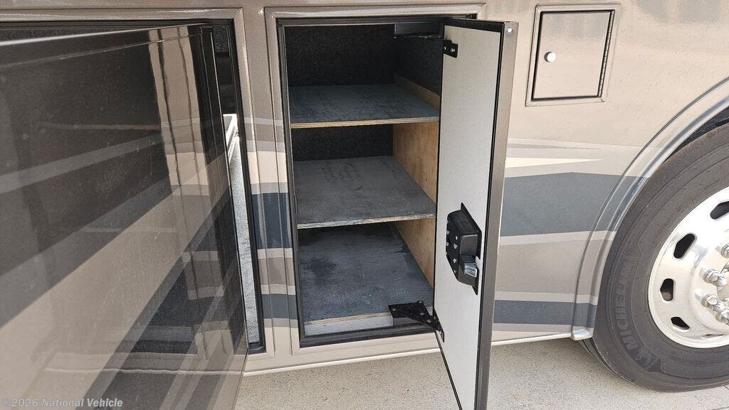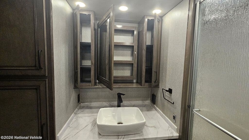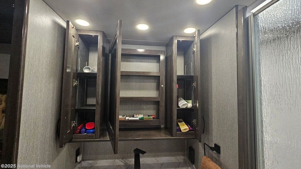 The gourmet kitchen is equipped for extended stays, featuring a stainless steel residential refrigerator, convection microwave, and 2-burner cooktop, all seamlessly integrated into a modern, functional layout. For ultimate convenience on the road, enjoy the luxury of an in-unit washer and dryer and the efficiency of Aqua Hot? hydronic heating for consistent comfort in all seasons.