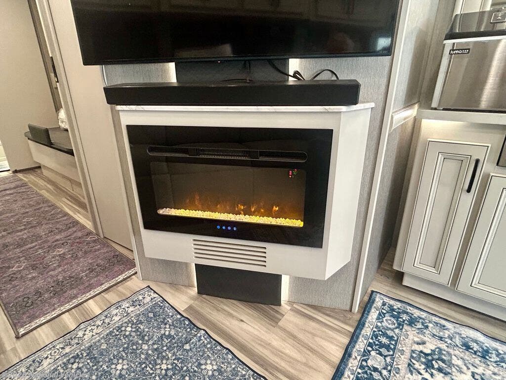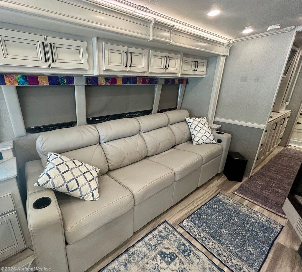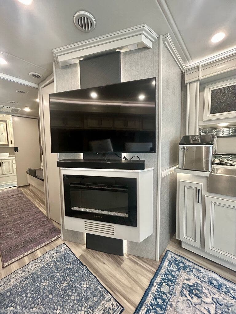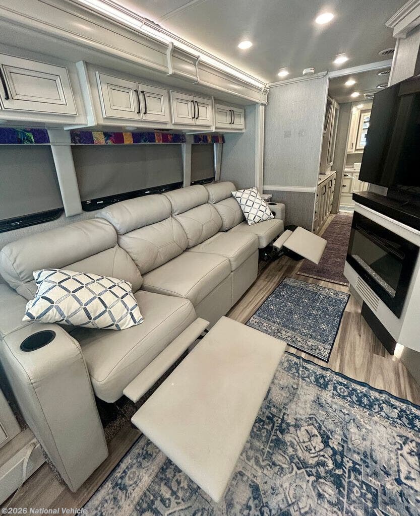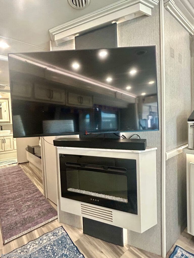 The Living Room: A massive 4-person sofa with dual recliners, an electric fireplace, and upgraded soundbars for the living room and over-cab TVs.
