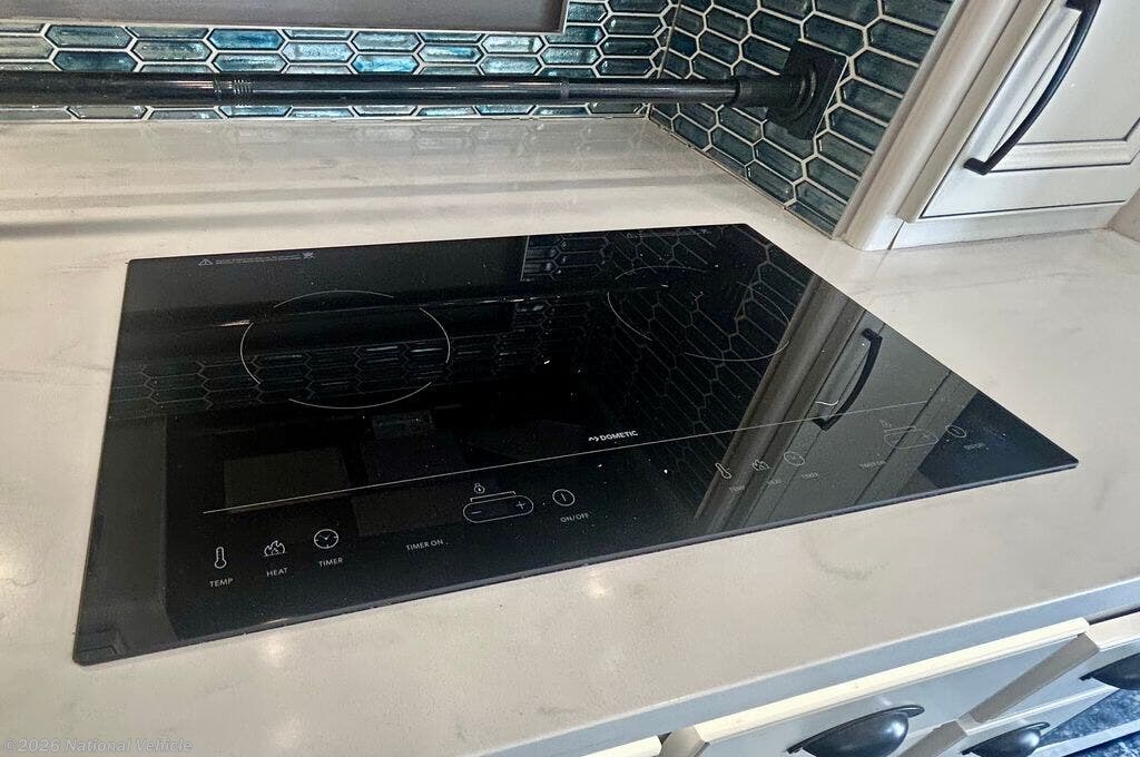 All-Electric Kitchen: 2-burner induction cooktop, convection microwave, residential fridge, and an added stand-alone ice maker.