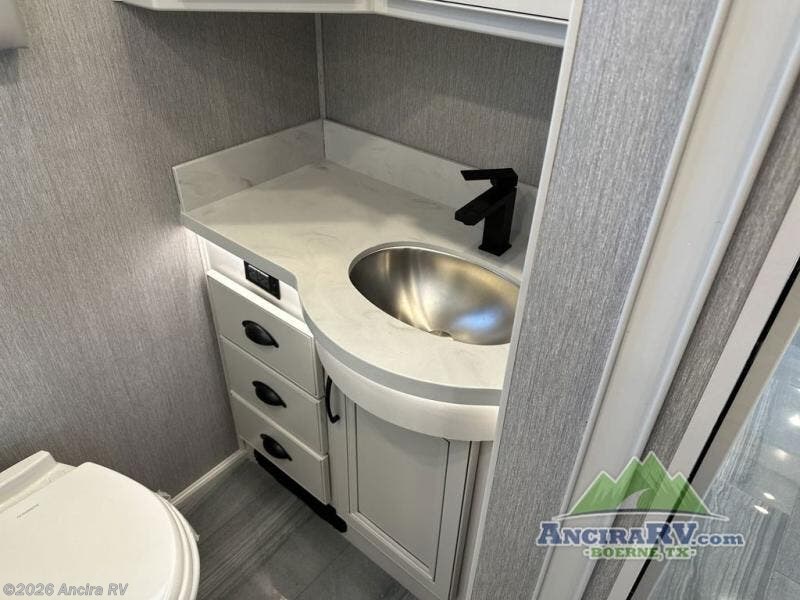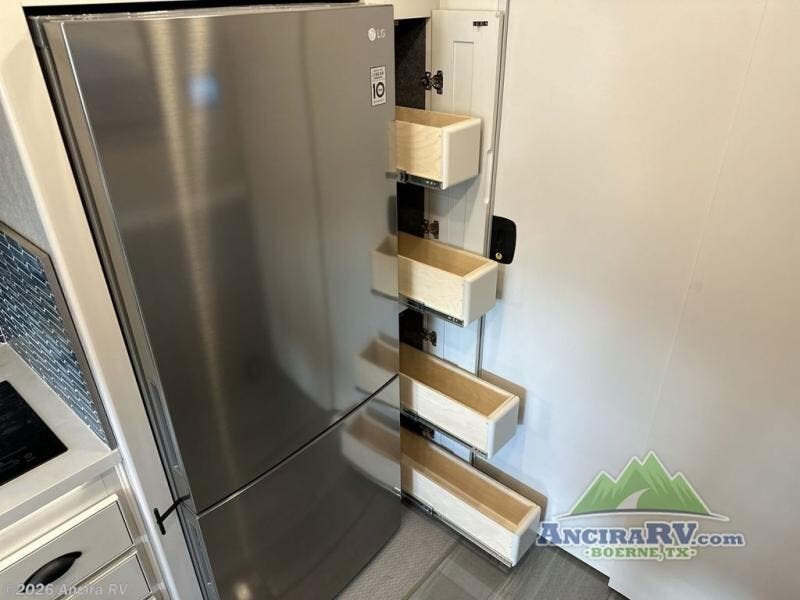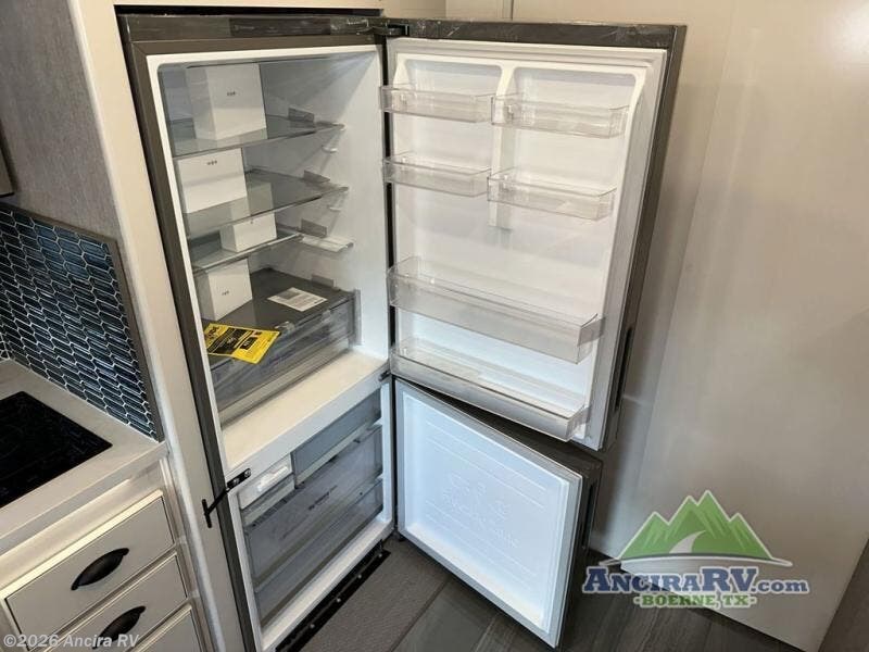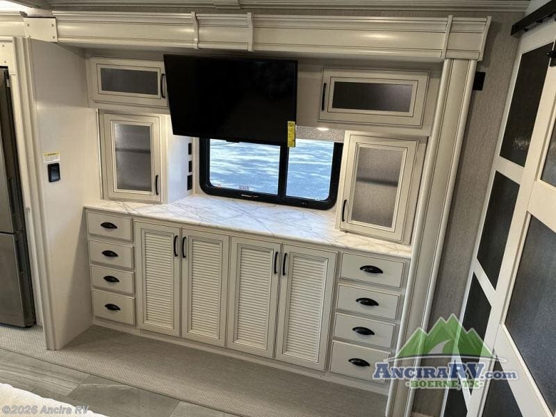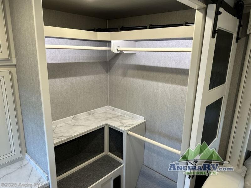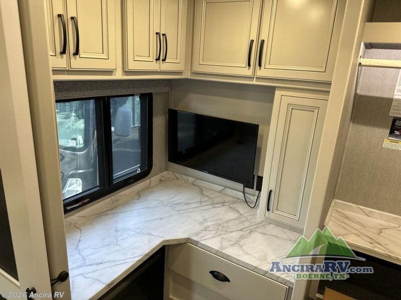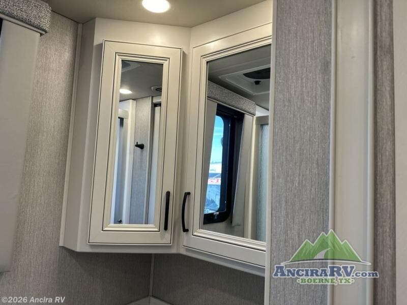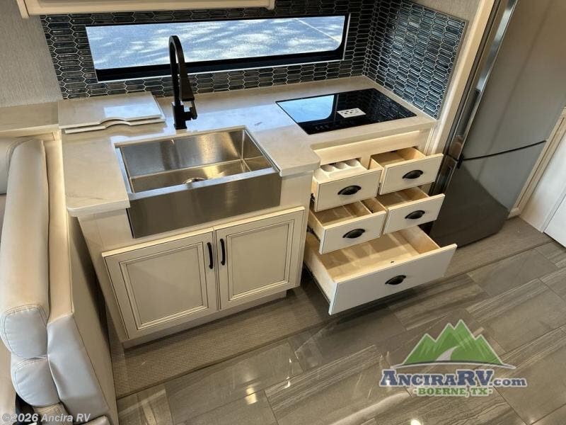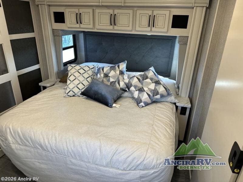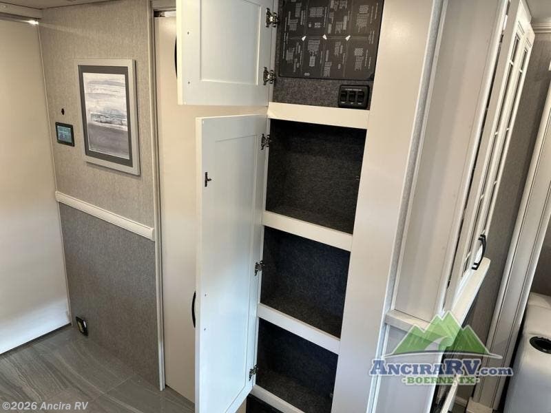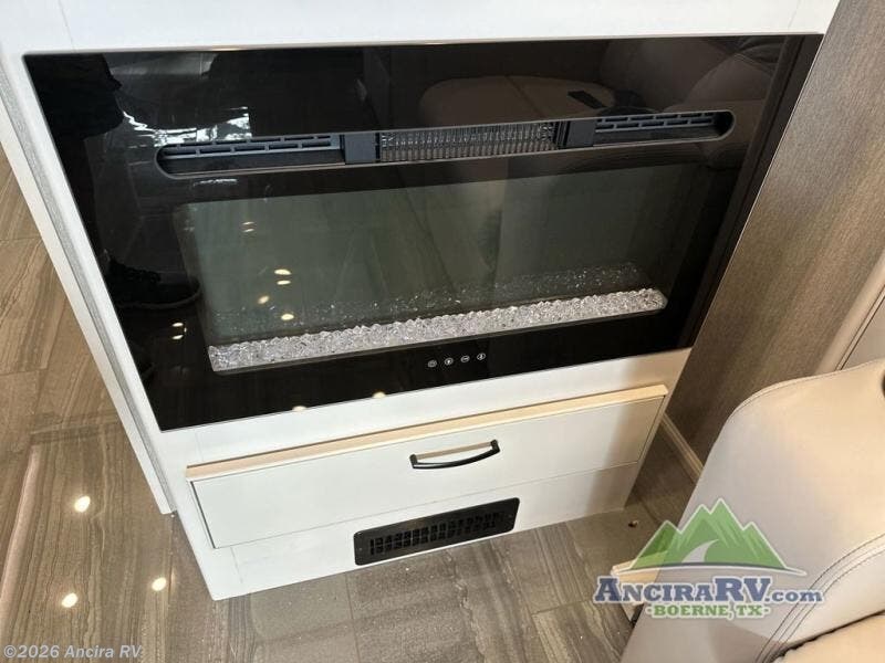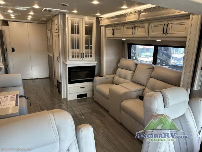 So much room to relax! A spacious front living area offers a cozy fireplace with a sofa sleeper with queen mattress plus a dream dinette. Mid-coach you'll find a full bath with shower across from a well-equipped kitchen with a residential refrigerator, convection microwave, and induction cooktop. A pantry holds all your supplies. At night you'll sleep well on the king bed, with dedicated CPAP storage overhead. Bedroom storage abounds with a dresser unit with overhead storage plus space for an LED TV. This model comes standard with a rear walk-in closet with tons of storage, two dressers, and a pull-out hamper, all behind sliding doors. Or upgrade to the optional corner office which adds a dedicated desk area inside the rear closet, so you can work from the road in peace and privacy.