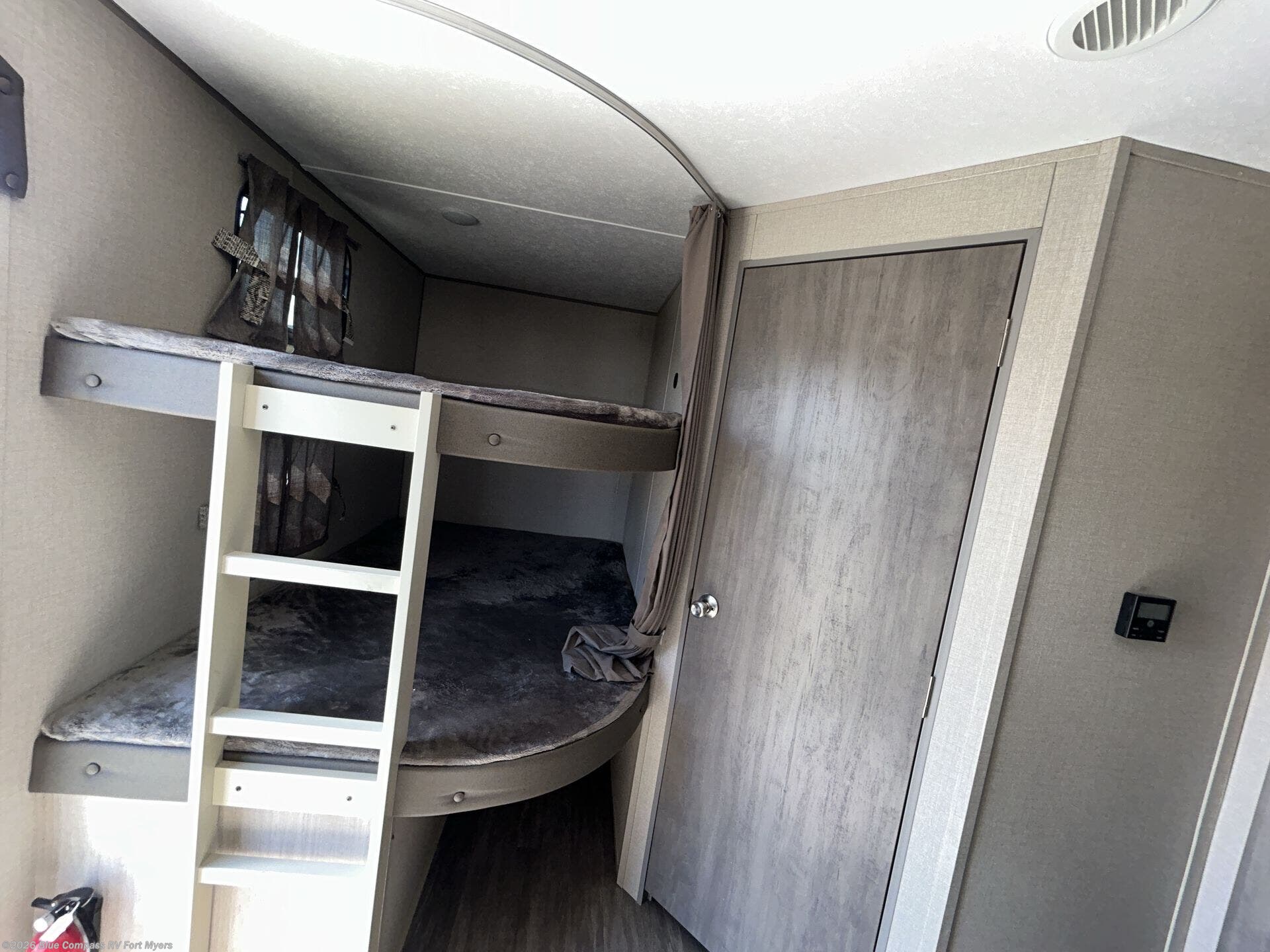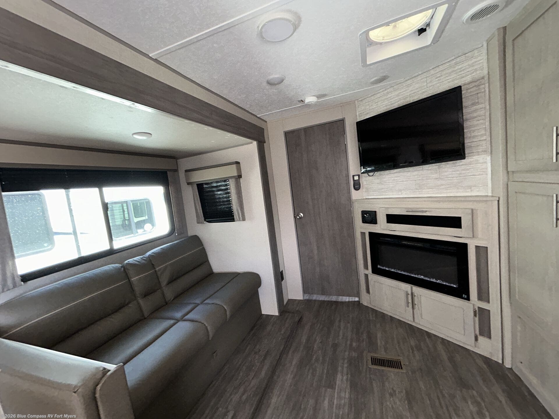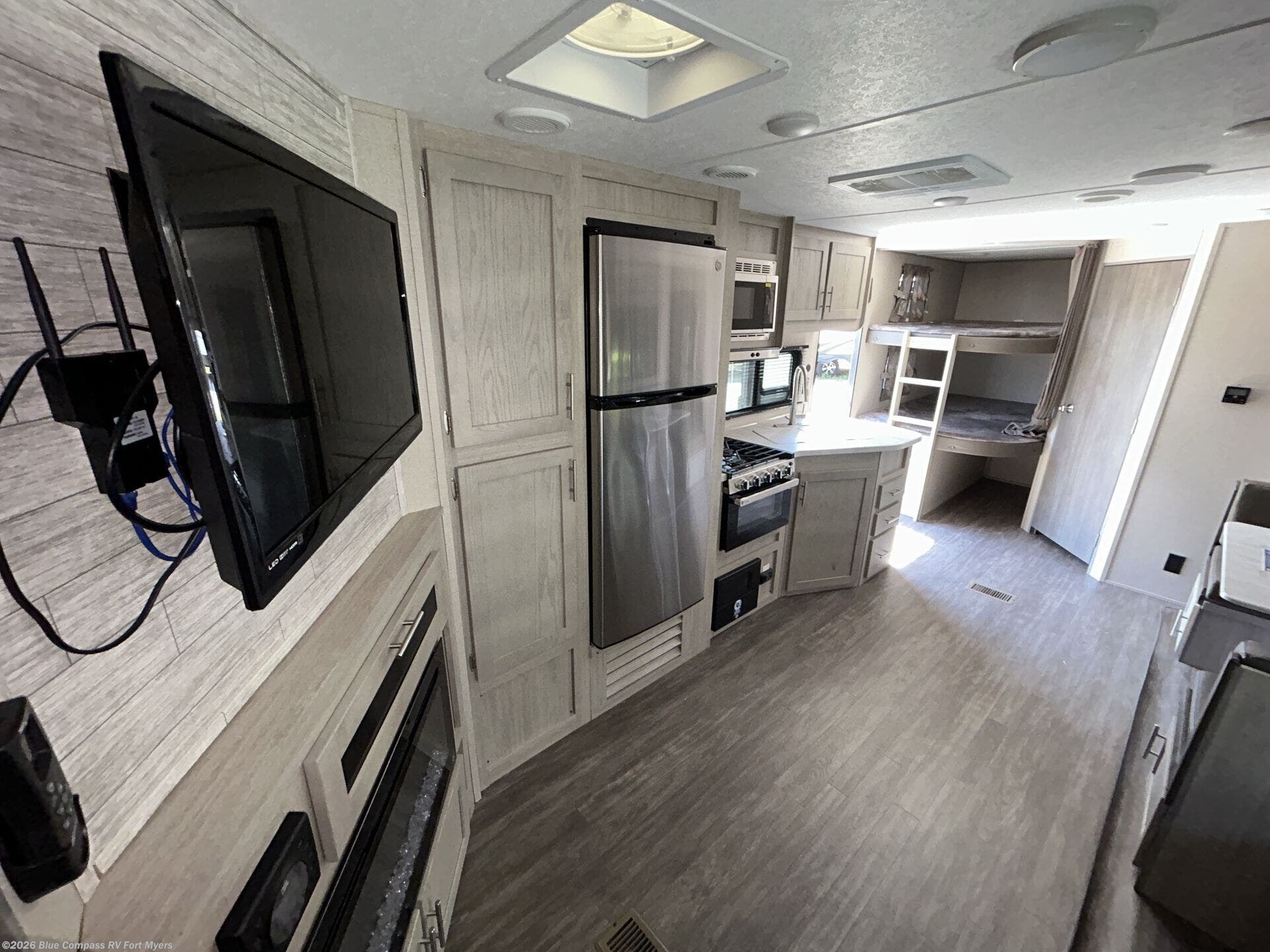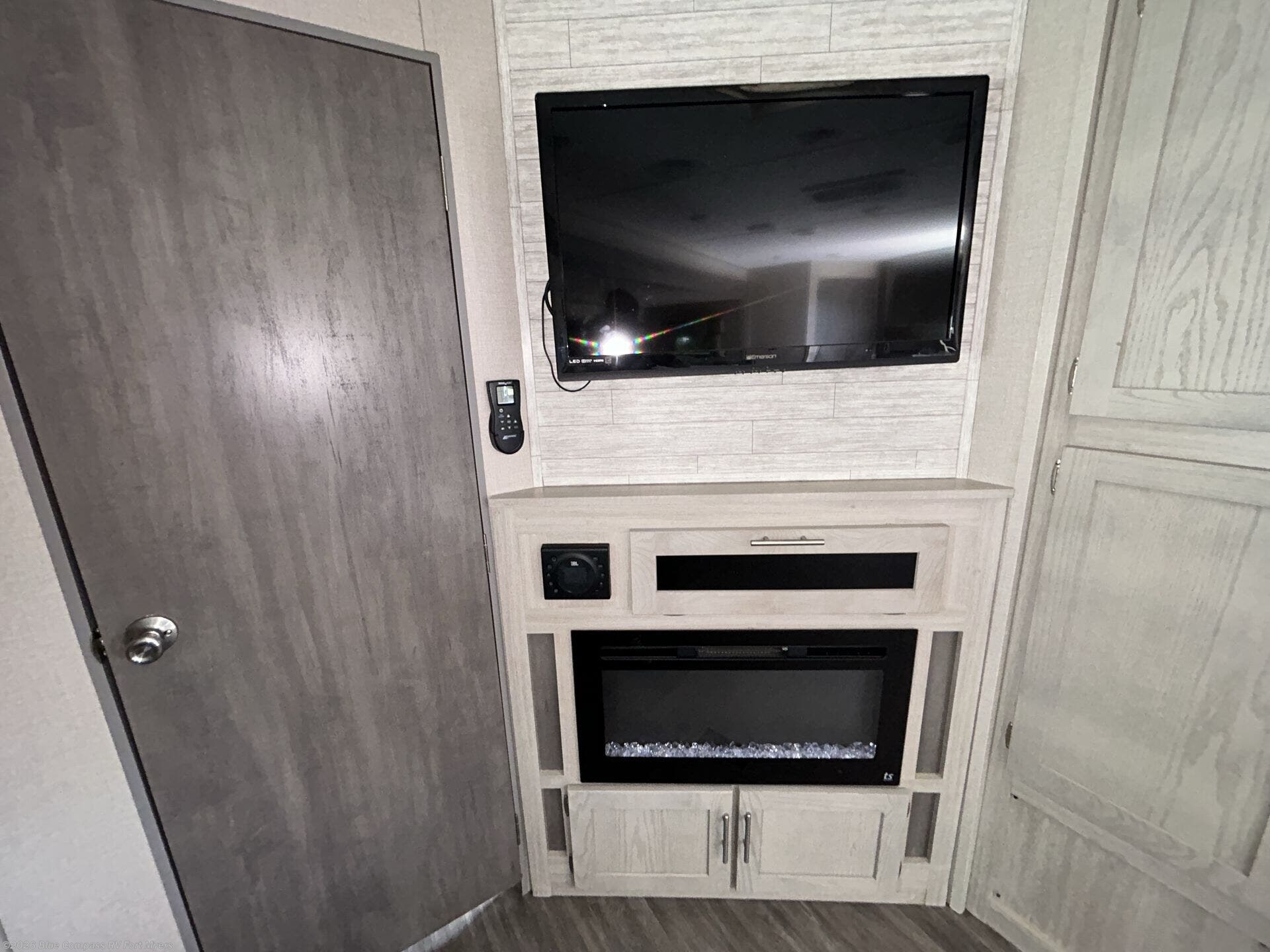 Life is easier in this travel trailer with dual entry doors! One of the entrances leads directly into the front private bedroom which has a 60" x 74" queen bed with wardrobes on either side to hang your clothes and a coat closet. The second entrance is right by the double bed bunks and rear corner bathroom that has a 24" x 40" full tub with skylight above for a shower with a view when you look up. The living area has everything you need for a cozy evening indoors between the sofa with an arm rest/cupholder to set your drink while you enjoy the fireplace at the entertainment center or you can play a few card games at the U-shaped dinette. Cook a sunrise breakfast at the outside camper kitchen with the pull out griddle, a cabinet for storage, and a refrigerator for cold orange juice!