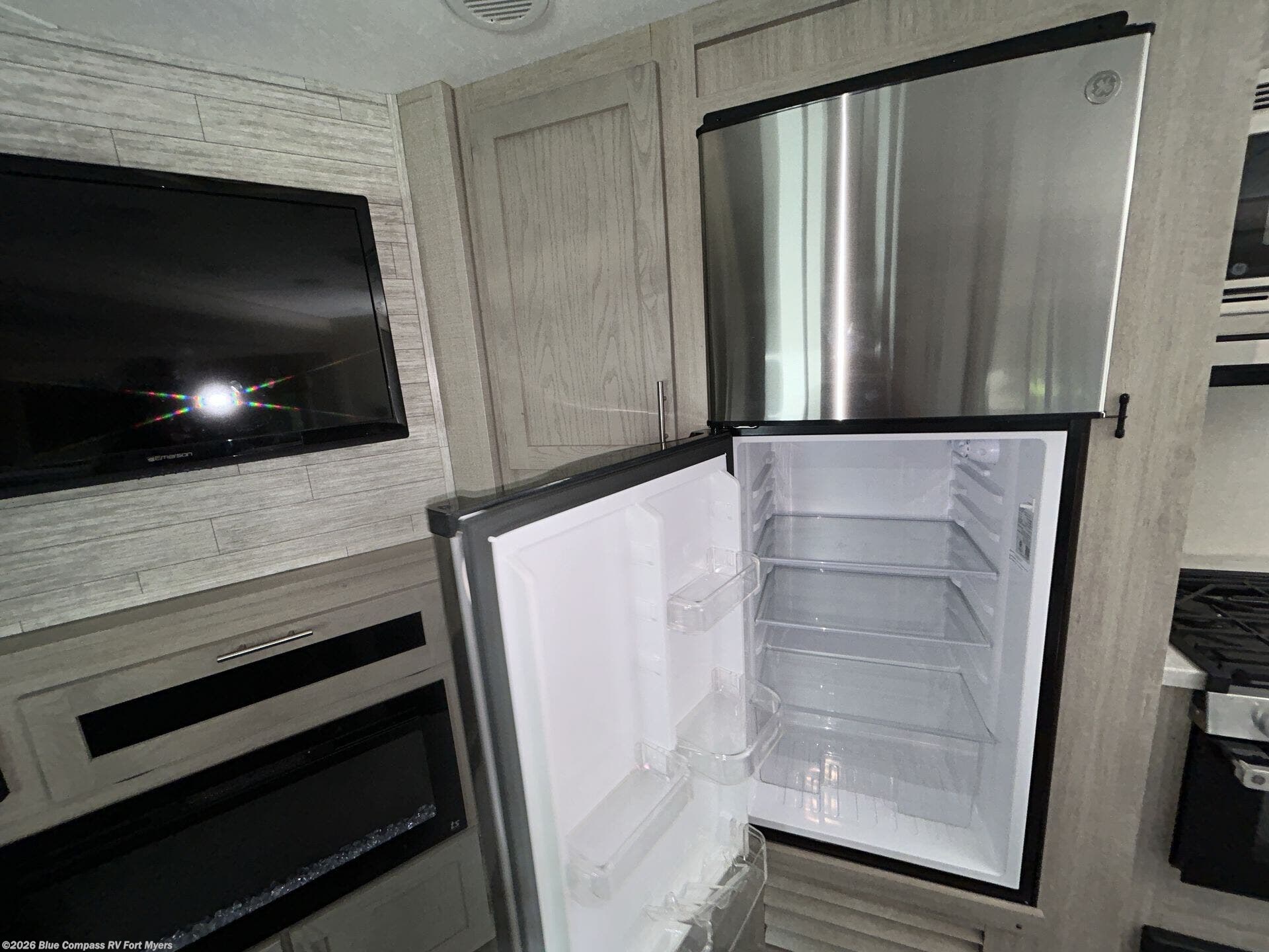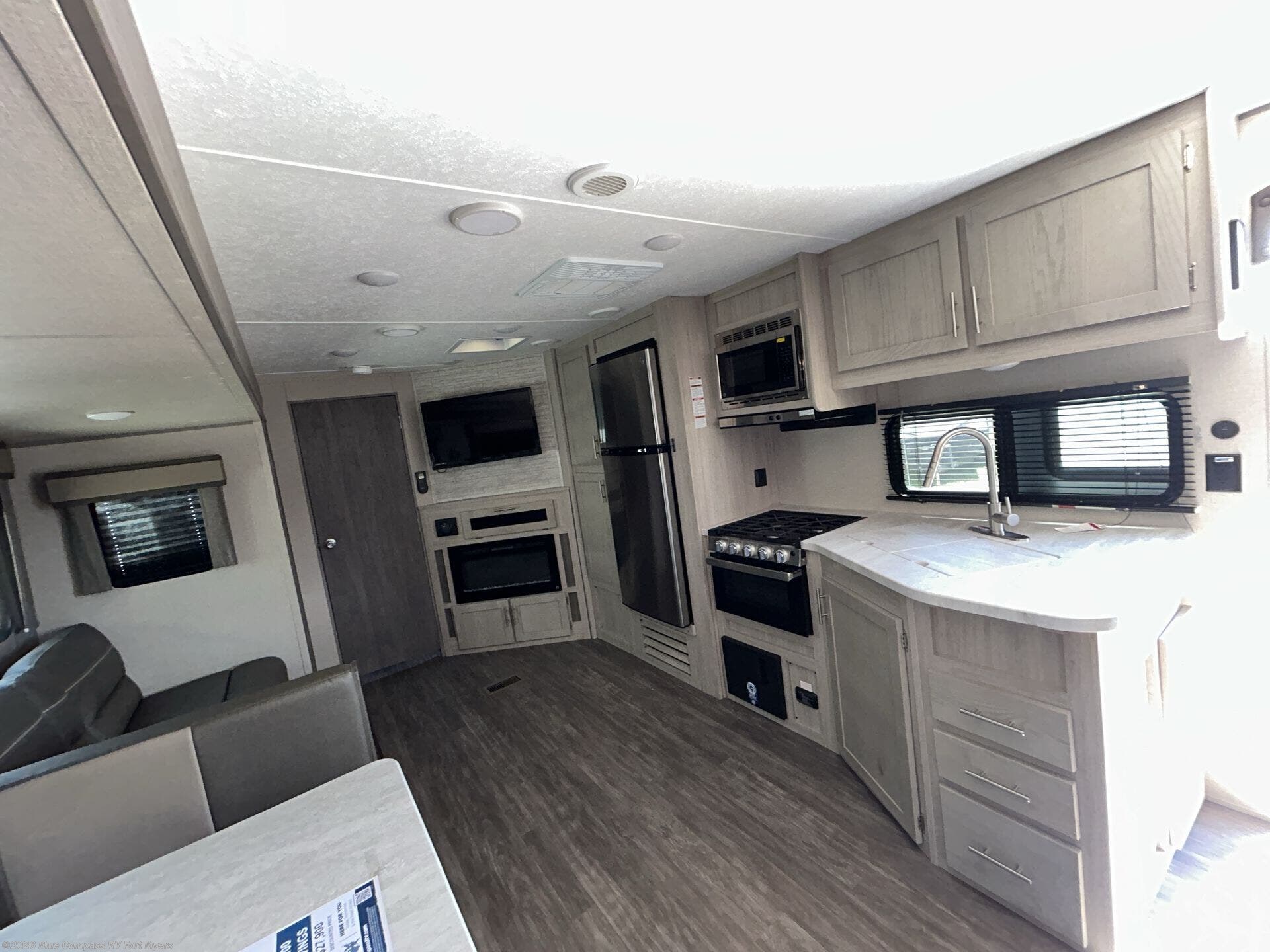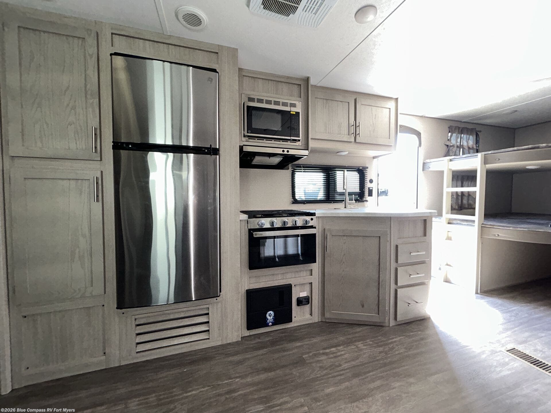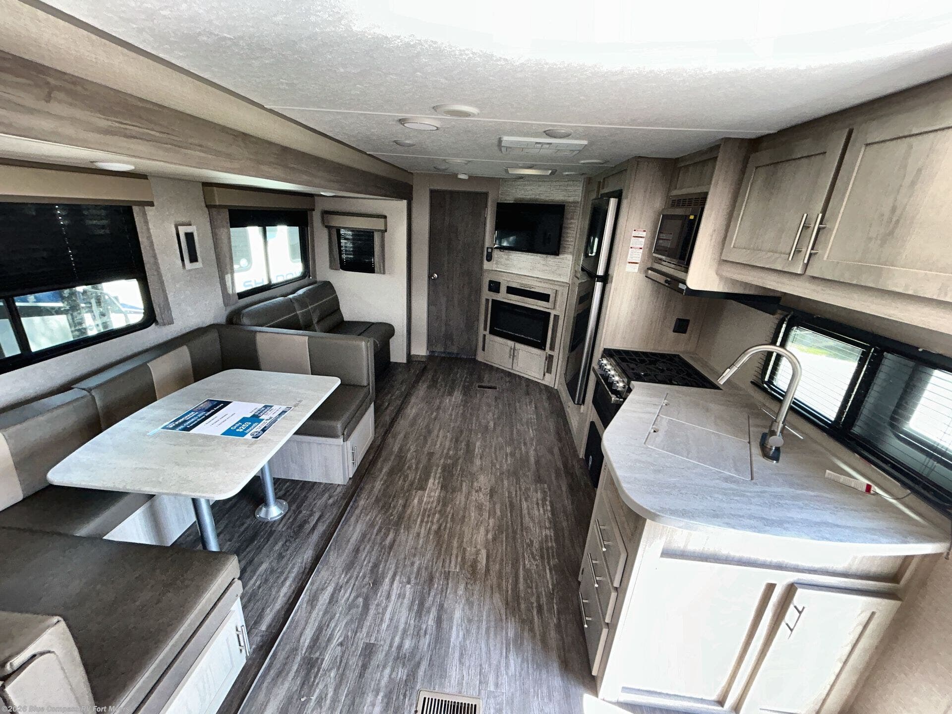 Life is easier in this travel trailer with dual entry doors! One of the entrances leads directly into the front private bedroom which has a 60" x 74" queen bed with wardrobes on either side to hang your clothes and a coat closet. The second entrance is right by the double bed bunks and rear corner bathroom that has a 24" x 40" full tub with skylight above for a shower with a view when you look up. The living area has everything you need for a cozy evening indoors between the sofa with an arm rest/cupholder to set your drink while you enjoy the fireplace at the entertainment center or you can play a few card games at the U-shaped dinette. Cook a sunrise breakfast at the outside camper kitchen with the pull out griddle, a cabinet for storage, and a refrigerator for cold orange juice!