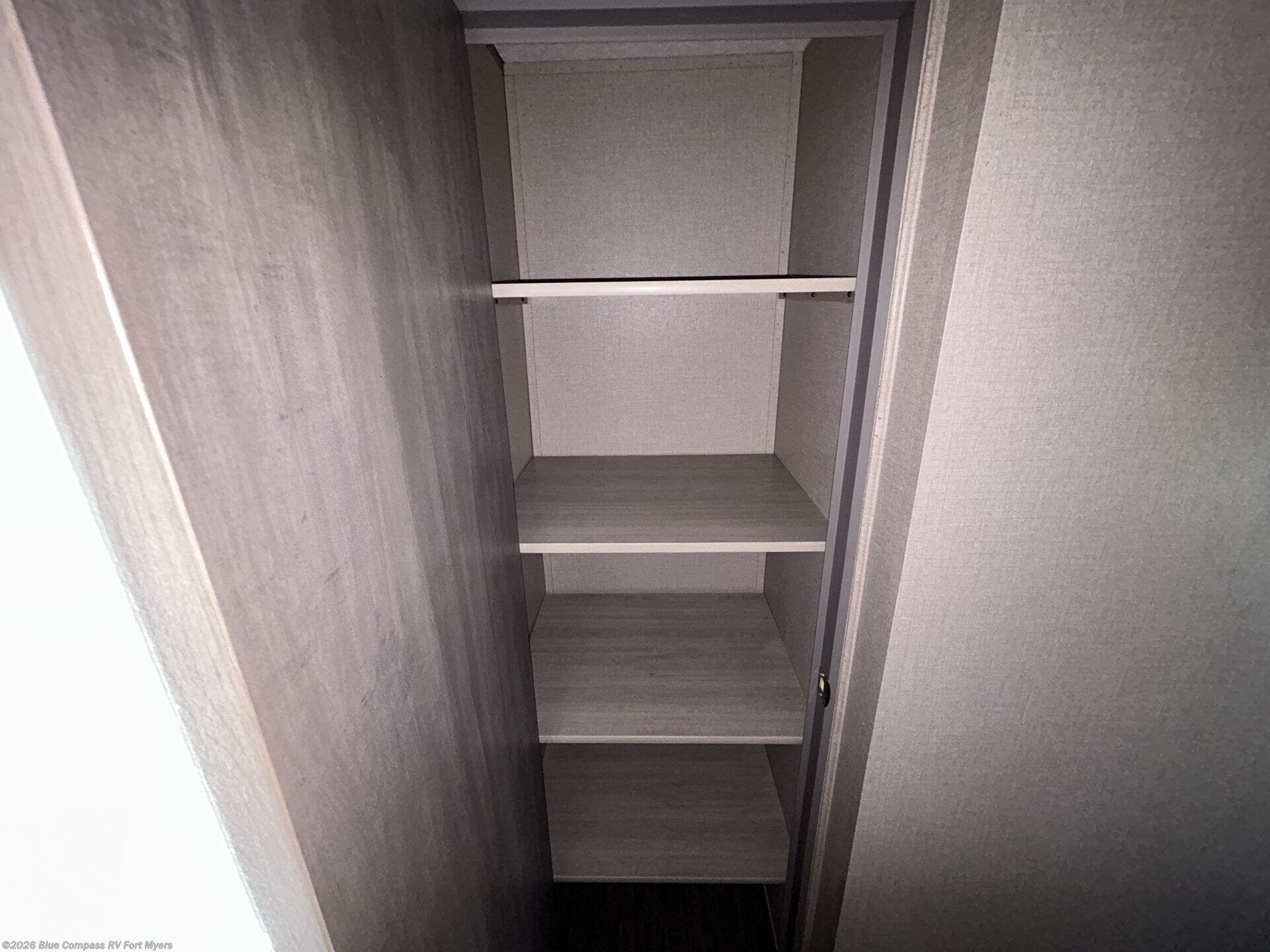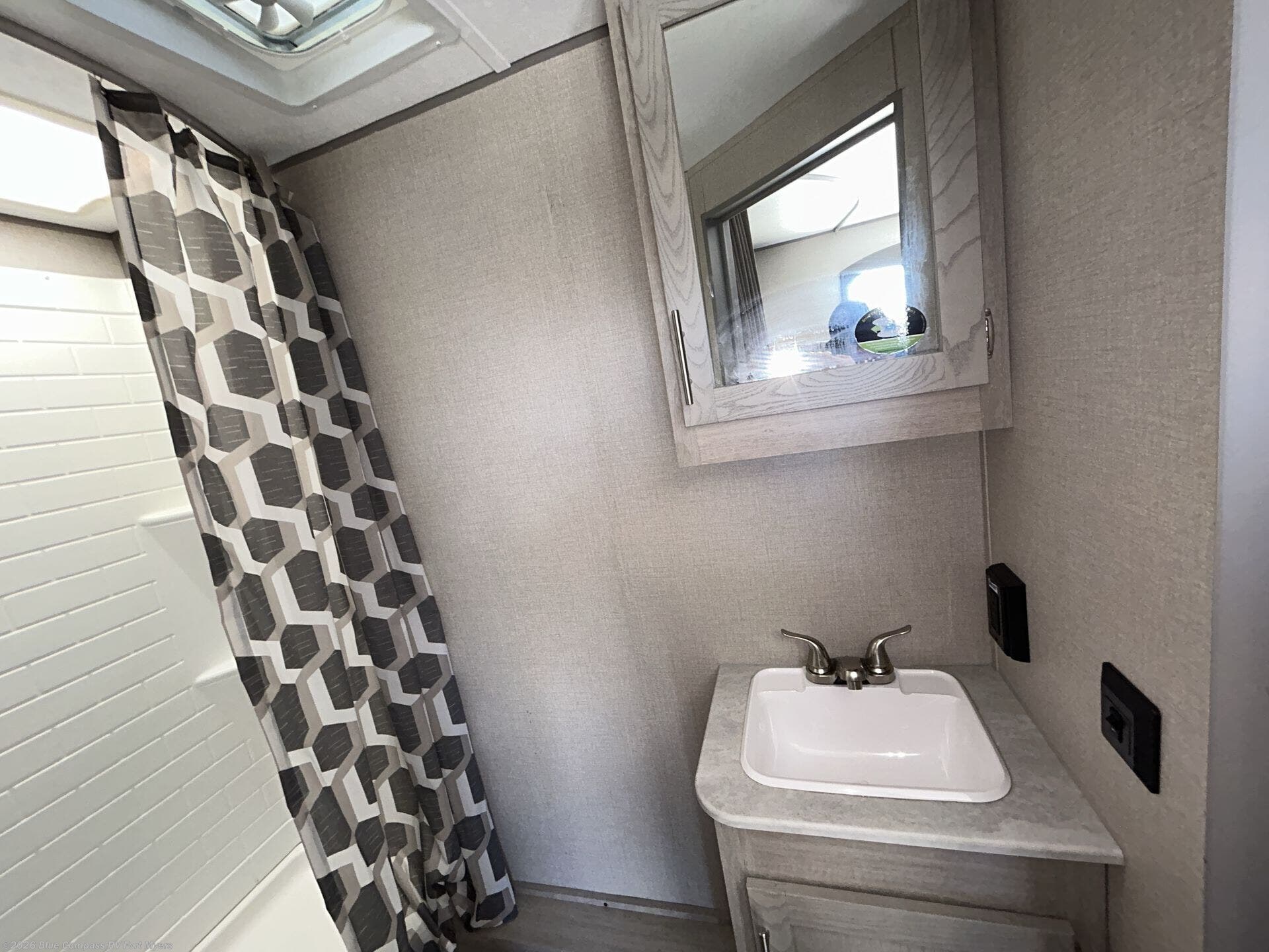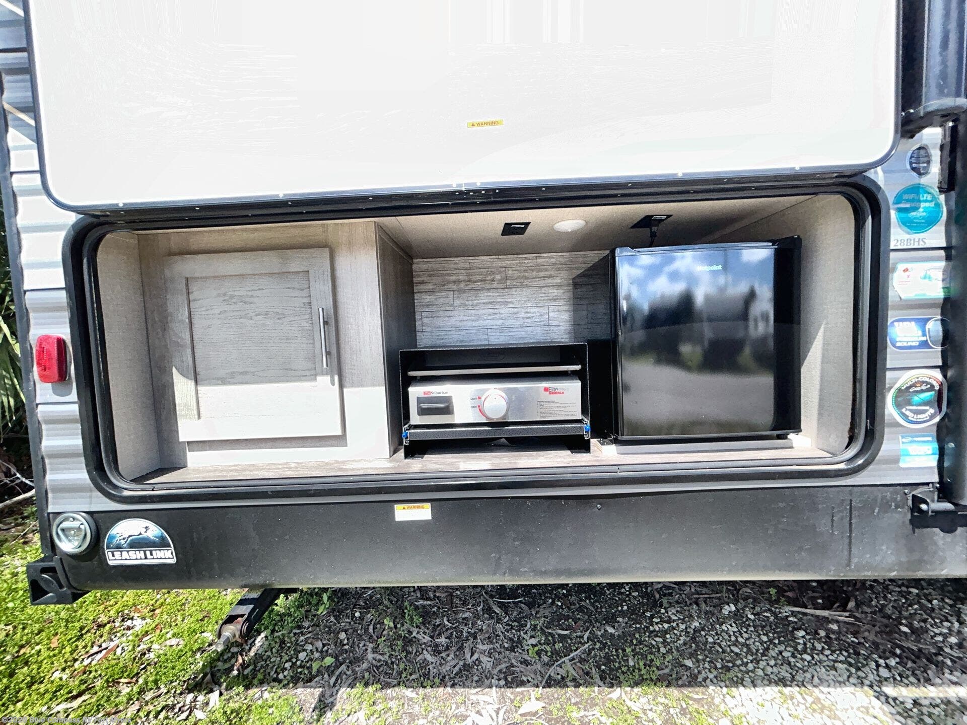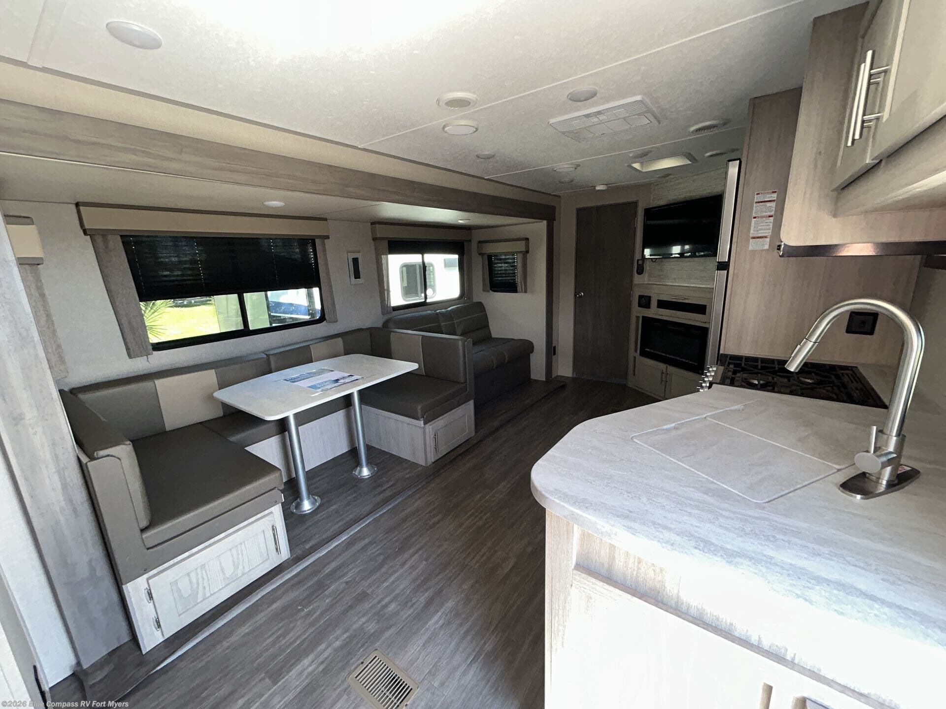 Life is easier in this travel trailer with dual entry doors! One of the entrances leads directly into the front private bedroom which has a 60" x 74" queen bed with wardrobes on either side to hang your clothes and a coat closet. The second entrance is right by the double bed bunks and rear corner bathroom that has a 24" x 40" full tub with skylight above for a shower with a view when you look up. The living area has everything you need for a cozy evening indoors between the sofa with an arm rest/cupholder to set your drink while you enjoy the fireplace at the entertainment center or you can play a few card games at the U-shaped dinette. Cook a sunrise breakfast at the outside camper kitchen with the pull out griddle, a cabinet for storage, and a refrigerator for cold orange juice!
