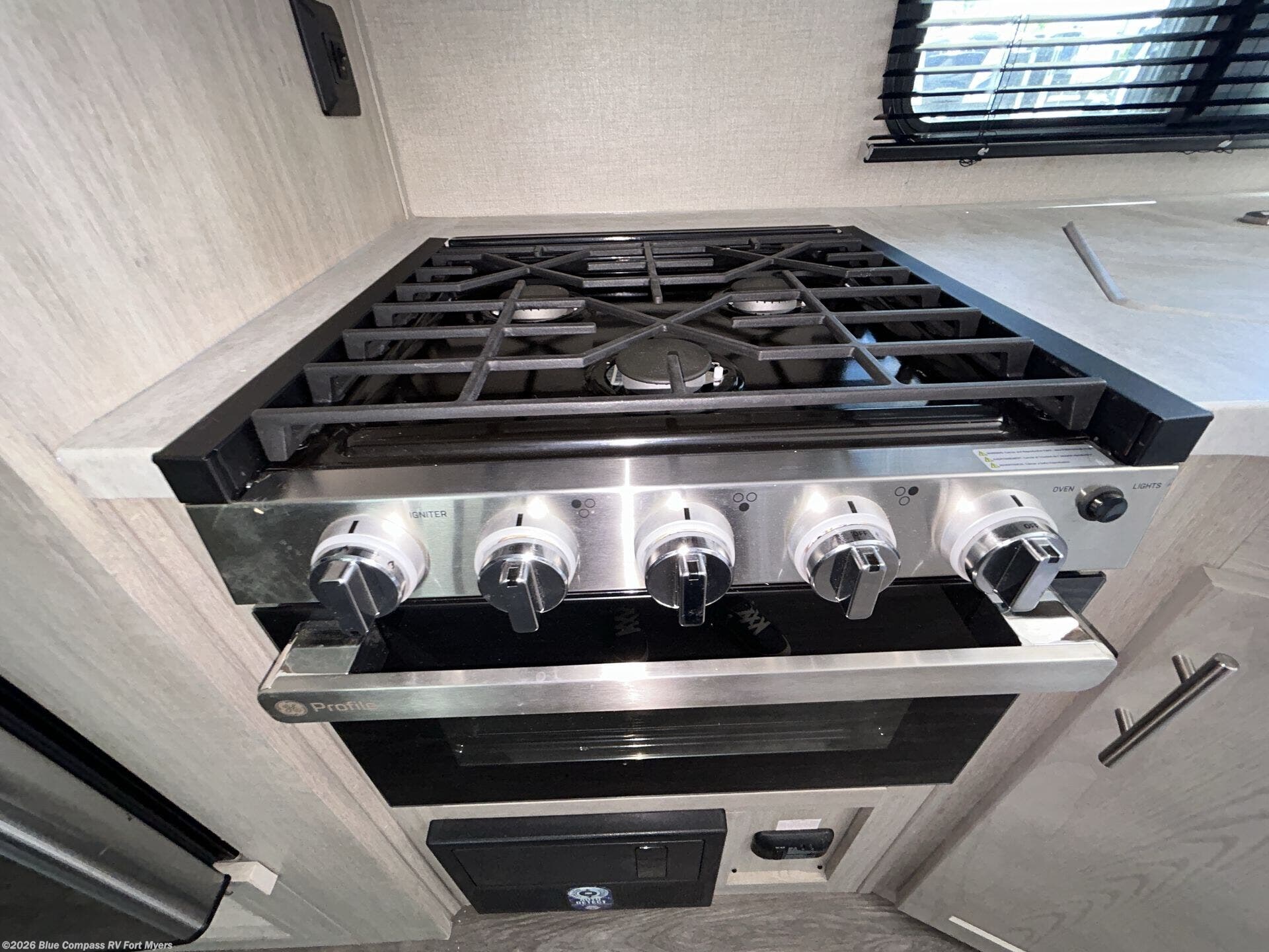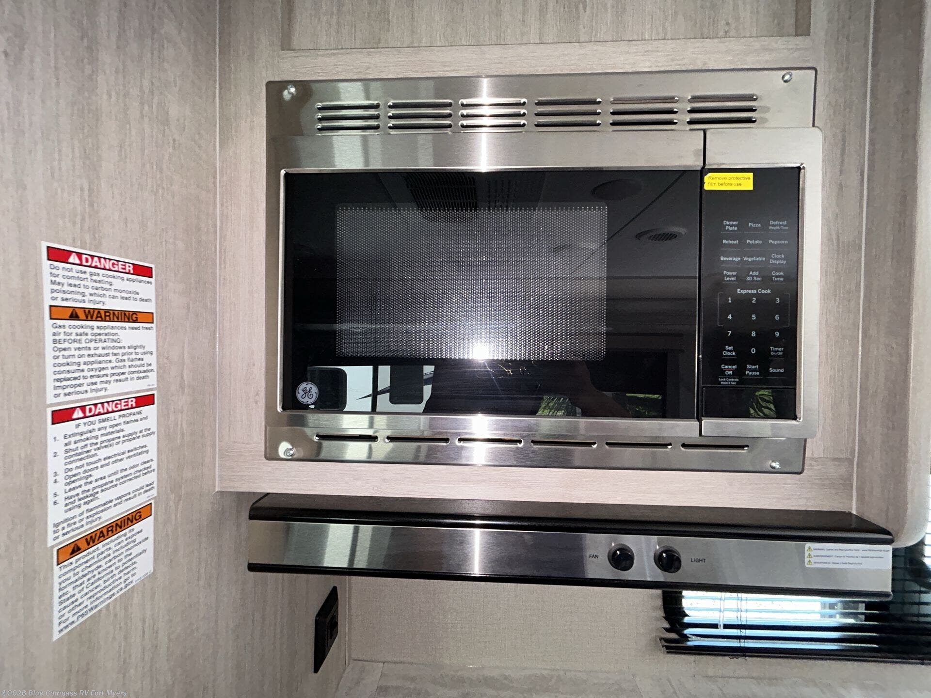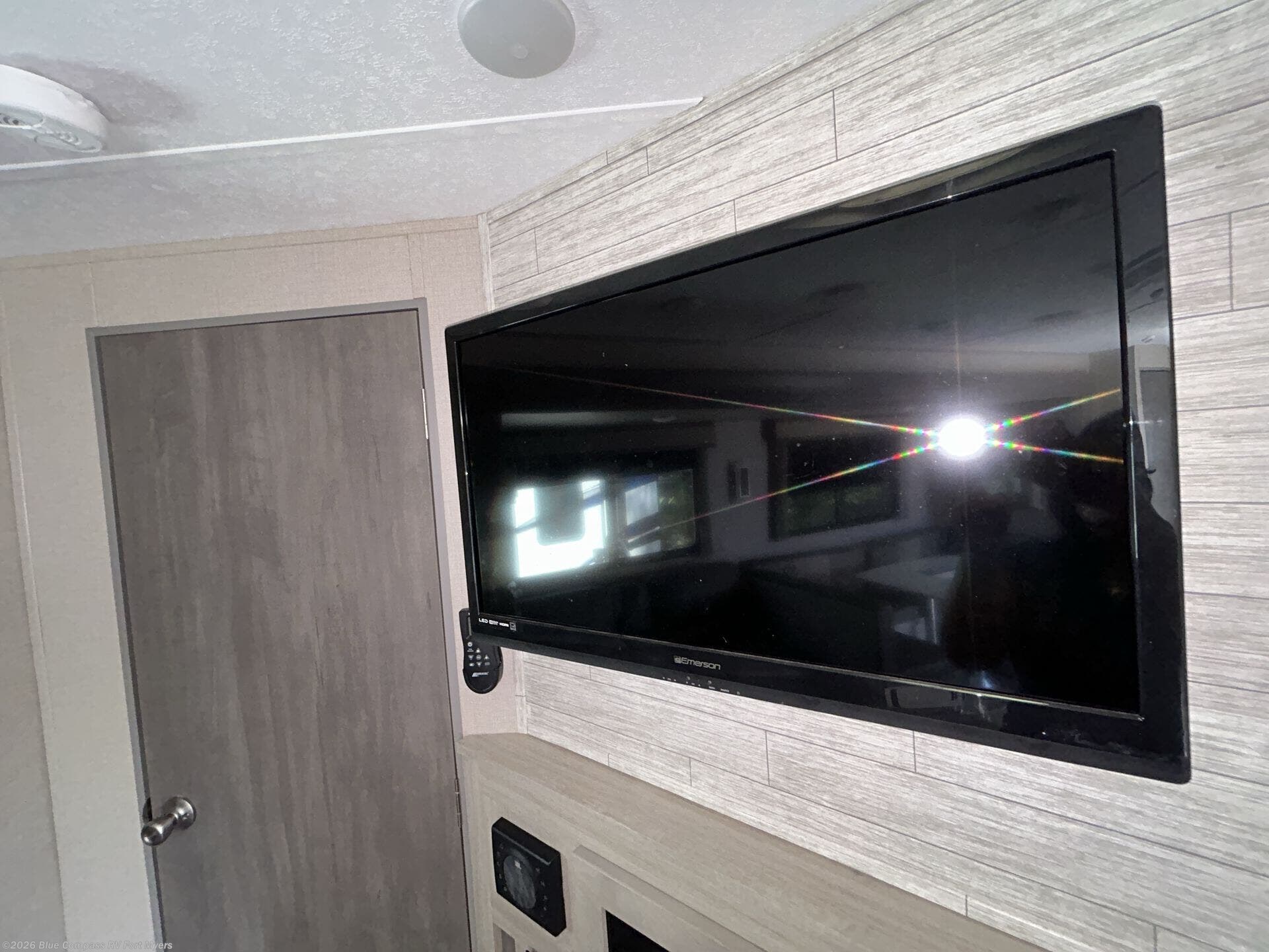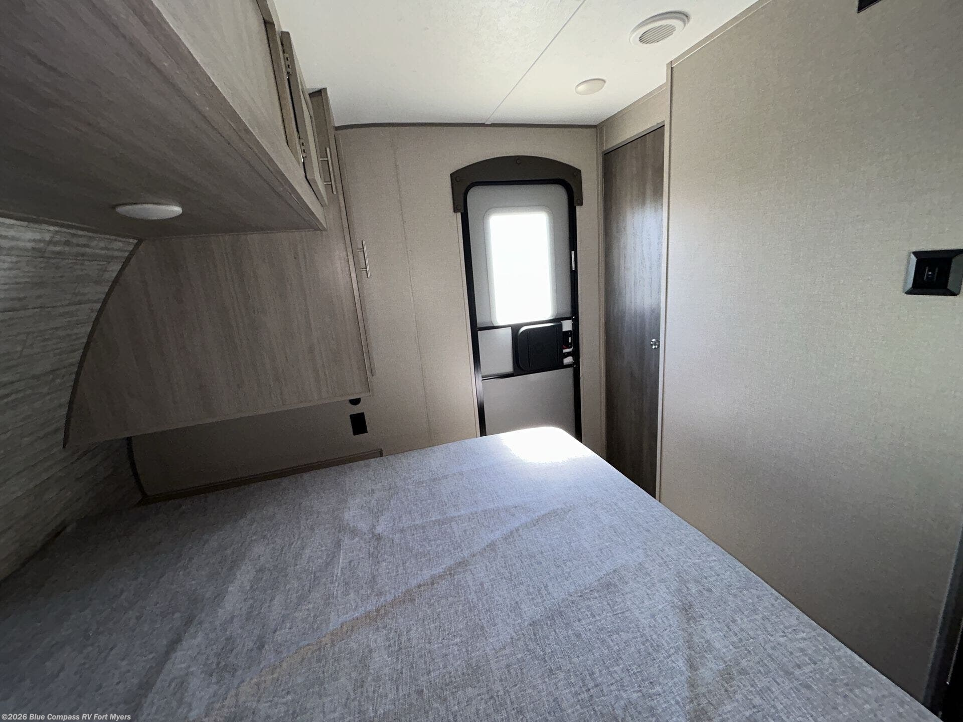 Life is easier in this travel trailer with dual entry doors! One of the entrances leads directly into the front private bedroom which has a 60" x 74" queen bed with wardrobes on either side to hang your clothes and a coat closet. The second entrance is right by the double bed bunks and rear corner bathroom that has a 24" x 40" full tub with skylight above for a shower with a view when you look up. The living area has everything you need for a cozy evening indoors between the sofa with an arm rest/cupholder to set your drink while you enjoy the fireplace at the entertainment center or you can play a few card games at the U-shaped dinette. Cook a sunrise breakfast at the outside camper kitchen with the pull out griddle, a cabinet for storage, and a refrigerator for cold orange juice!