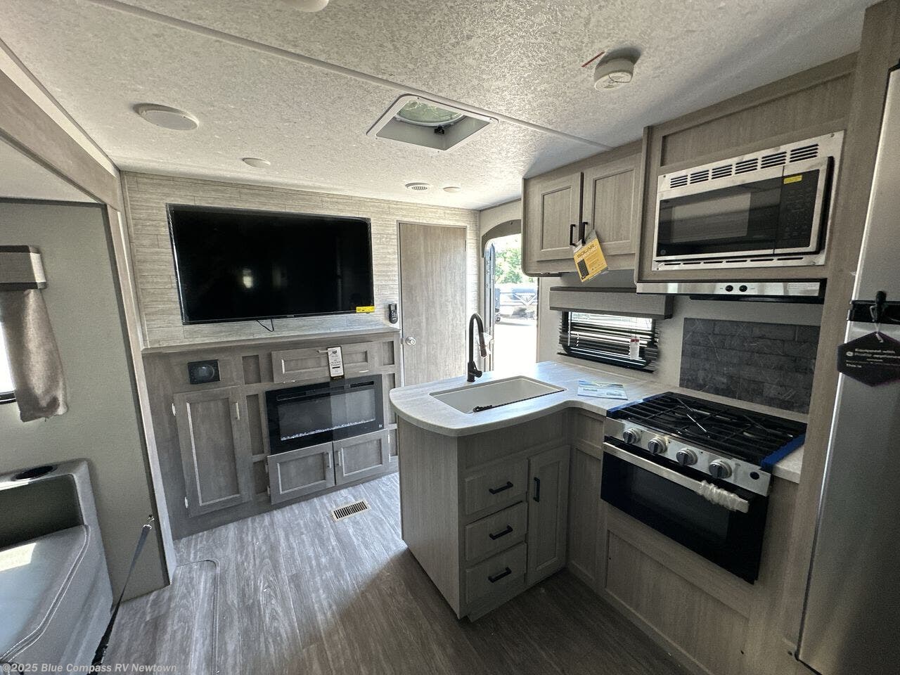 This travel trailer is decked out in convenient features from the dual entry doors to the outside camp kitchen with a sink, a refrigerator, a grill, drawers for your utensils, and overhead cabinets for extra cooking necessities! The rear private bunkhouse has a flip up bunk bed above a cube sofa, a 40" x 74" loft bed with a TV/wardrobe cabinet below it and a wardrobe with drawers next to it to keep everything neatly tucked away. The full bathroom has a 24" x 40" full tub for everyone to freshen up in and an entrance/exit door so you can get back to having fun outside fast. You can prepare your best meals with the three burner cooktop then enjoy them at the U-shaped dinette and let your stomach settle afterwards on the jiffy sofa near the entertainment center with a fireplace!