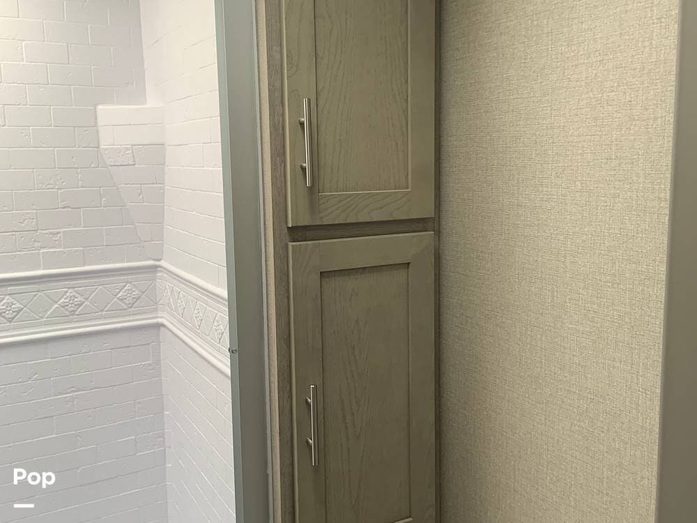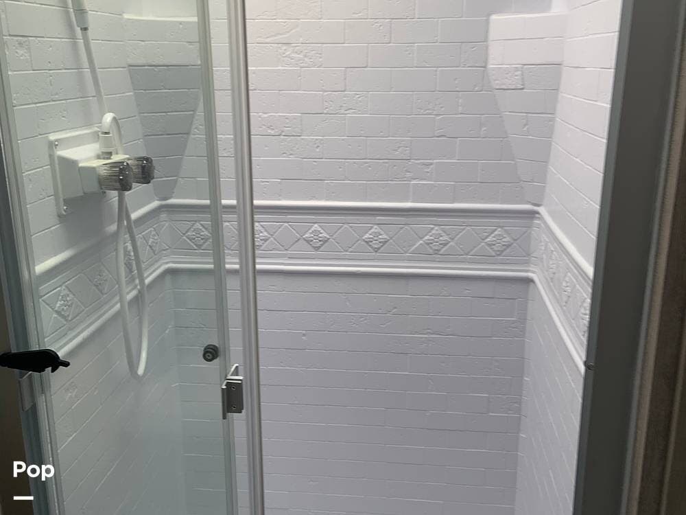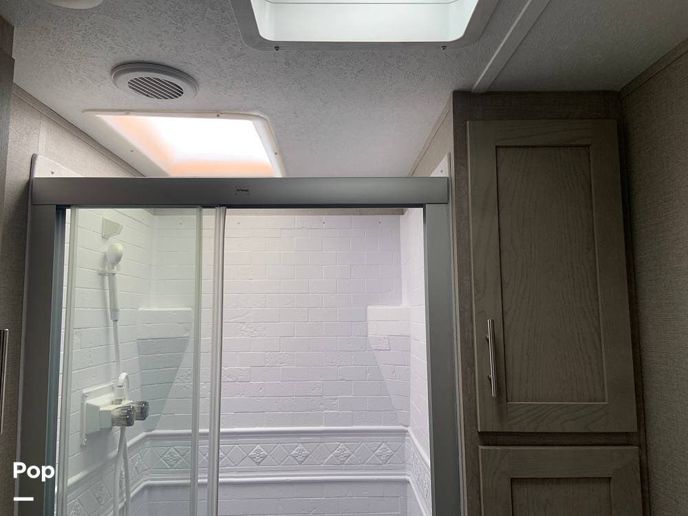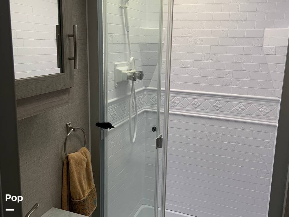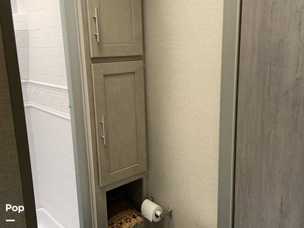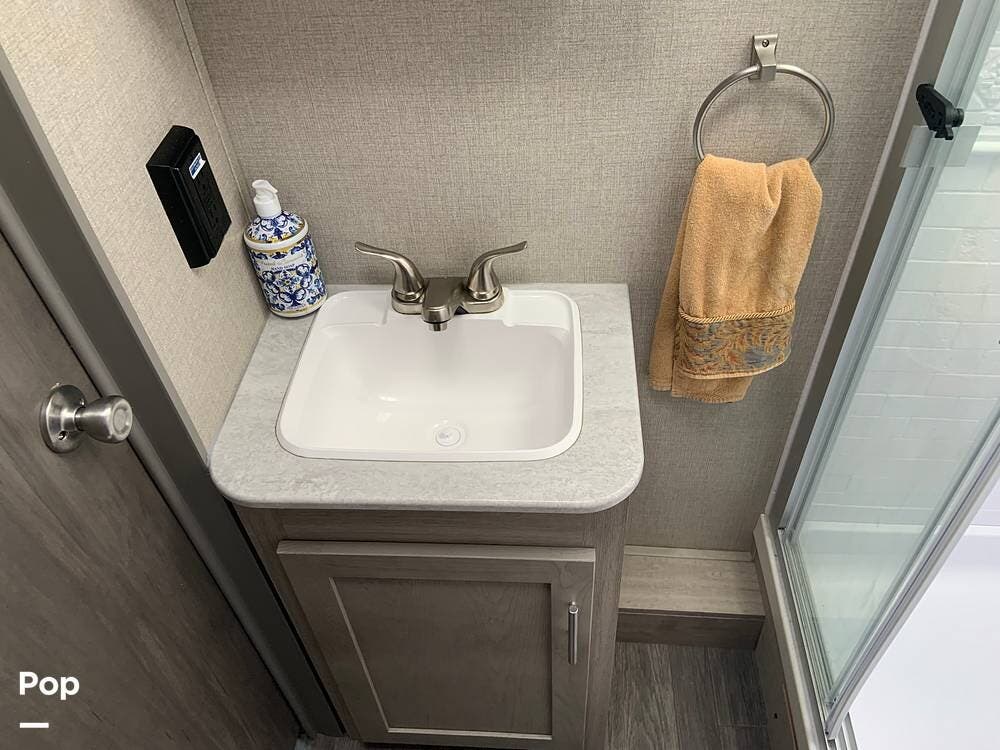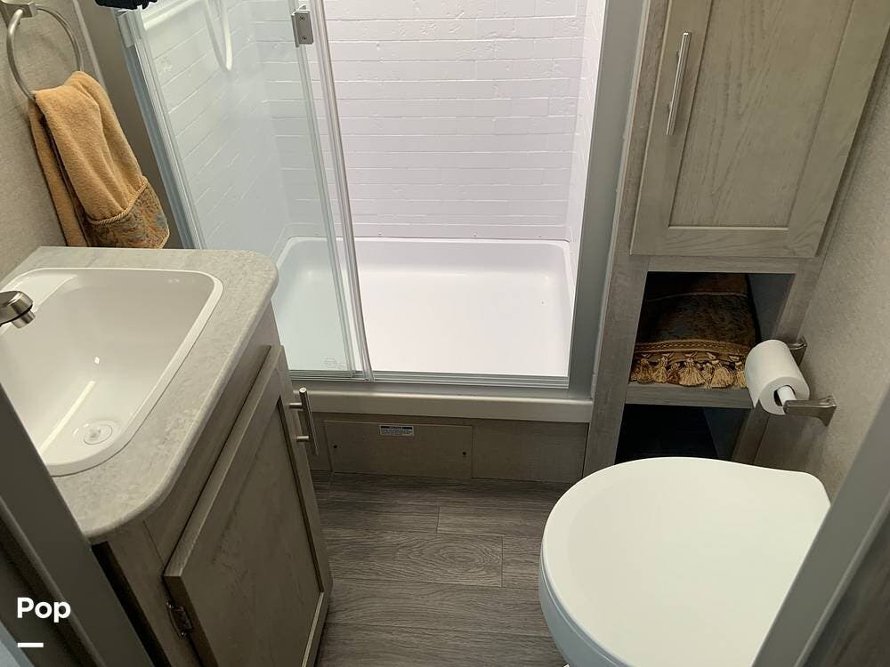 Moving toward the front of the camper, you have a full bath in the hall that offers a large shower with vanity sink, toilet, and cabinetry to accommodate your towels, toiletries, and other personal items.