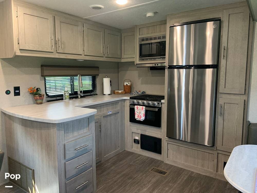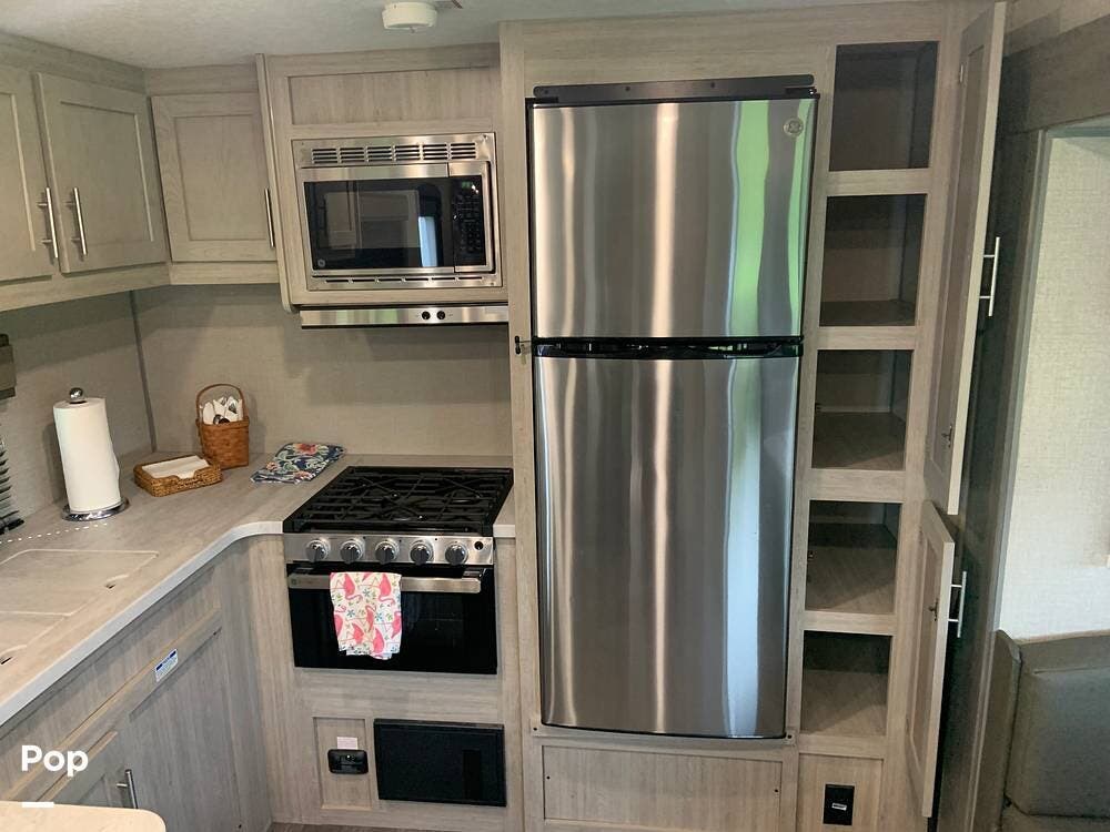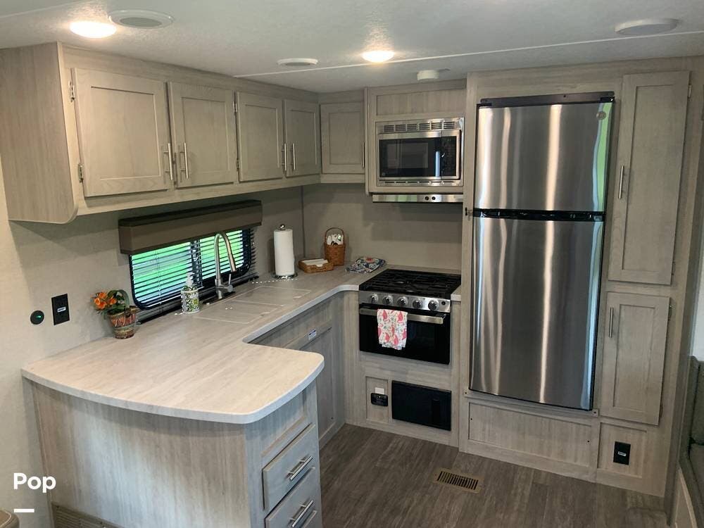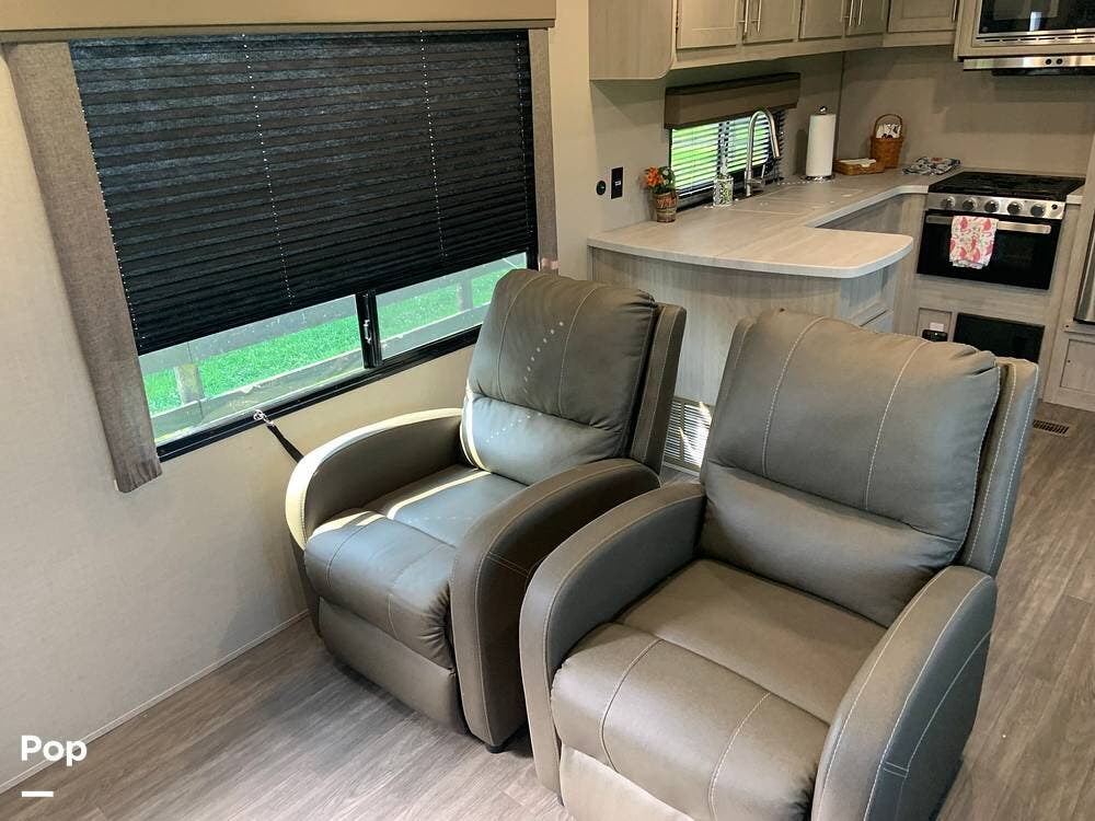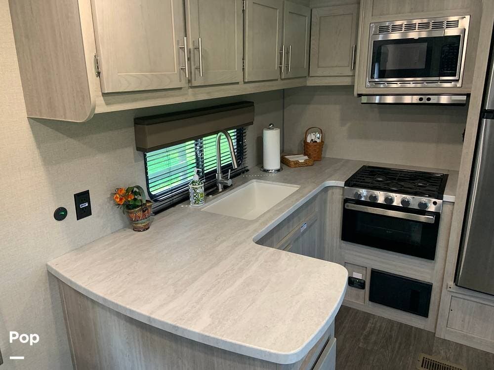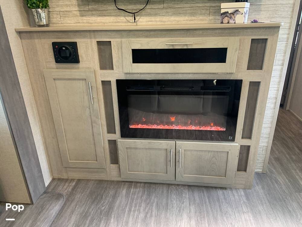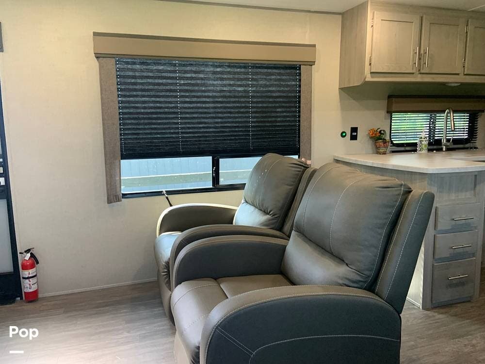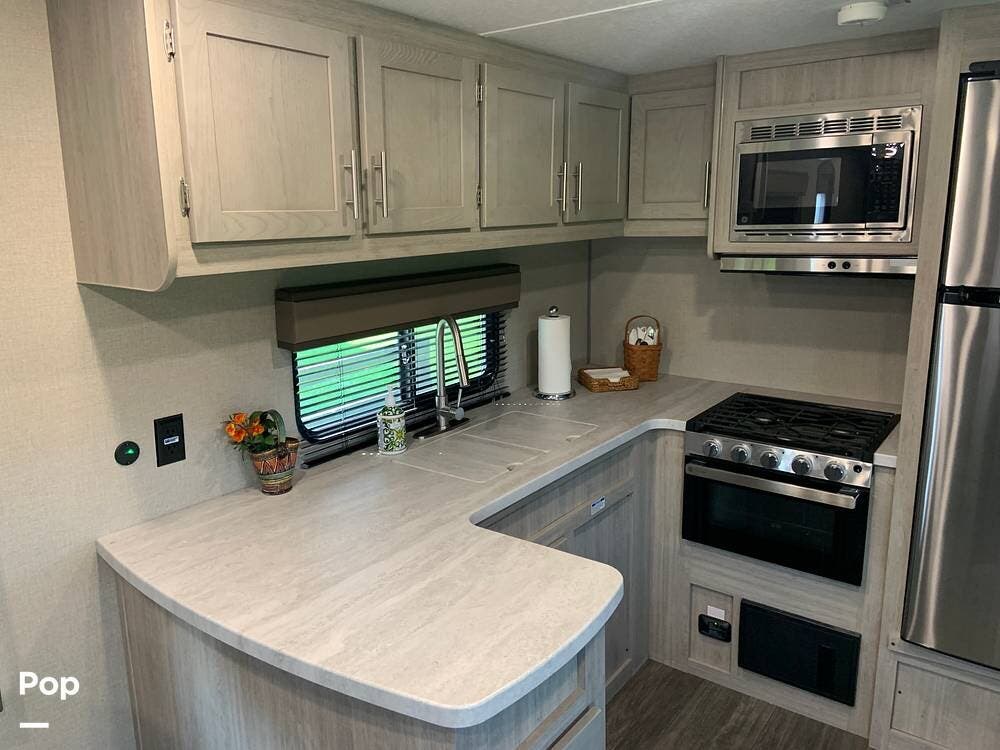 This very lightly used 310KDS will delight with its light, bright, and spacious interior featuring a rear kitchen floorplan, a queen master, two fireplaces, and an exterior kitchen.