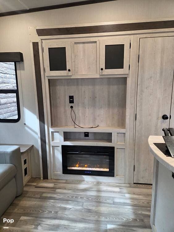 The interior features also include overhead storage cabinets, a freestanding dining table with chairs, an electric fireplace, and TV preps.