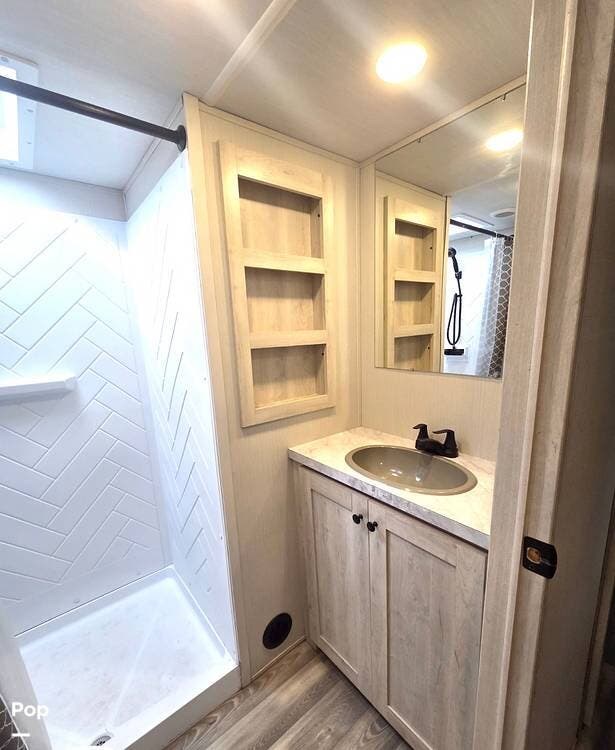 It is prepared for residential amenities, including washer/dryer hookups in the bedroom area, a tankless water heater, and insulated holding tanks with heat pads.