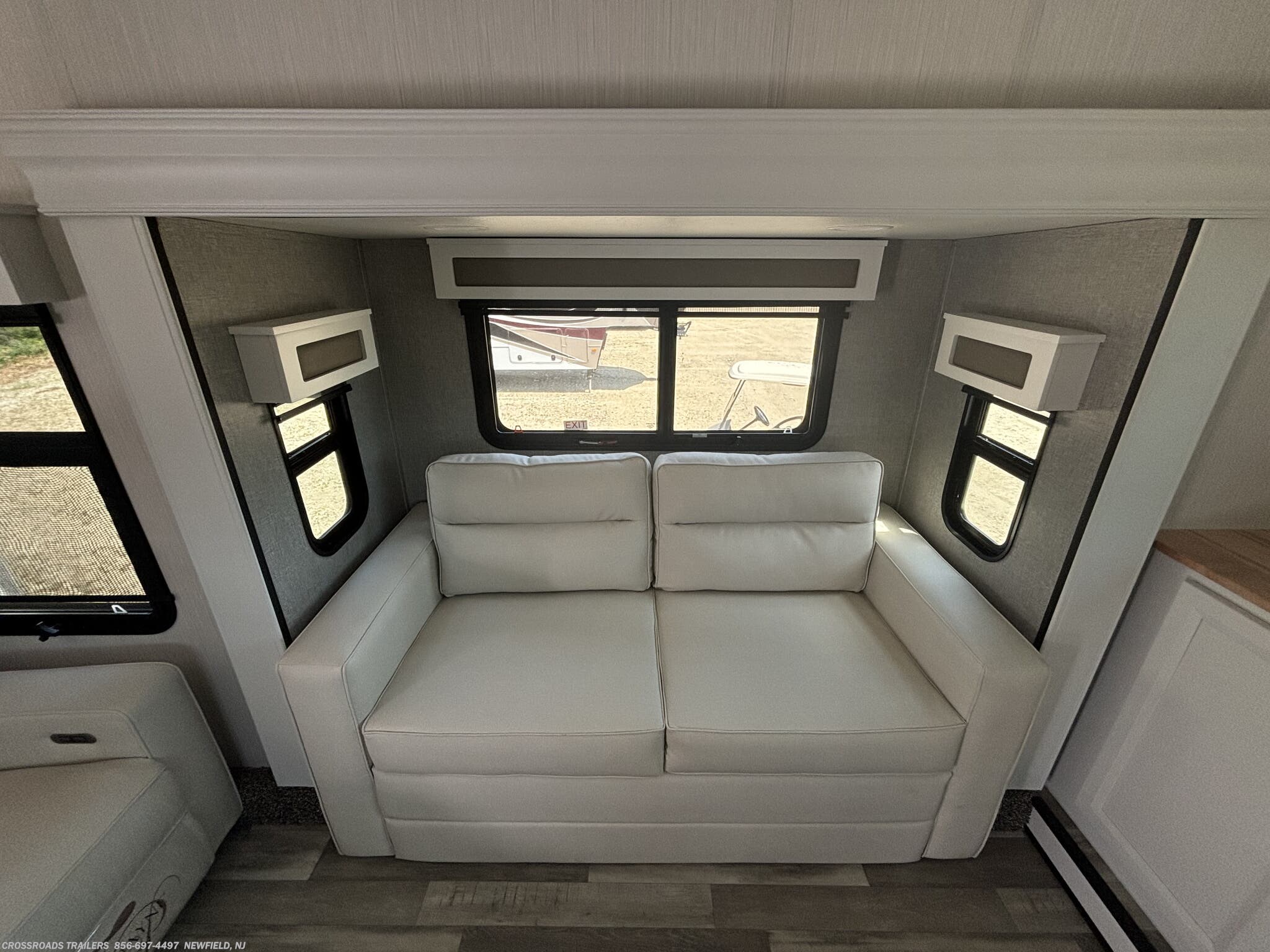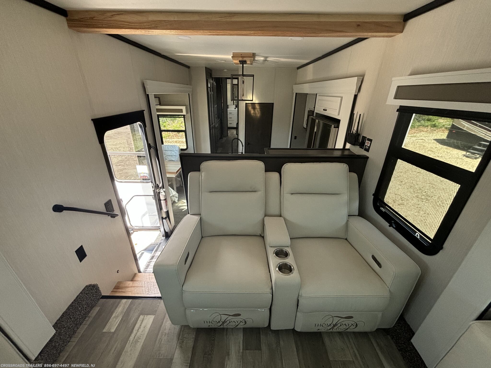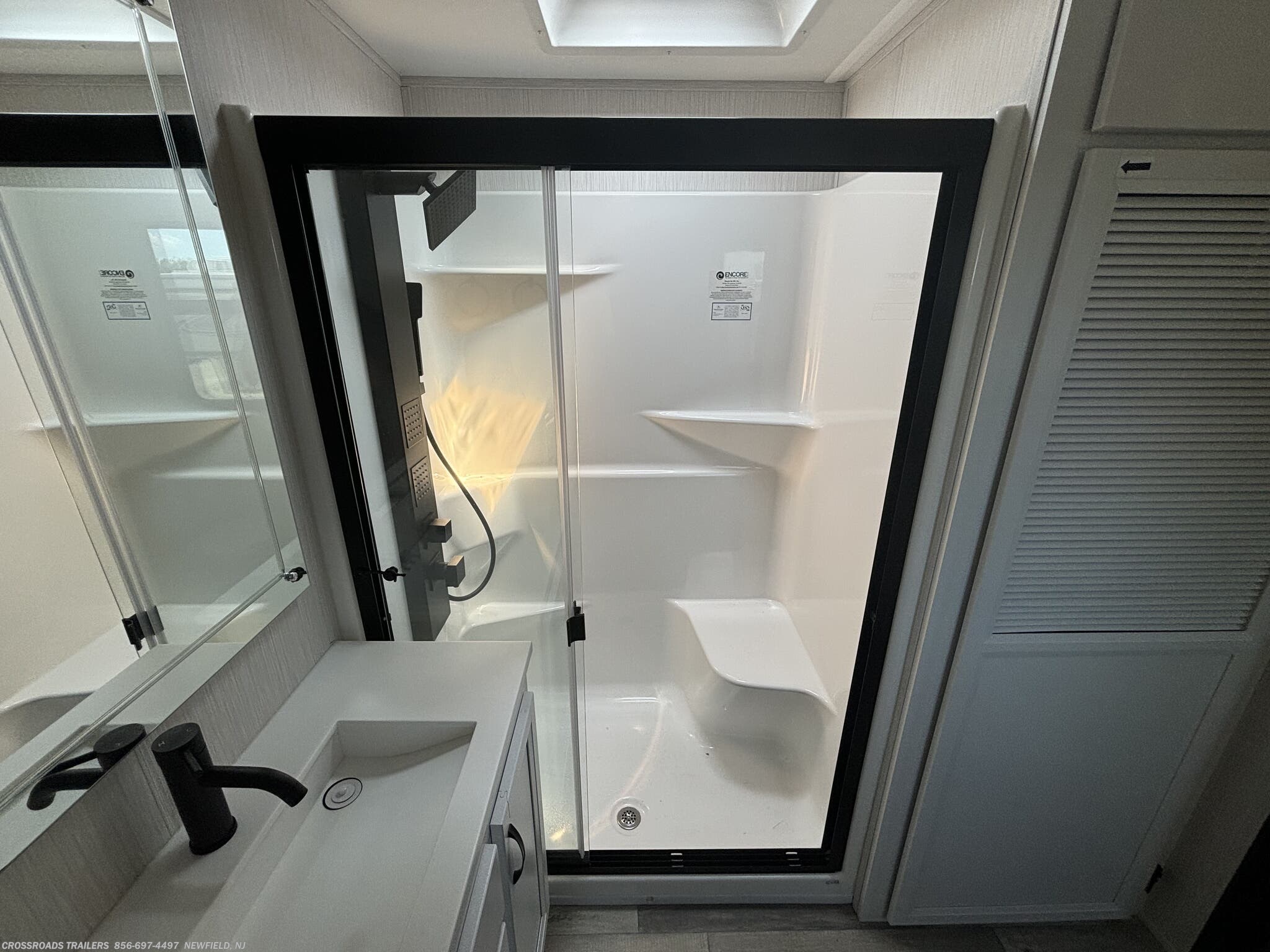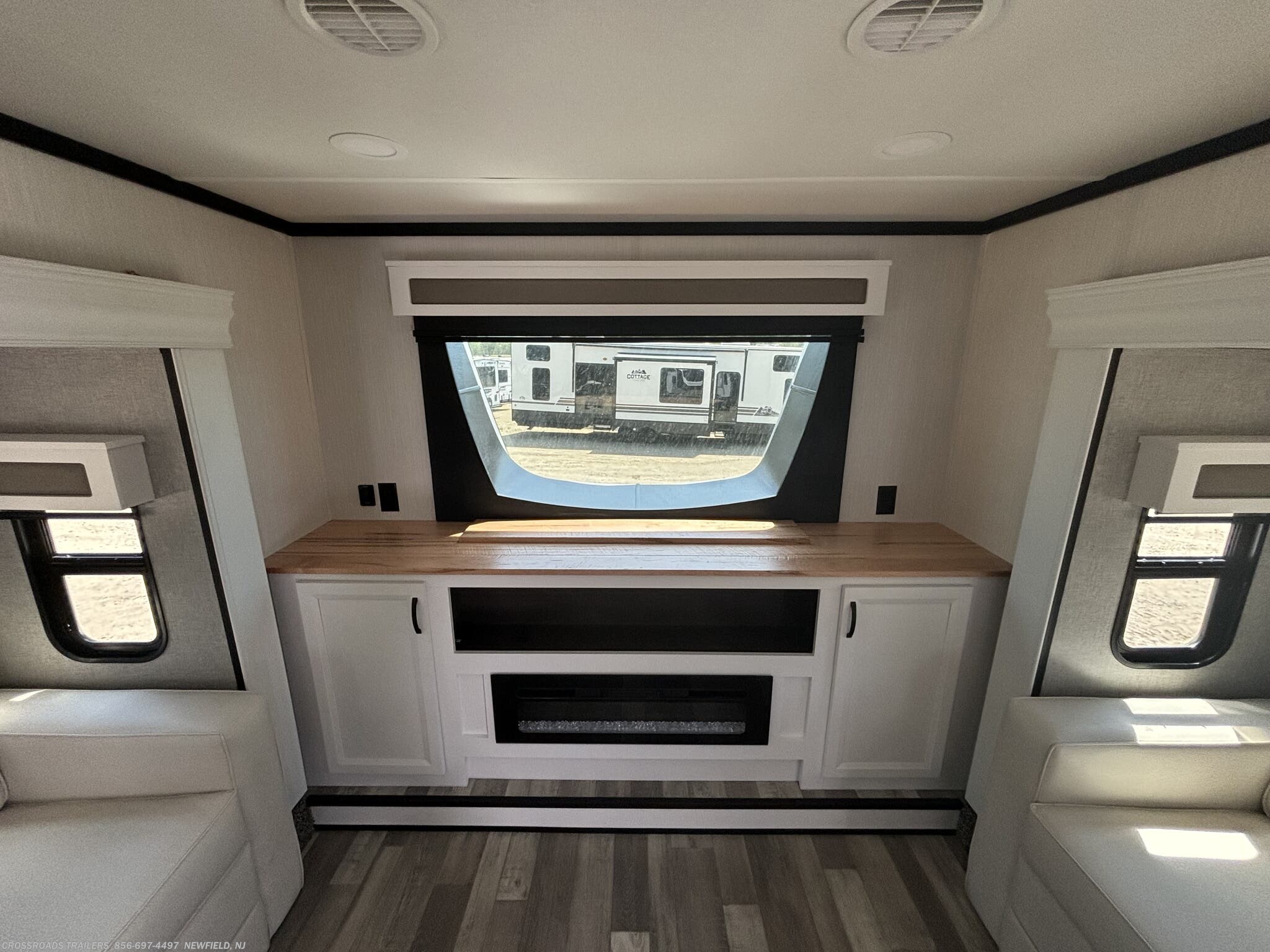 The Cedar Creek is equipped with two powerful air conditioners, along with a power roof vent and skylight that promote excellent ventilation and natural light. Safety and security are prioritized with detectors for carbon monoxide, LP gas, smoke, and a central vacuum system for easy cleaning. Additional comfort features include a fireplace adds warmth and ambiance during chilly nights, while the bathroom includes a shower and toilet. The interior design emphasizes quality and convenience with a medicine cabinet, roof vents, and well-placed storage options.