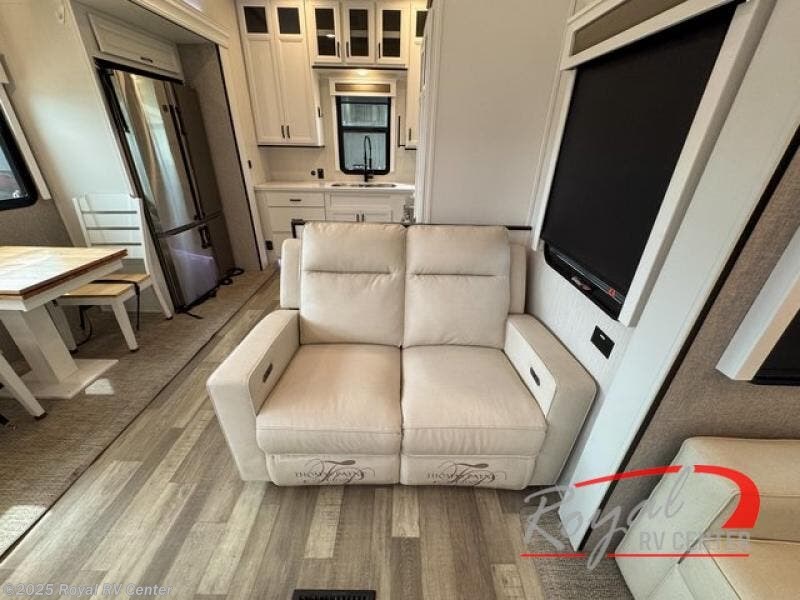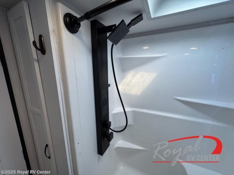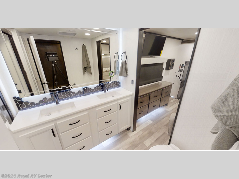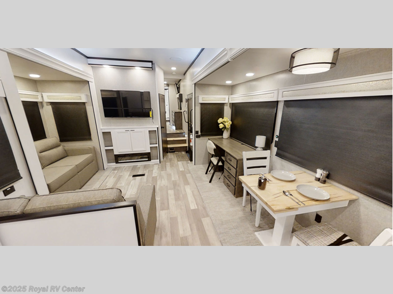 If you need to get some work done while you are camping in this fifth wheel then you will appreciate the desk with a chair! The rear kitchen has plenty of countertop space and a free standing 24" gas range for you to prepare your best meals, a 20 cu. ft. stainless steel electric refrigerator with an ice maker to store any leftovers, and a free standing table to enjoy your meals then play card games. The hide-a-bed sofa slide opens up the living area which also has power theater seating with USB charging across from an entertainment center with a fireplace and 50" flat screen TV. The half bathroom has an area prepped to add an optional washer and dryer so you can have clean clothes throughout your entire trip. Inside the master suite is a king bed slide and access to the front full bathroom which has a walk-in closet with a bench, a 48" x 30" shower with a seat, and a dual sink vanity for two to get ready at once. You can even choose to add the optional pull-out party kitchen to cook your meals while breathing in fresh air!
