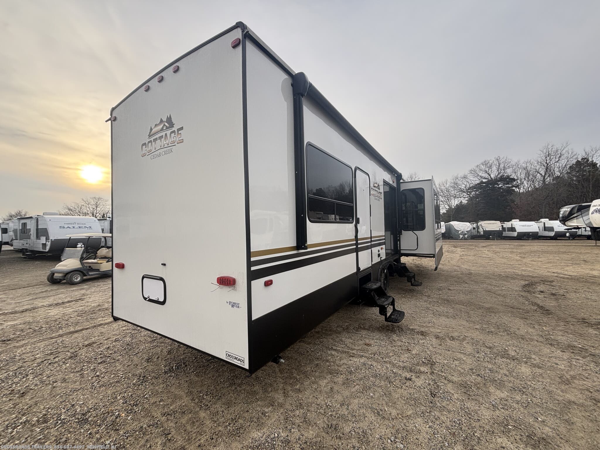 Enjoy your RV travels in style with this 2023 Forest River Cedar Creek Cottage 40CCK. Ready to be a proud Forest River owner? This 2023 Forest River Cedar Creek Cottage 40CCK is the perfect fit. The sleep capacity allows you to bring up to 4 along on your travels in this rig. With three slides, this rig feels roomy and spacious inside. Entertain or cook up a cozy meal just for you in this RV kitchen equipped with the fridge, oven, stove. Kick back and relax in the living area with the TV. If you like your rig cool in the summer and warm in winter, this heating option can do the trick. Go longer without filling up thanks to the 75 gallon fresh water tanks. The exterior features make camping a breeze, such as awning, power awning and slideout.