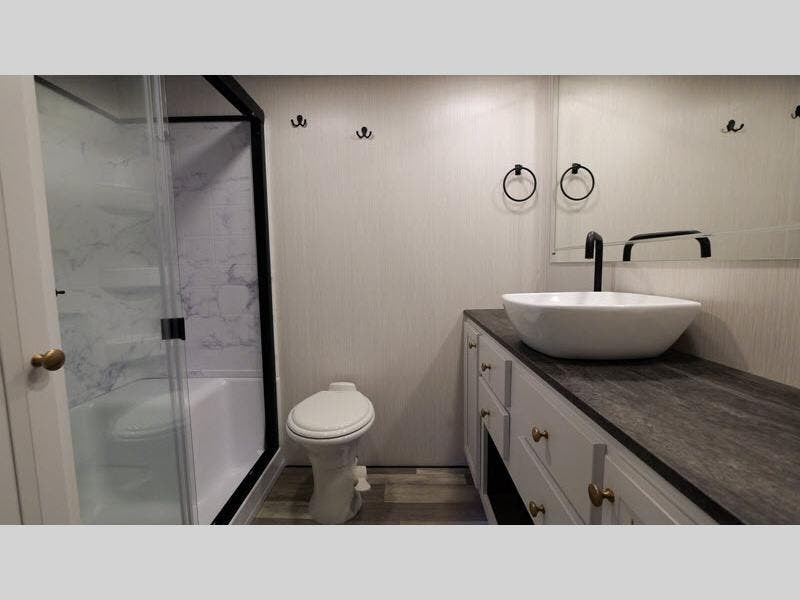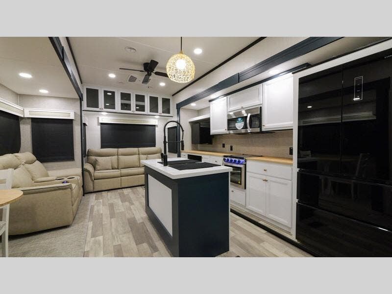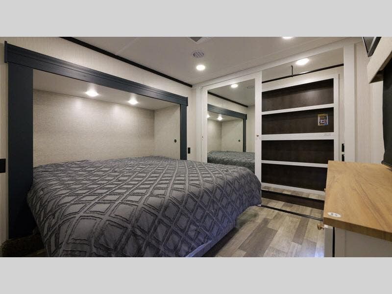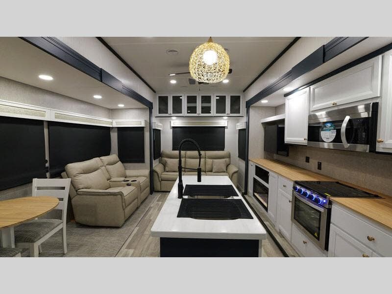 There's plenty of room to spread out and relax in this Cedar Creek Experience fifth wheel. A spacious living area includes a hide-a-bed sofa and dual power theater seats, so there's always a great angle to watch TV. Slides on either side give you a roomy feel, especially for the kitchen area. You'll appreciate cooking in this space with so many amenities, like a kitchen island with dual sinks, pantry, and overhead cabinets for even more storage. Later you can retire to the private front bedroom with its king bed which is located in the third slide for even more room to walk around. And there's additional storage here, with a dresser and a front wardrobe with shelves and washer/dryer prep. A linen closet in the bathroom provides a place for all your sheets and towels.