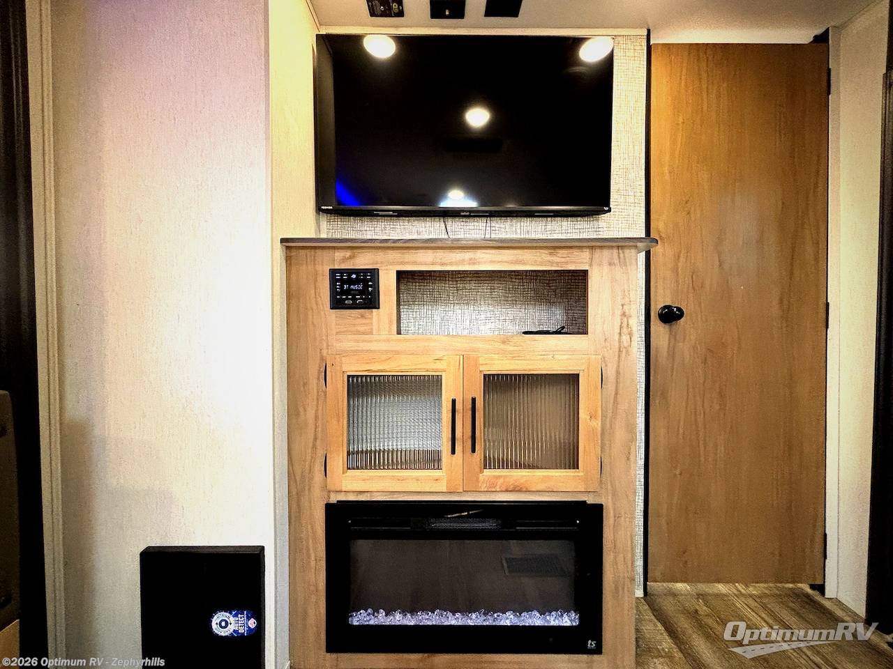 You won't believe all that is included with this travel trailer! Starting with the dual entry doors for a smooth flow of traffic to the outside storage areas, the outside TV mount, the outside kitchen, and the rear storage rack. The kiddos or guests can sleep on the set of double bunk beds with a ladder which are conveniently next to the rear corner bathroom that has a tub/shower and an entrance/exit door. The U-shaped dinette and sofa can also transform into extra sleeping spaces if needed. Lay your head at night on the walk around queen bed with wardrobes on either side, a TV mount area, and a linen closet for your clothes. There is even a fireplace below the TV mount at the entertainment center for a cozy evening indoors!