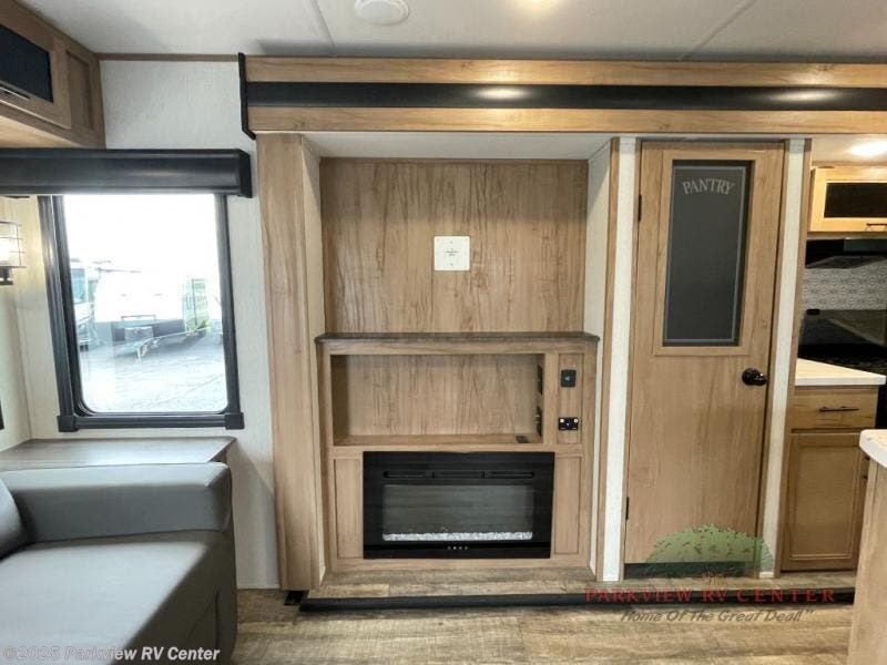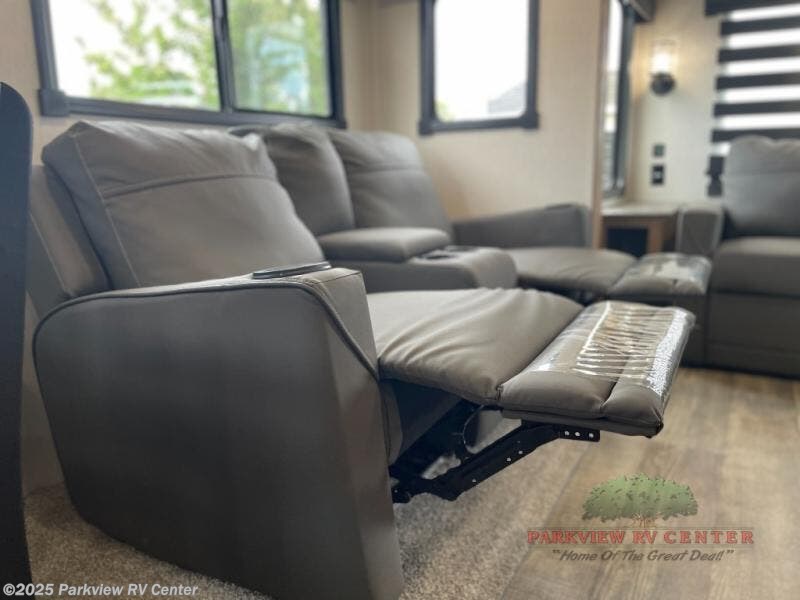 This trailer has it all for maximum comfort and convenience as well as entertainment! The rear living area includes a deluxe tri-fold hide-a-bed sofa with a rear window for great views of your campsite, and dual opposing slides widen this area so you can visit with friends. You'll also find theater seating with heat, light, and massage, plus a free-standing table with two fixed and two folding chairs. Enjoy the fireplace on a cool night or when you want a little ambiance while seated inside. The kitchen island will be handy for food prep and serving, and the unique coffee bar will be a favorite as well. Two patio awnings will provide an outdoor living area; just grab your camping chairs from the full pass-through storage. When you want to call it a night, fall quickly to sleep on the queen bed in the front bedroom with easy access to a dual entry bathroom which offers a radius shower with opaque glass doors.