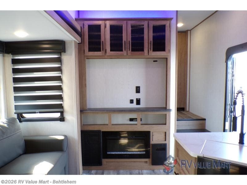 Get ready for an amazing adventure with this Cherokee Arctic Wolf fifth wheel! You can see all sorts of mountains, landscapes, scenery, and beaches, and you will still have a comfortable home to retreat to after seeing all of those sights. The bunkhouse is quite fun for your kids because it has a jackknife sofa that sits across from a storage area that has been prepped for a TV. There is also a slide for more space to have fun, a flip-up bunk above the sofa, and a bunk above the storage. Another amazing feature is the half bathroom that is right next to the bunkhouse, and this half bathroom also contains the second exterior entry door. This means you can come inside quickly to use the restroom while you are outside working on dinner at the outdoor kitchen with residential refrigerator. The living room has a fireplace to provide coziness, and there is a 50W solar panel to provide power while you are off-grid.