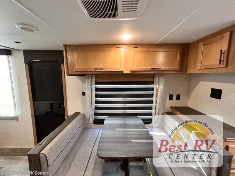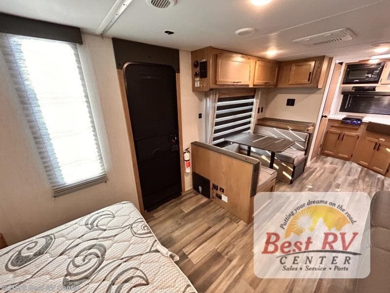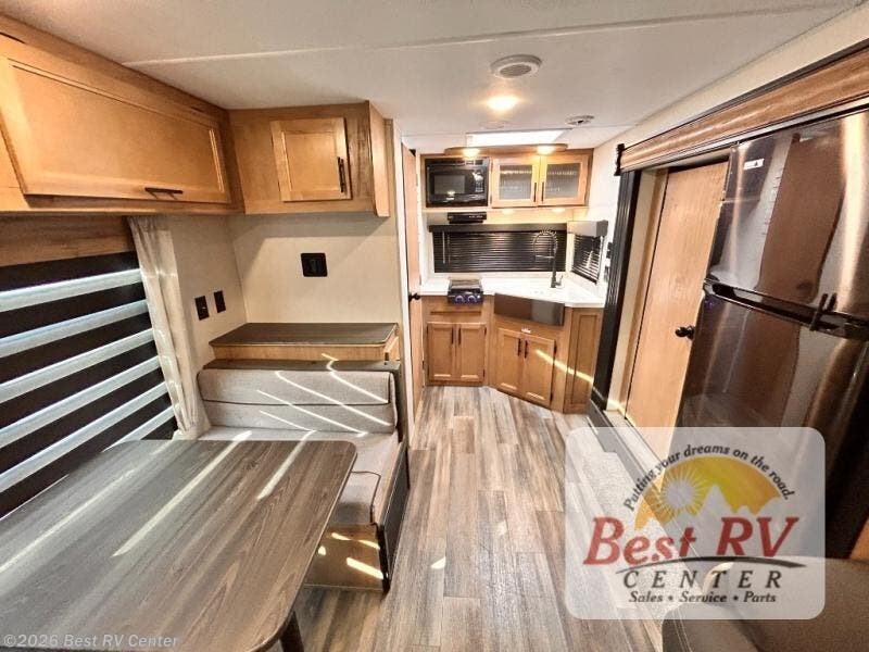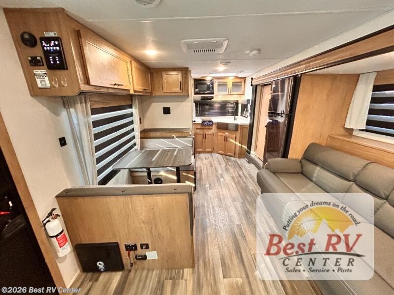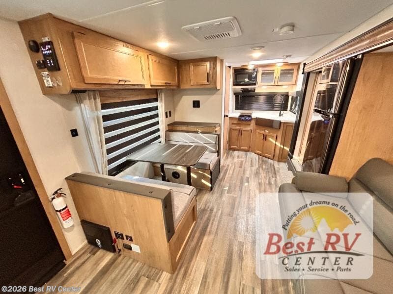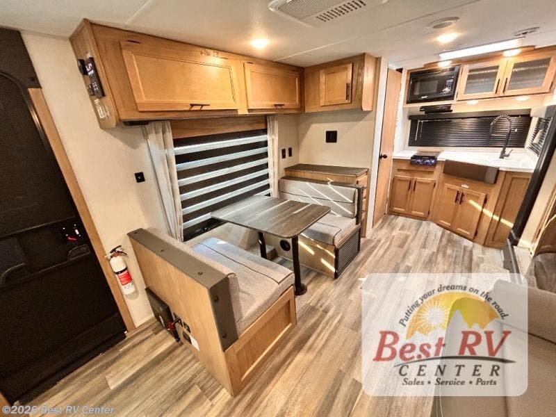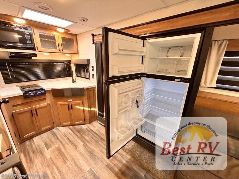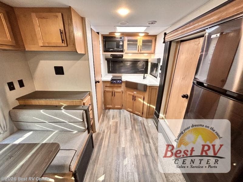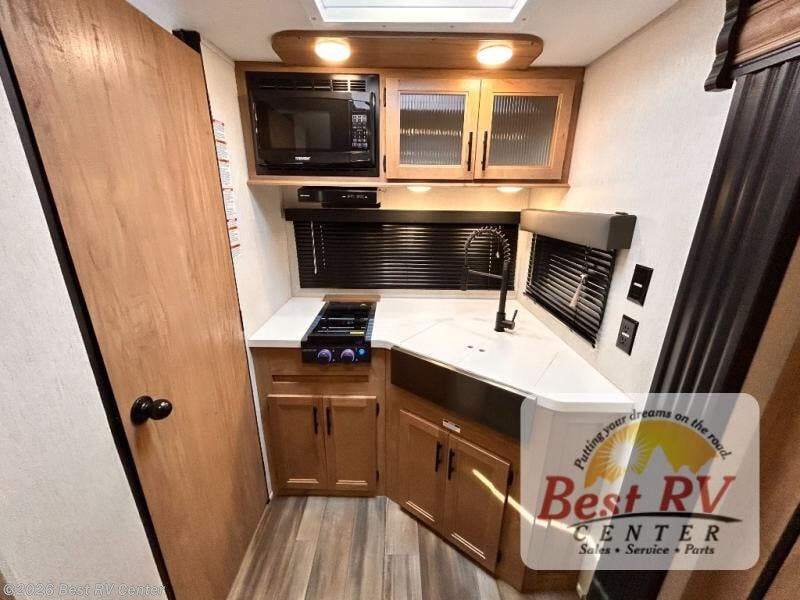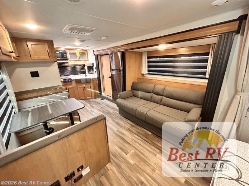 Make yourself at home in this Cherokee Grey Wolf Black Label travel trailer model which features a single slide for added interior space. The slide houses your sofa with upgraded fabric, an 11 cu. ft. 12 volt refrigerator, and pantry for tons of storage. You will find a two burner range top and microwave oven next to the farm style black stainless steel sink with upgraded faucet. In the rear corner bathroom, enjoy the added headroom and natural lighting that streams in each morning due to the skylight overhead in the shower. The upgraded showerhead is also a plus, as well as the on demand tankless water heater! You will enjoy the booth dinette and sofa for seating when inside, and when it's time to head to bed, a queen bed is a welcome retreat. The sofa and dinette can also be converted for children or an extra guest.