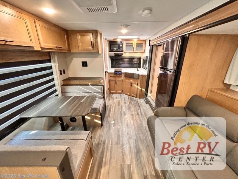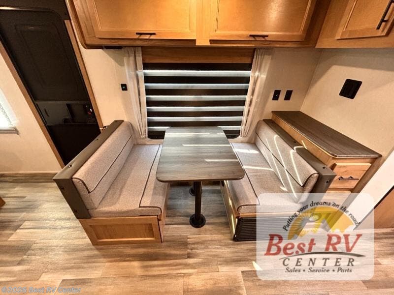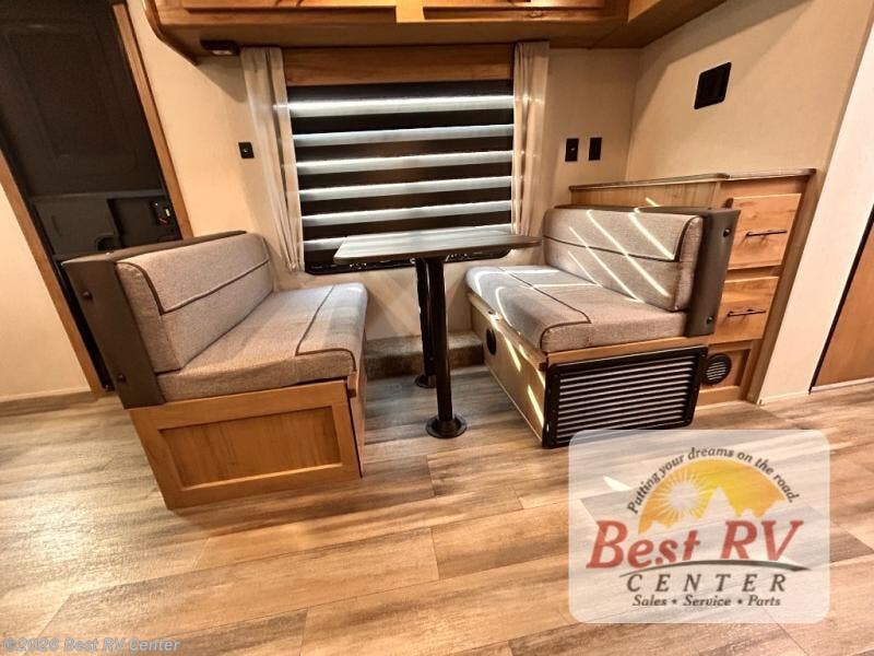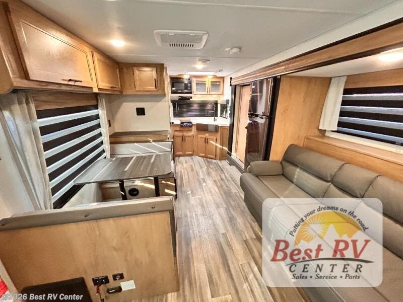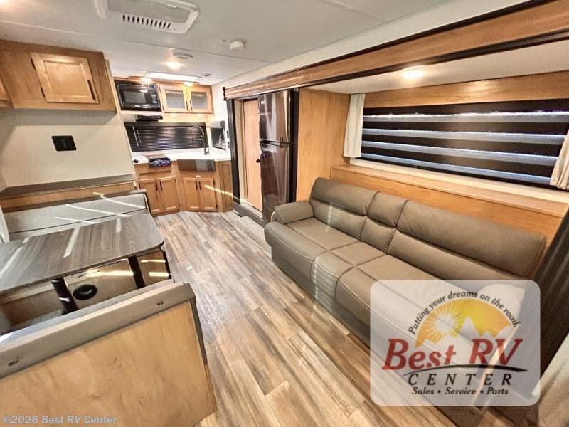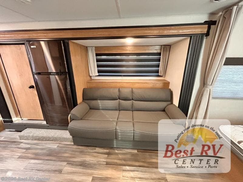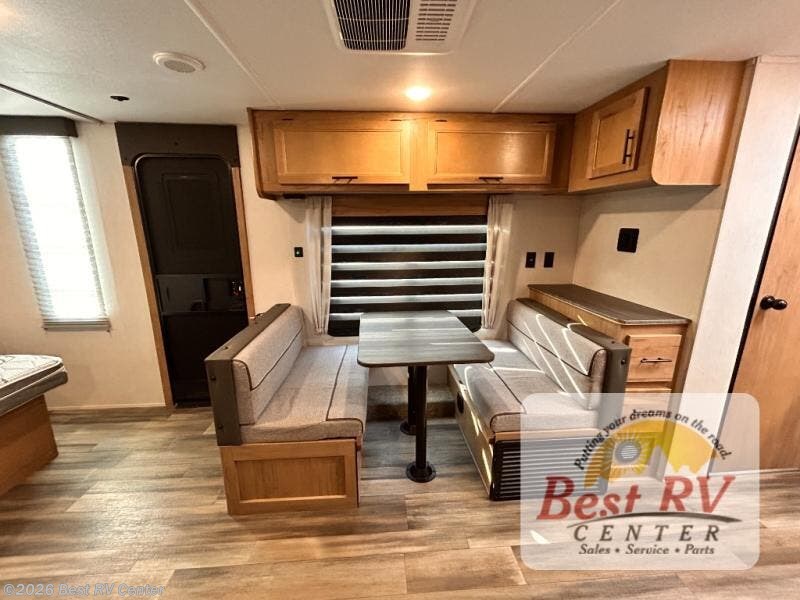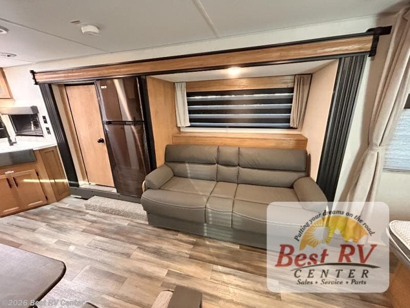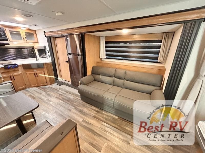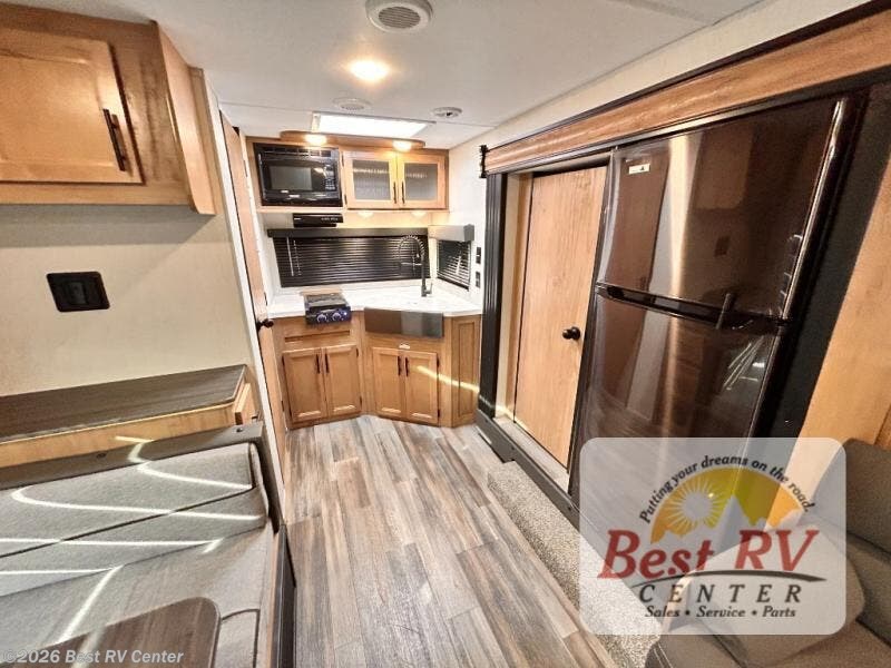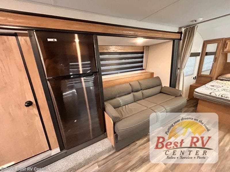 Make yourself at home in this Cherokee Grey Wolf Black Label travel trailer model which features a single slide for added interior space. The slide houses your sofa with upgraded fabric, an 11 cu. ft. 12 volt refrigerator, and pantry for tons of storage. You will find a two burner range top and microwave oven next to the farm style black stainless steel sink with upgraded faucet. In the rear corner bathroom, enjoy the added headroom and natural lighting that streams in each morning due to the skylight overhead in the shower. The upgraded showerhead is also a plus, as well as the on demand tankless water heater! You will enjoy the booth dinette and sofa for seating when inside, and when it's time to head to bed, a queen bed is a welcome retreat. The sofa and dinette can also be converted for children or an extra guest.