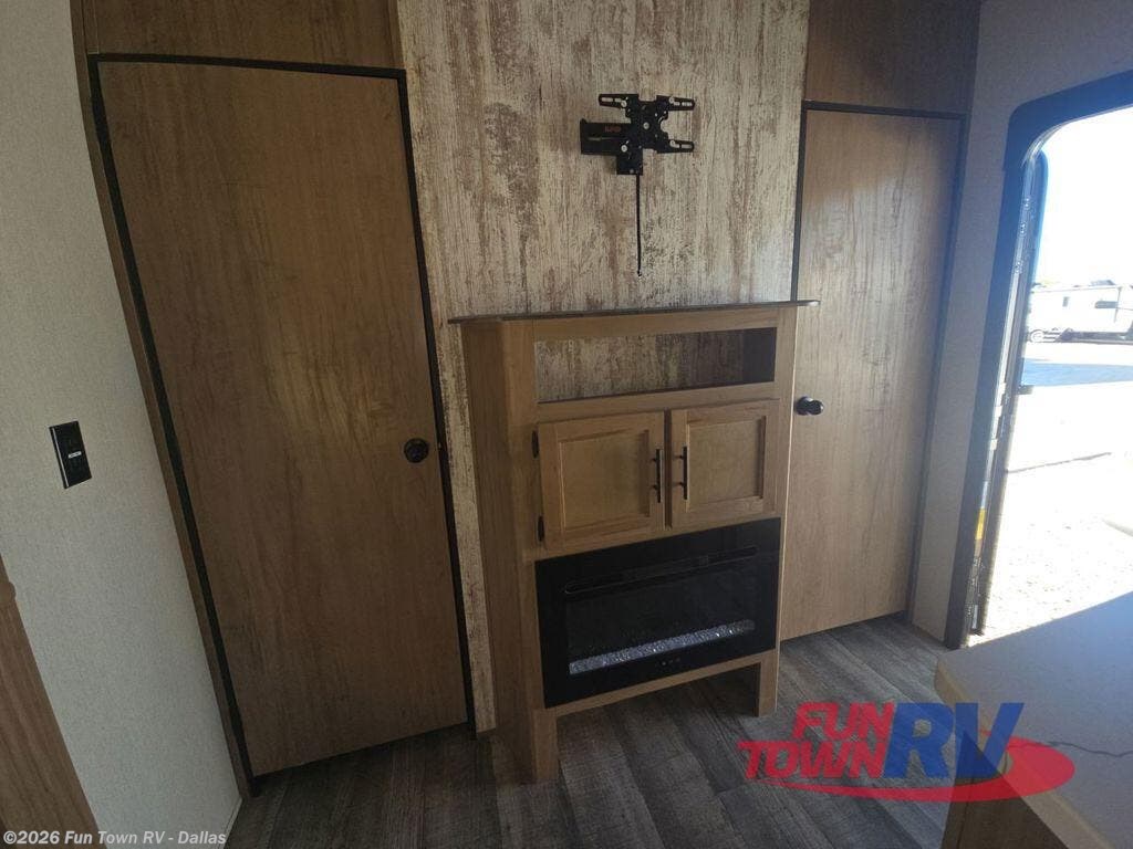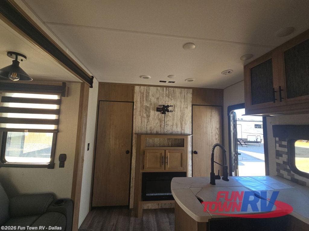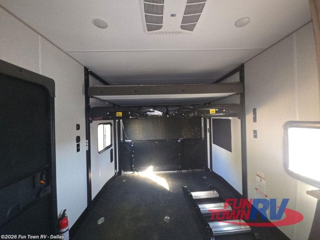 You are going to want this toy hauler for all of your adventures! It features a 12' garage area that has a folding dinette table with a Happijac bed lift system above it and one of the dual entry doors to the unit. The walk-through bathroom leads directly into the kitchen/living area. Here you will find a three burner cooktop to prepare your best meals, a U-shaped dinette to enjoy them at or you can switch it out for the optional party recliner sofa, and an entertainment center with a fireplace for a cozy evening indoors. Enjoy a good night's rest each night on the 67" x 74" Wolf Pack king bed with wardrobes on either side in the front private bedroom!
